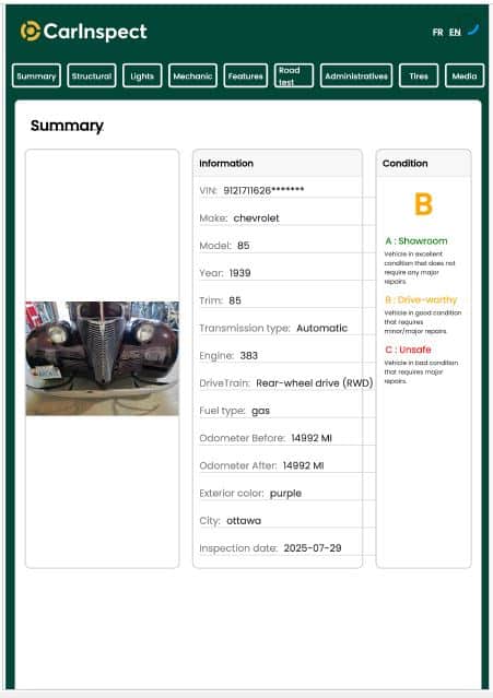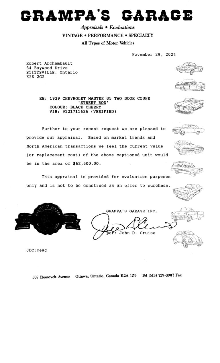 This restored 1939 Chevrolet Master 85 ‘Street Rod’ is offered by the seller with one key, a 2024 appraisal report, and an inspection report in Ottawa, ON.