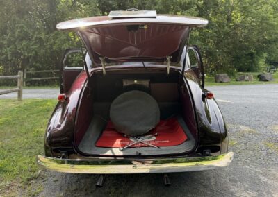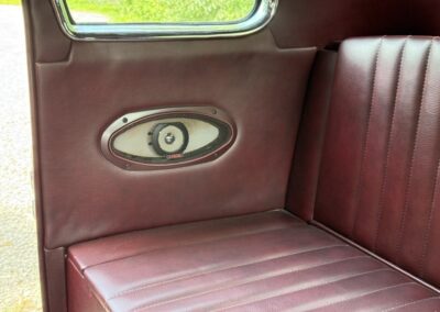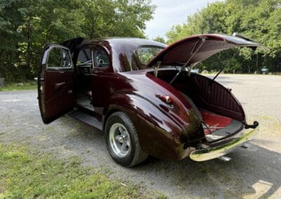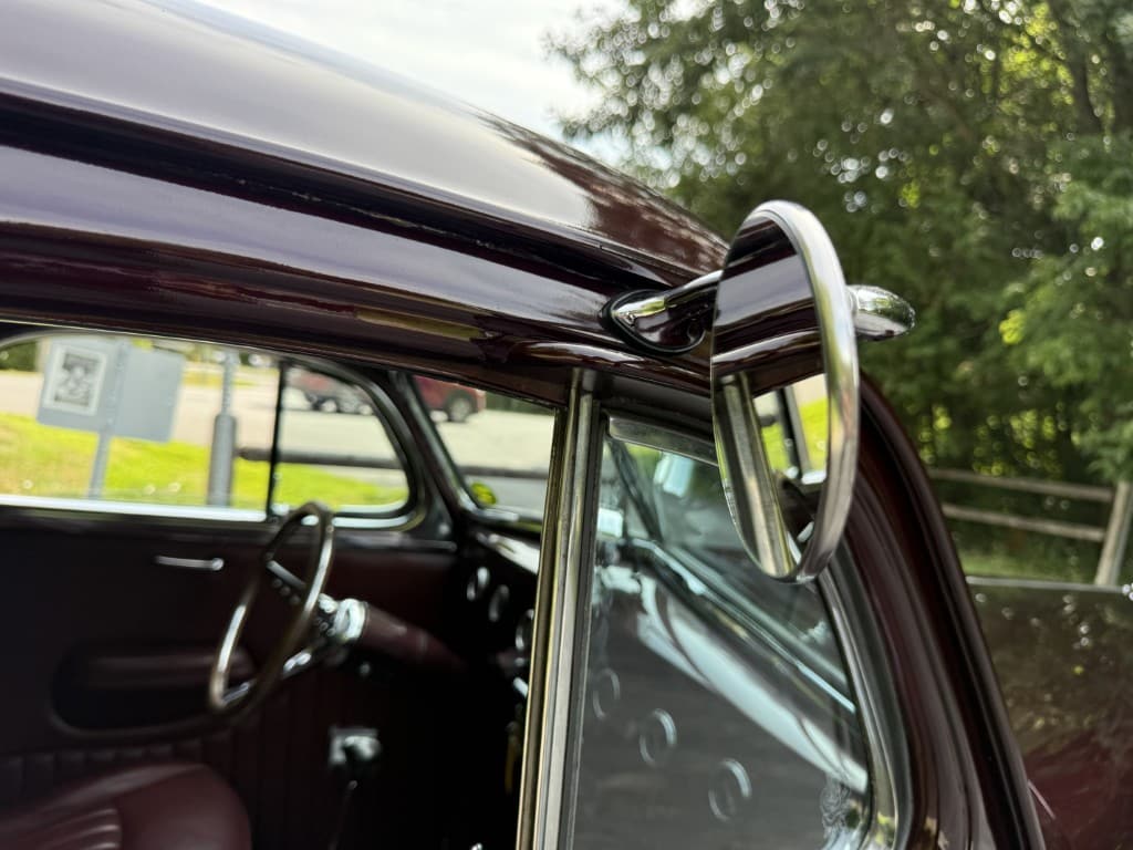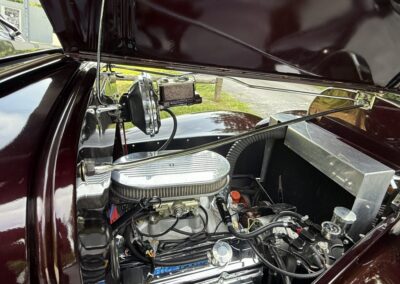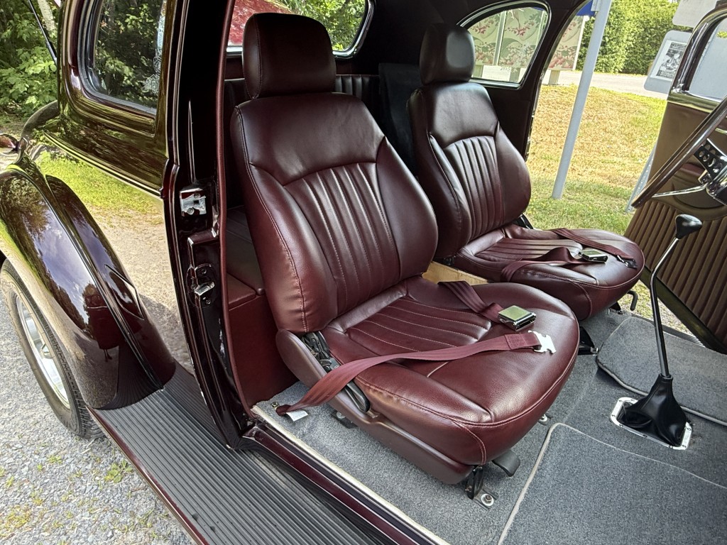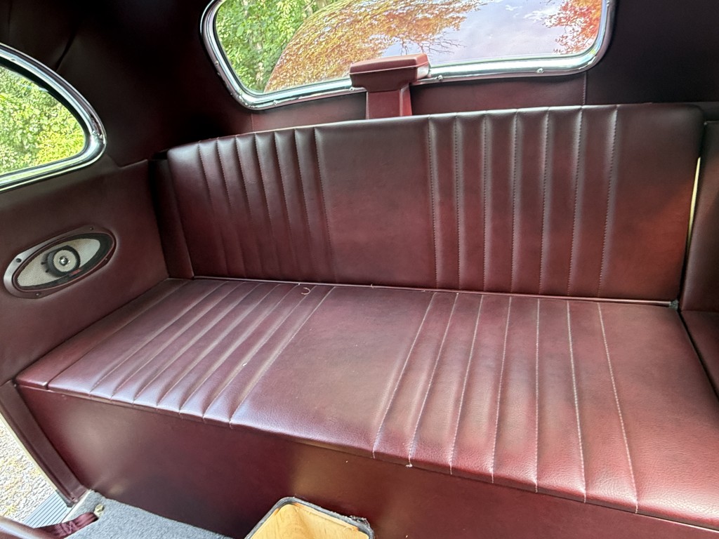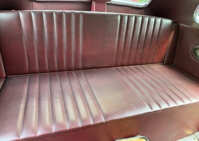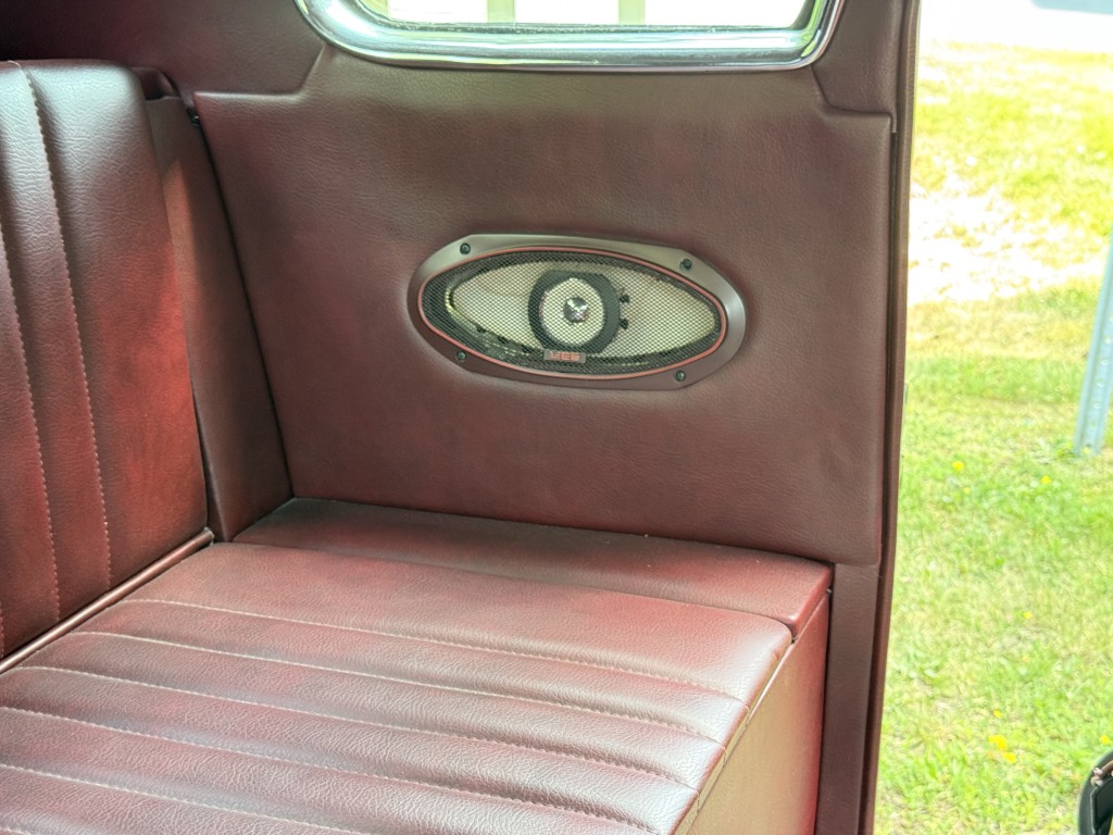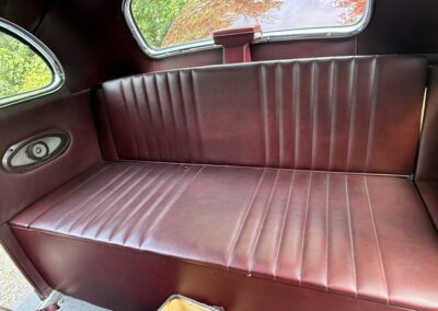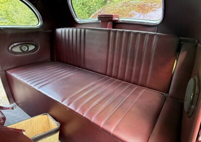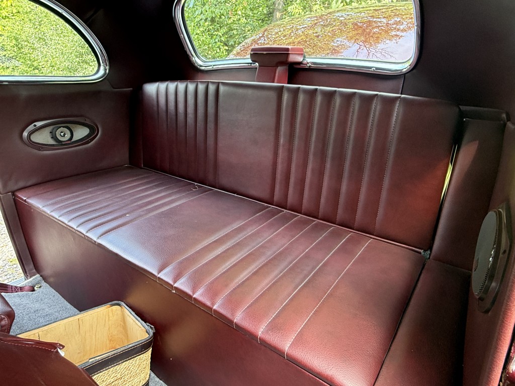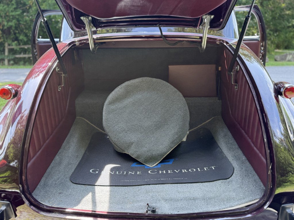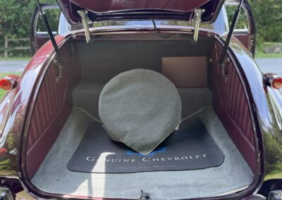 The interior of this 1939 Chevrolet Master 85 has been fully reupholstered with custom materials. The seats are finished in a burgundy colour that matches the overall aesthetic of the car, while the door cards, kick panels, and headliner have also been reupholstered in matching materials, and the window bezels are finished in chrome. The trunk has been fully upholstered with custom materials, complementing the rest of the car’s interior design; a custom wooden cover has been installed over the battery housed within.