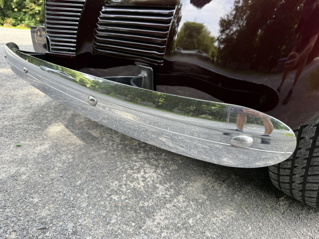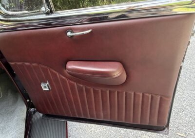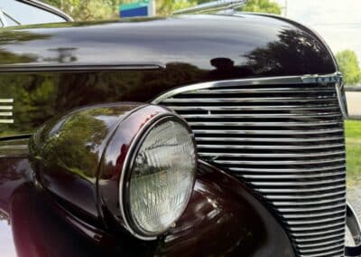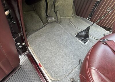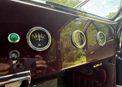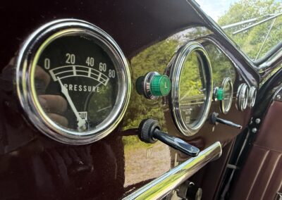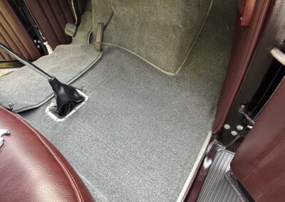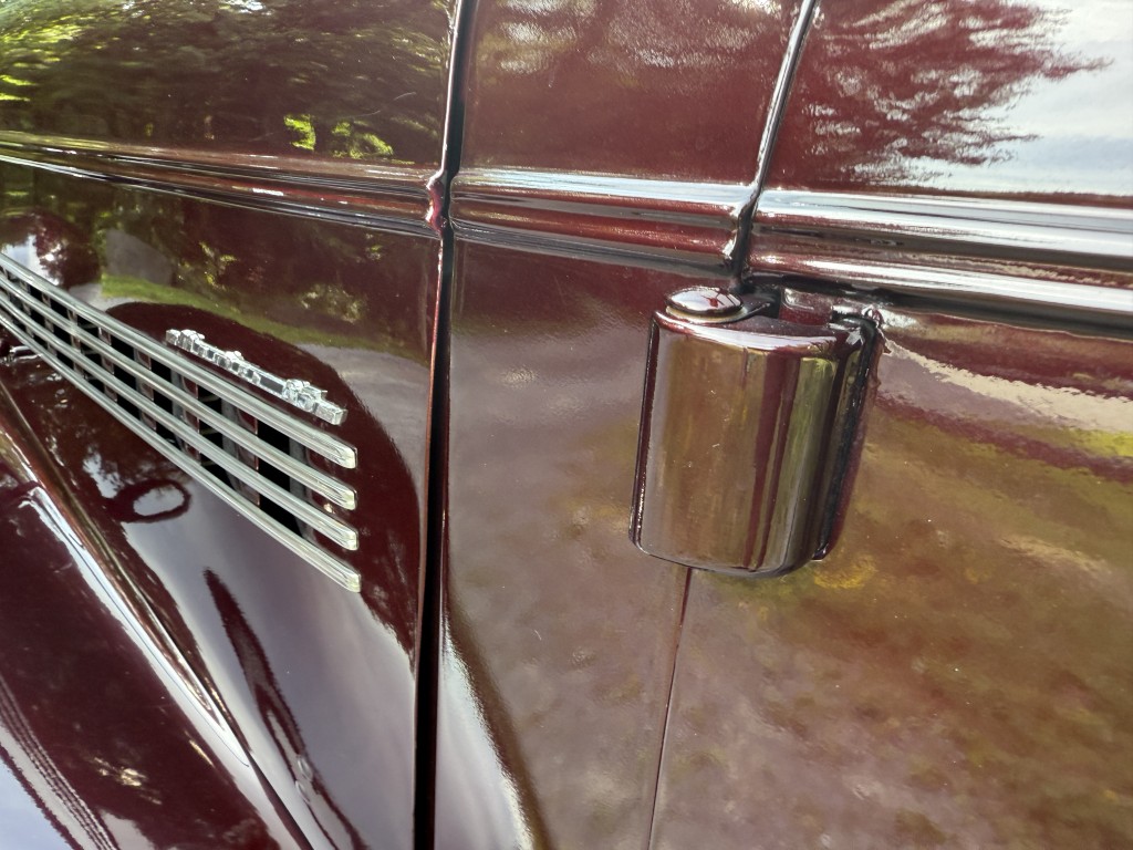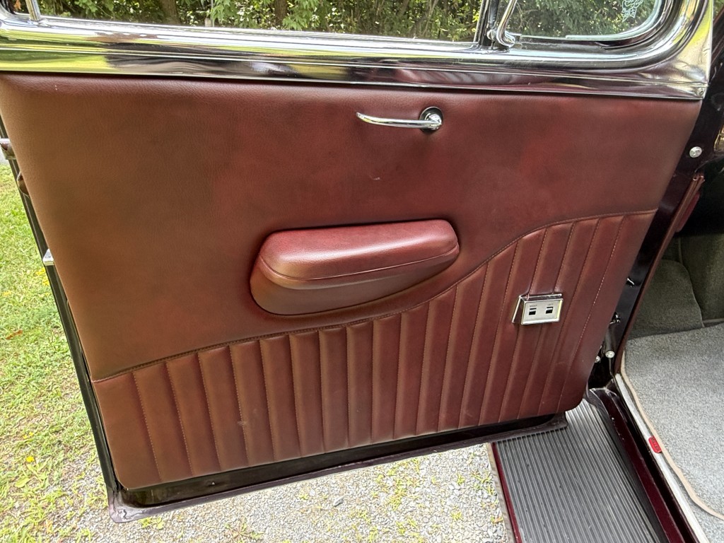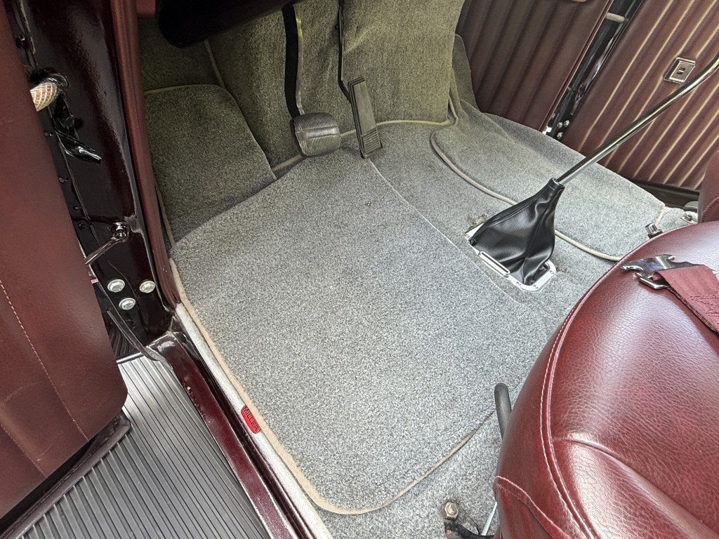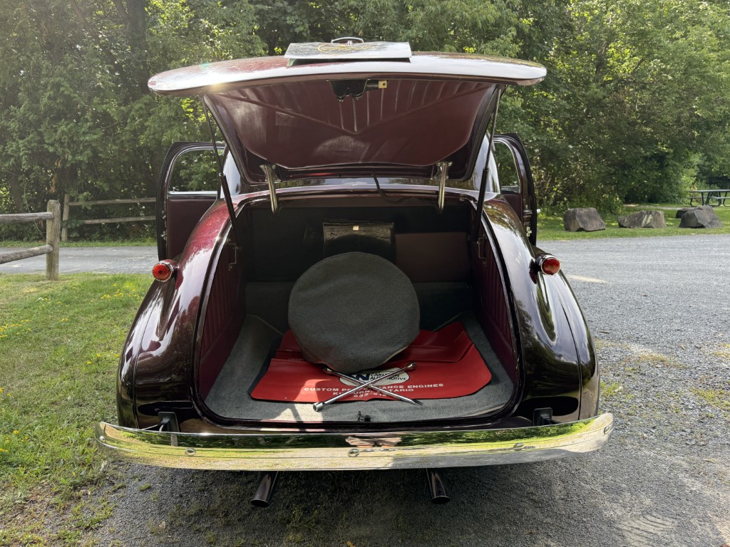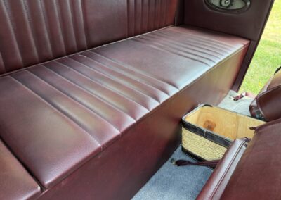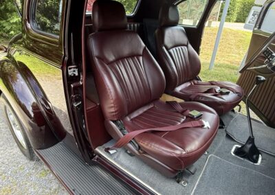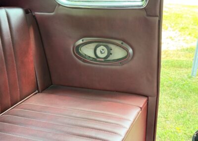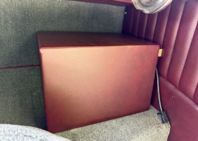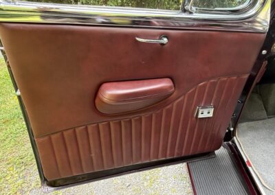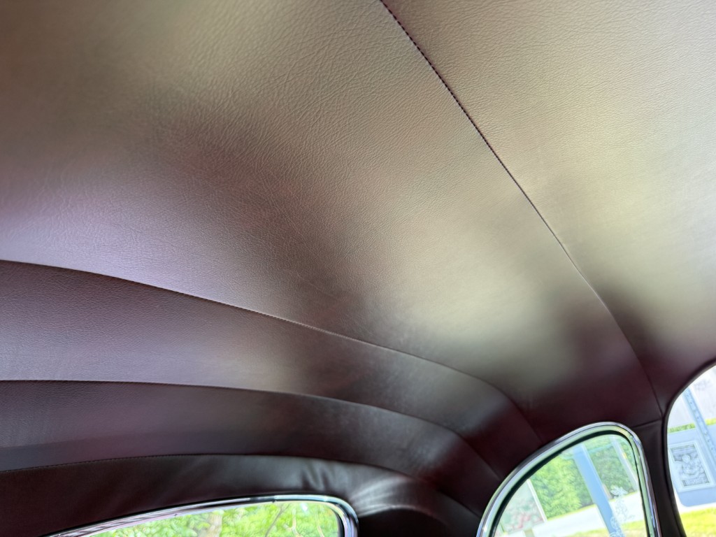 The interior of this 1939 Chevrolet Master 85 has been fully reupholstered with custom materials. The seats are finished in a burgundy colour that matches the overall aesthetic of the car, while the door cards, kick panels, and headliner have also been reupholstered in matching materials, and the window bezels are finished in chrome. The trunk has been fully upholstered with custom materials, complementing the rest of the car’s interior design; a custom wooden cover has been installed over the battery housed within.