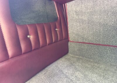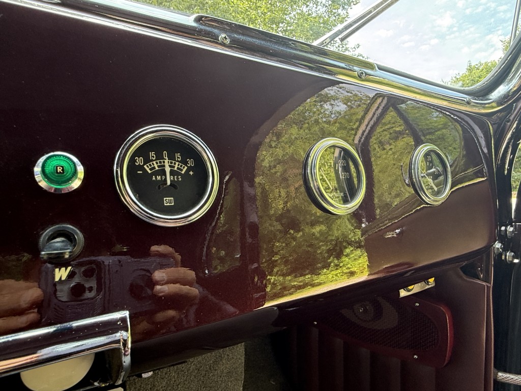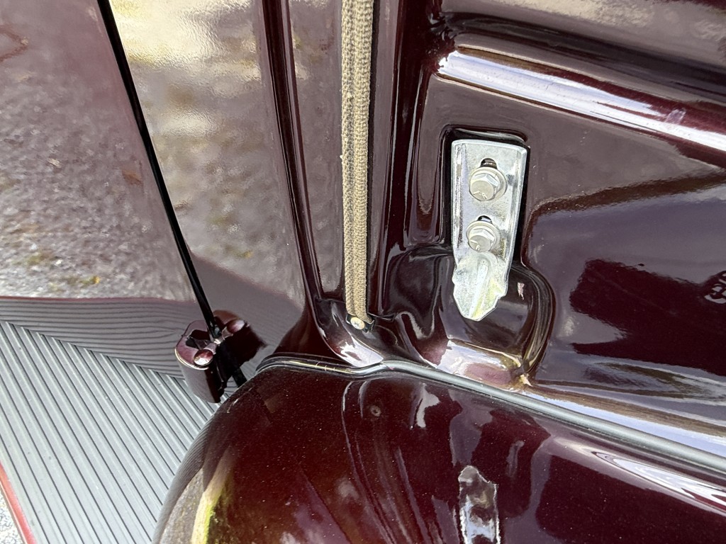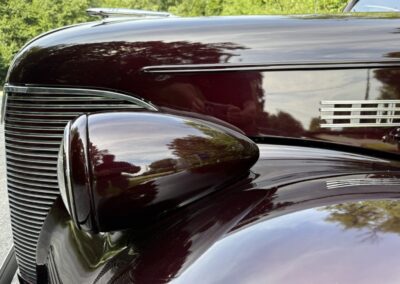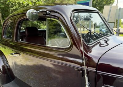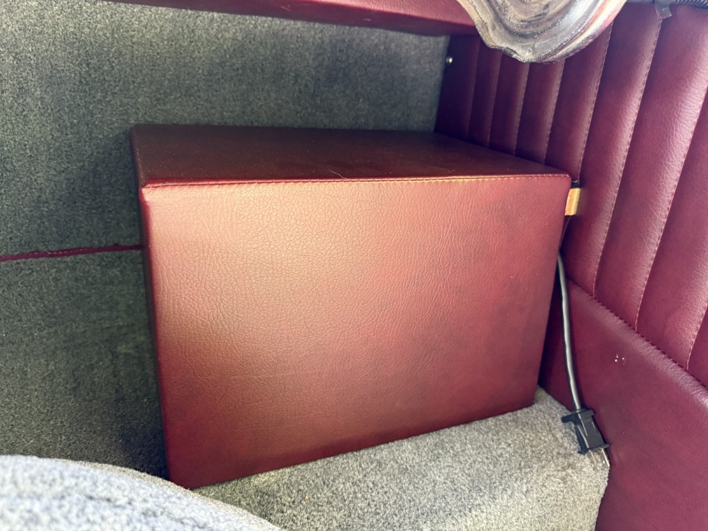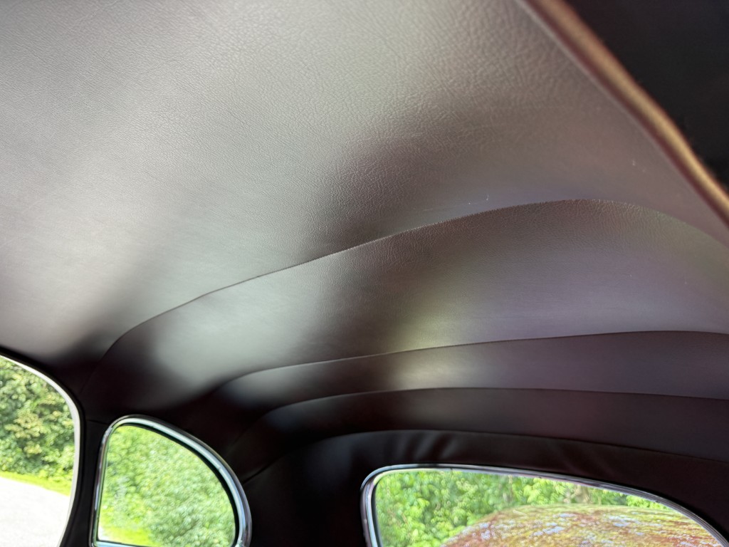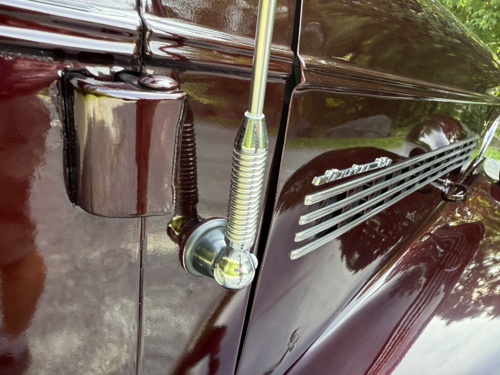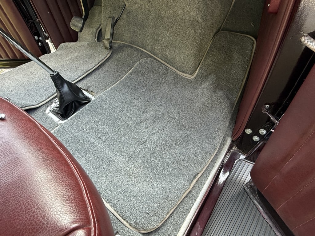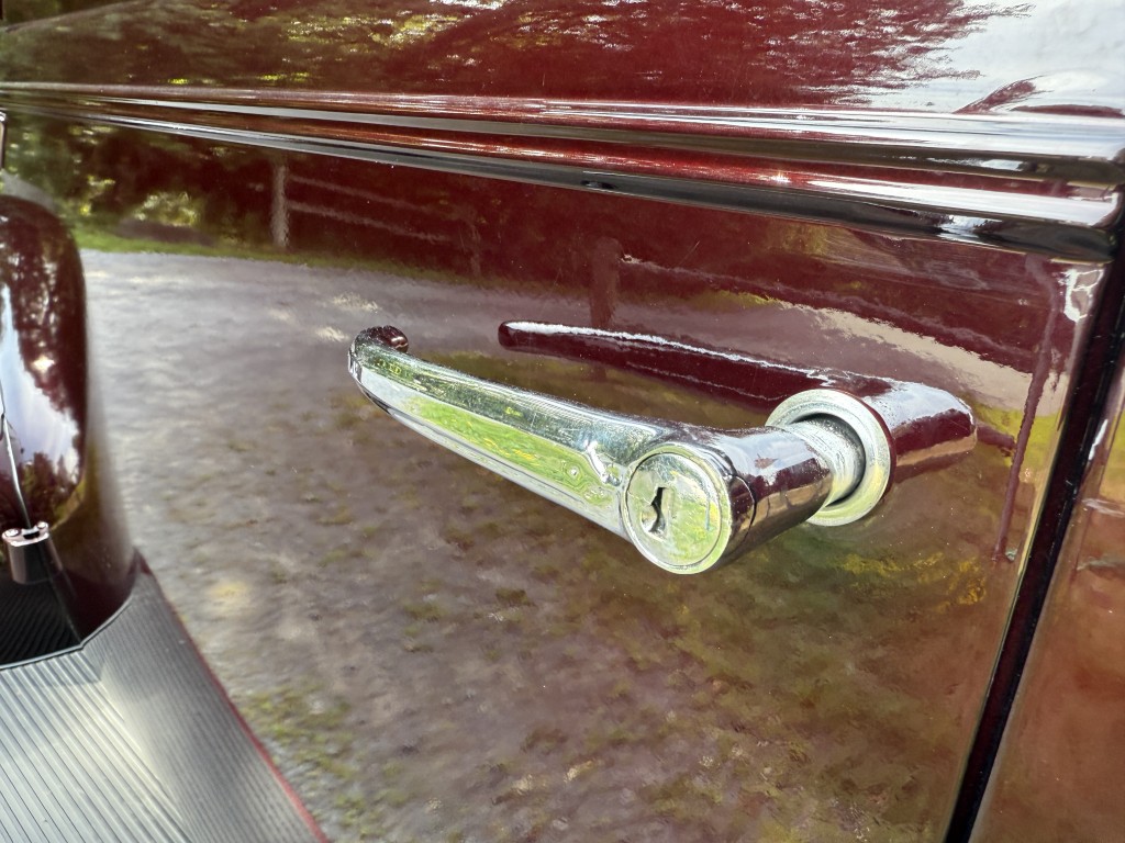 The interior of this 1939 Chevrolet Master 85 has been fully reupholstered with custom materials. The seats are finished in a burgundy colour that matches the overall aesthetic of the car, while the door cards, kick panels, and headliner have also been reupholstered in matching materials, and the window bezels are finished in chrome. The trunk has been fully upholstered with custom materials, complementing the rest of the car’s interior design; a custom wooden cover has been installed over the battery housed within.