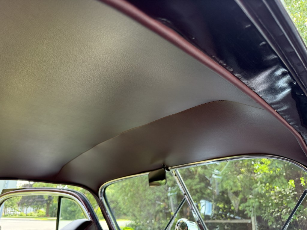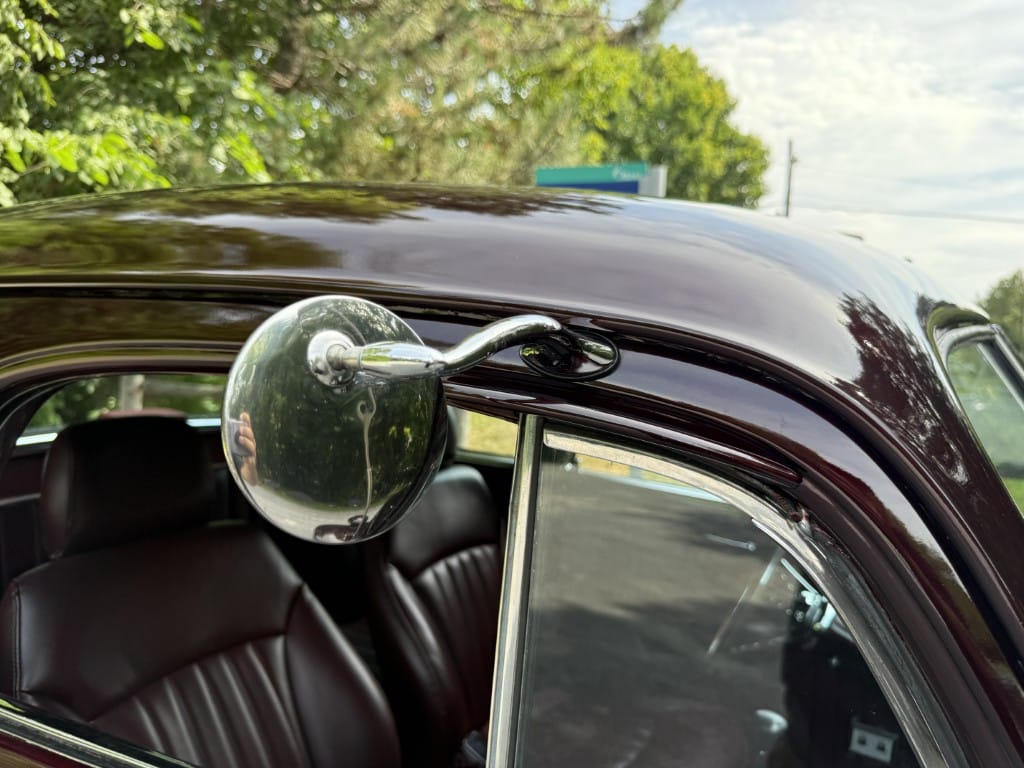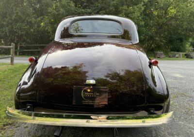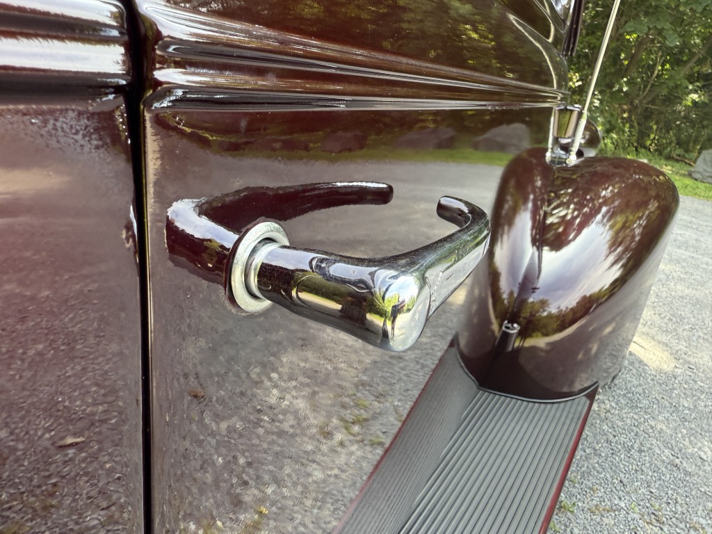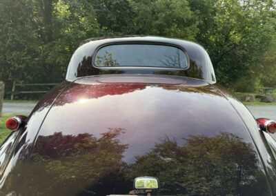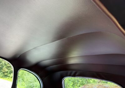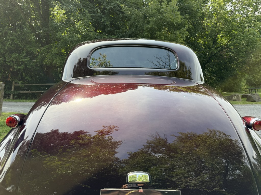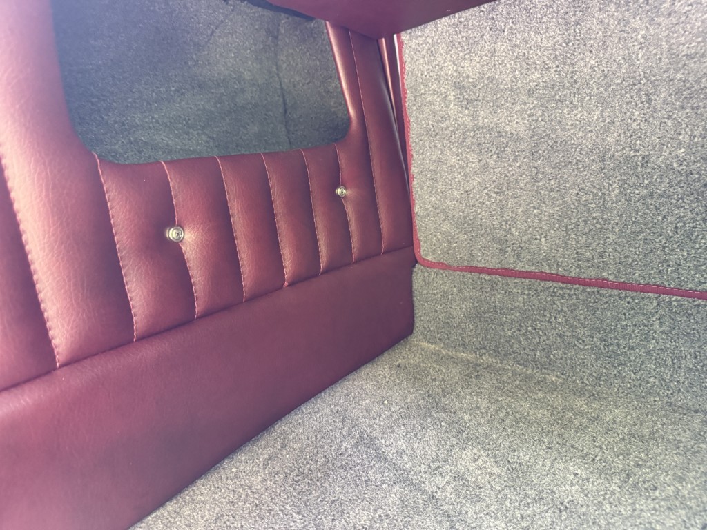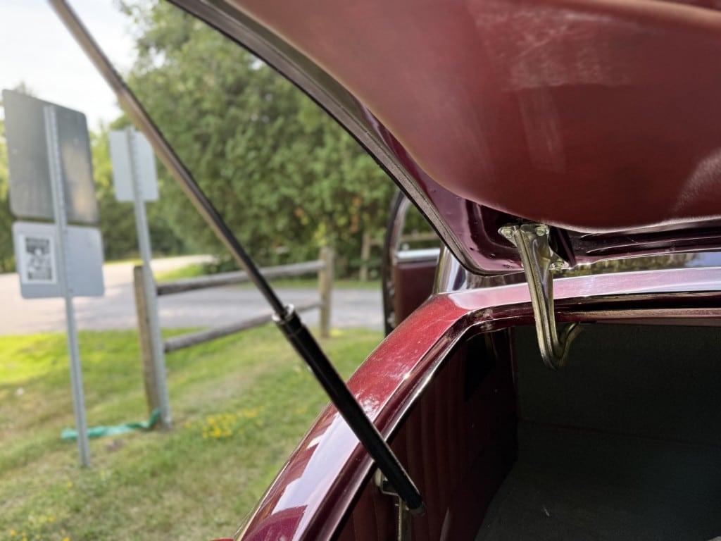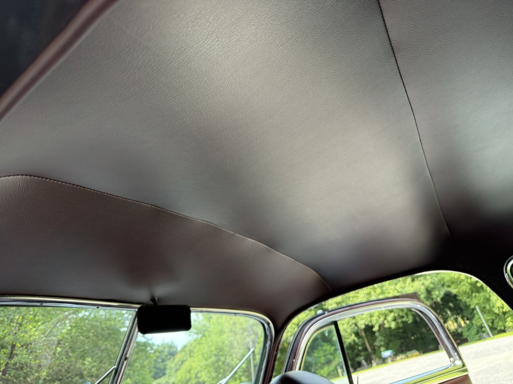 The interior of this 1939 Chevrolet Master 85 has been fully reupholstered with custom materials. The seats are finished in a burgundy colour that matches the overall aesthetic of the car, while the door cards, kick panels, and headliner have also been reupholstered in matching materials, and the window bezels are finished in chrome. The trunk has been fully upholstered with custom materials, complementing the rest of the car’s interior design; a custom wooden cover has been installed over the battery housed within.