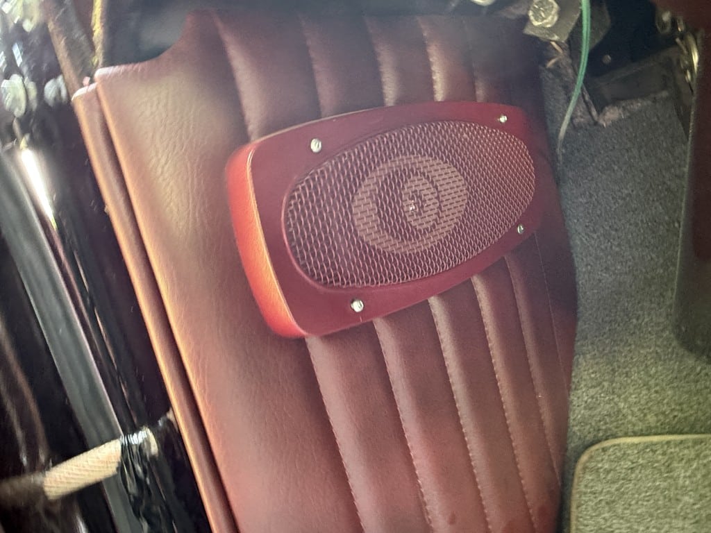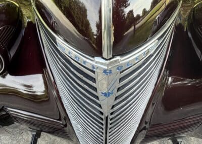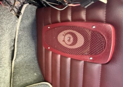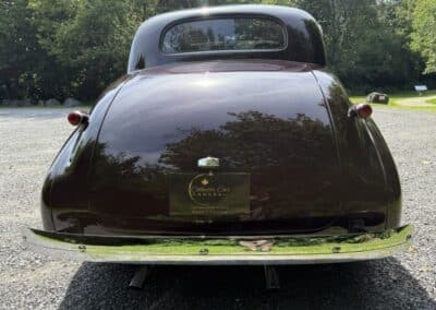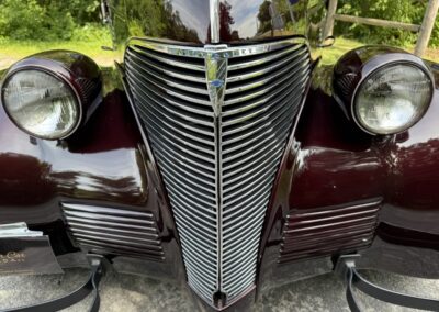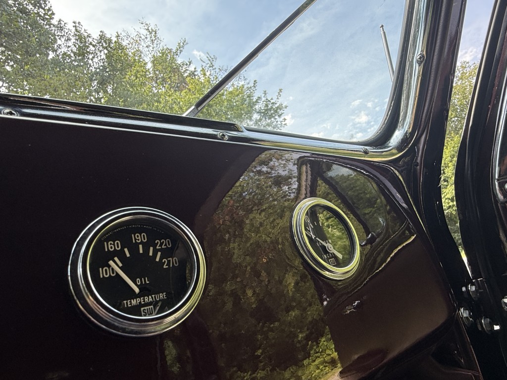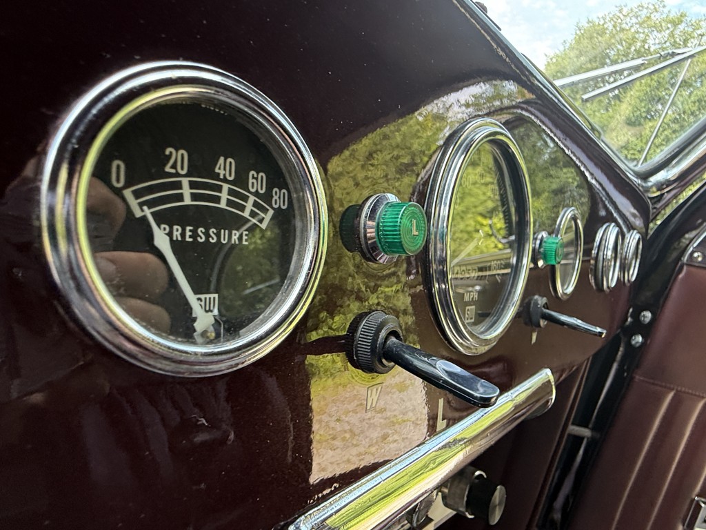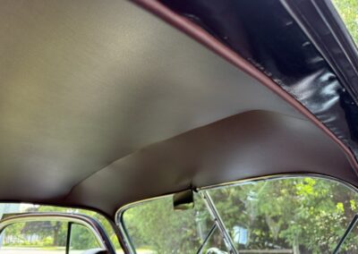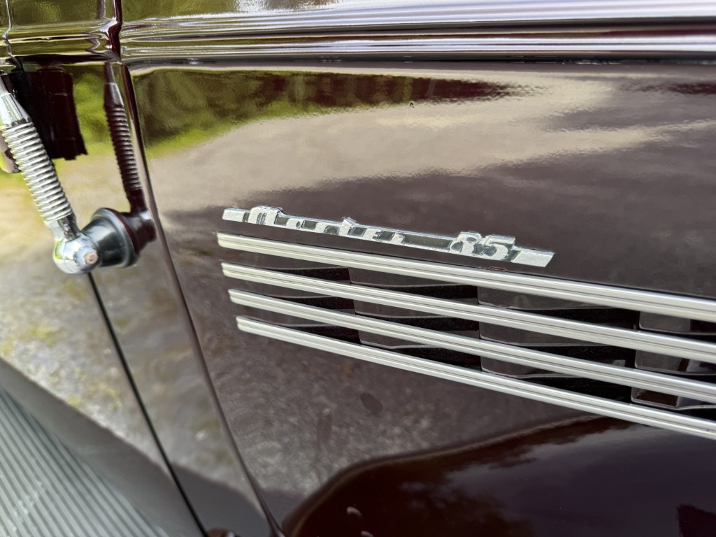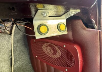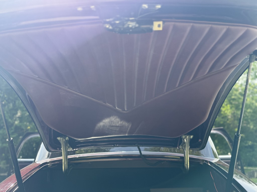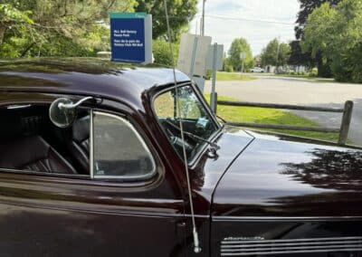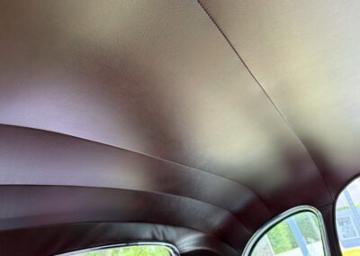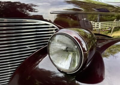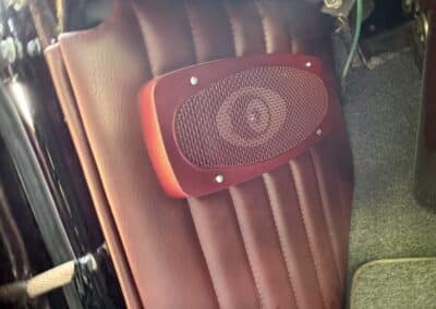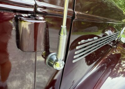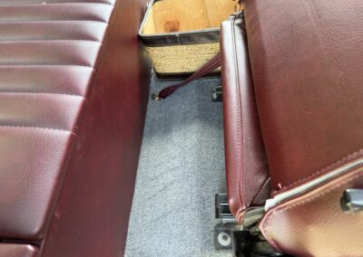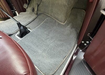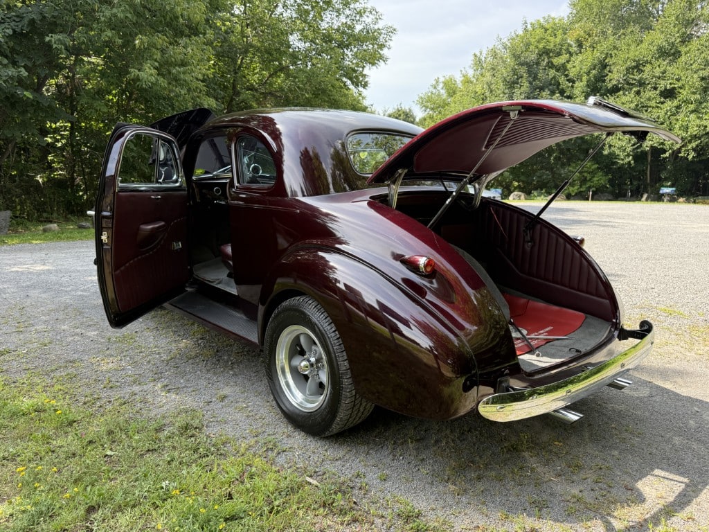 The interior of this 1939 Chevrolet Master 85 has been fully reupholstered with custom materials. The seats are finished in a burgundy colour that matches the overall aesthetic of the car, while the door cards, kick panels, and headliner have also been reupholstered in matching materials, and the window bezels are finished in chrome. The trunk has been fully upholstered with custom materials, complementing the rest of the car’s interior design; a custom wooden cover has been installed over the battery housed within.
