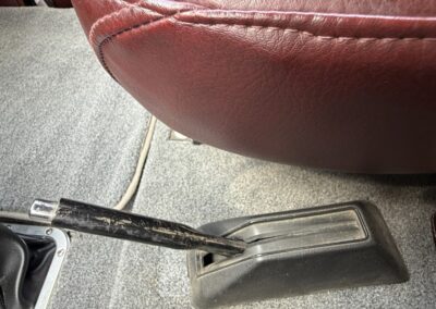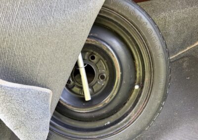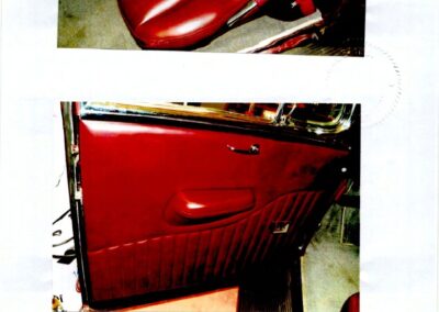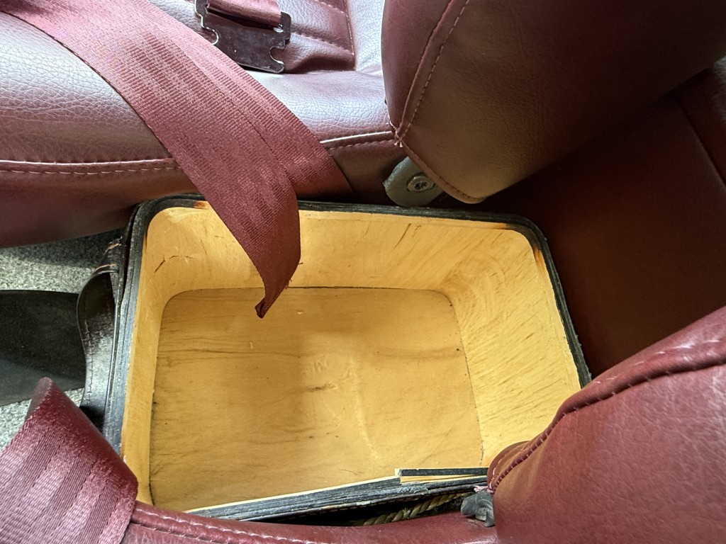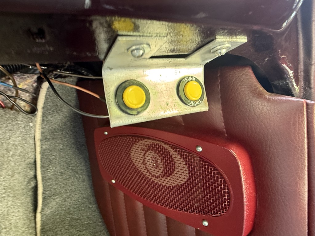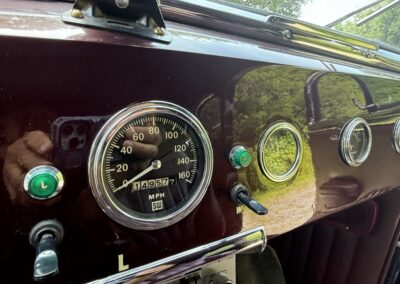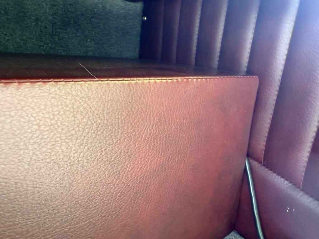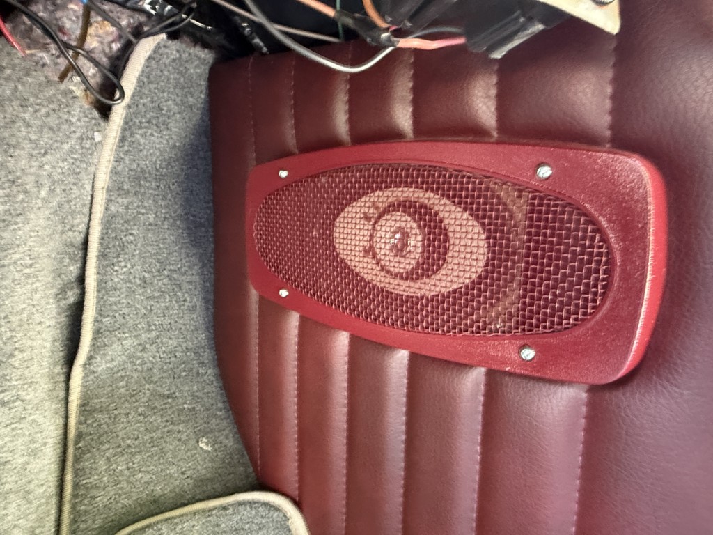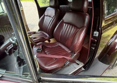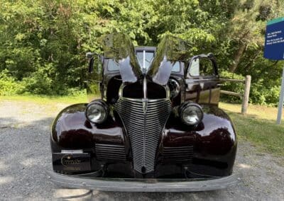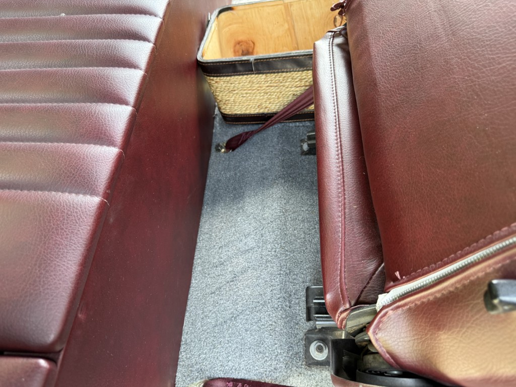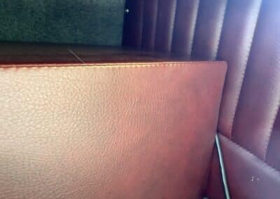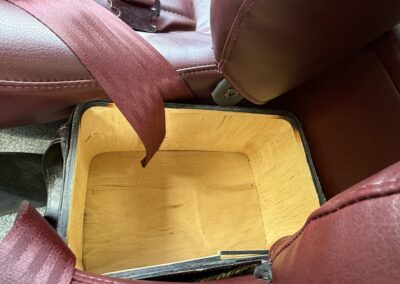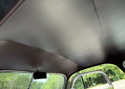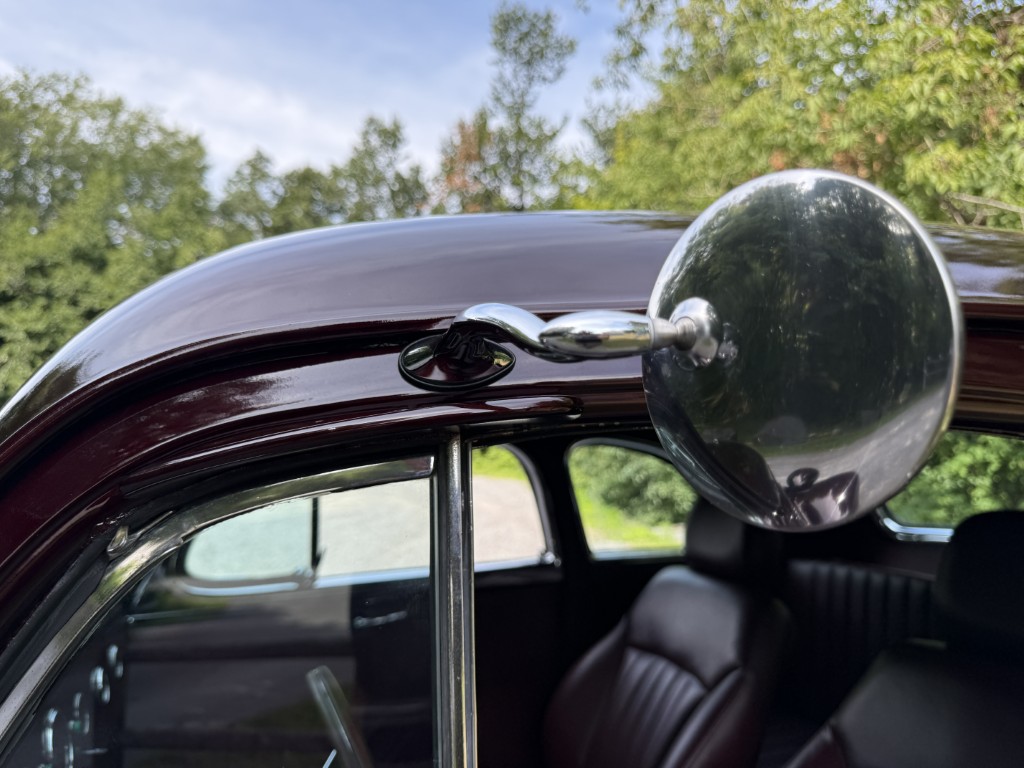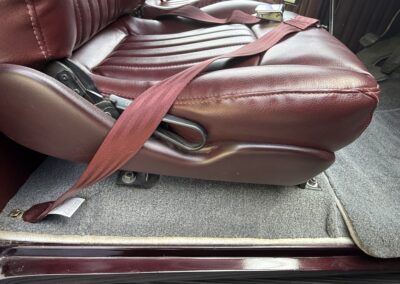 The interior of this 1939 Chevrolet Master 85 has been fully reupholstered with custom materials. The seats are finished in a burgundy colour that matches the overall aesthetic of the car, while the door cards, kick panels, and headliner have also been reupholstered in matching materials, and the window bezels are finished in chrome. The trunk has been fully upholstered with custom materials, complementing the rest of the car’s interior design; a custom wooden cover has been installed over the battery housed within.