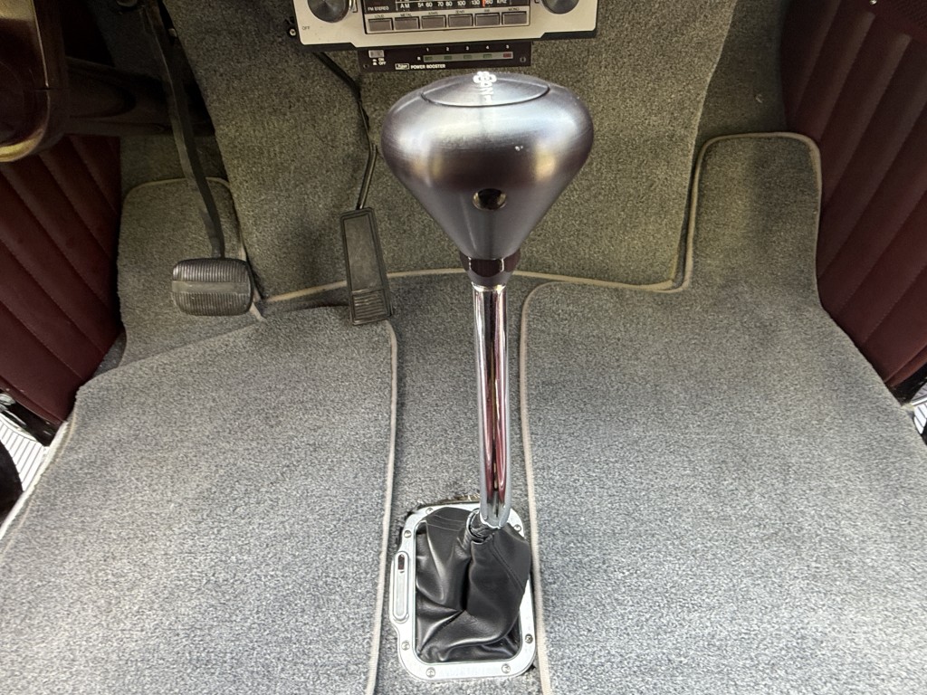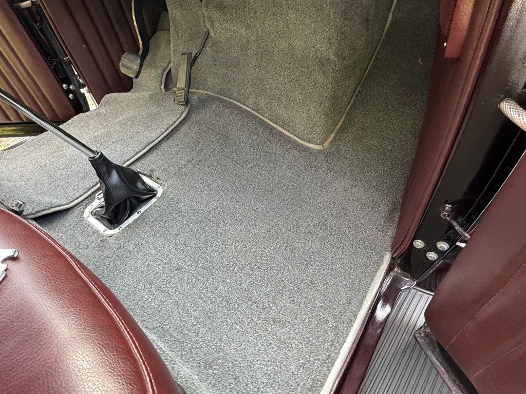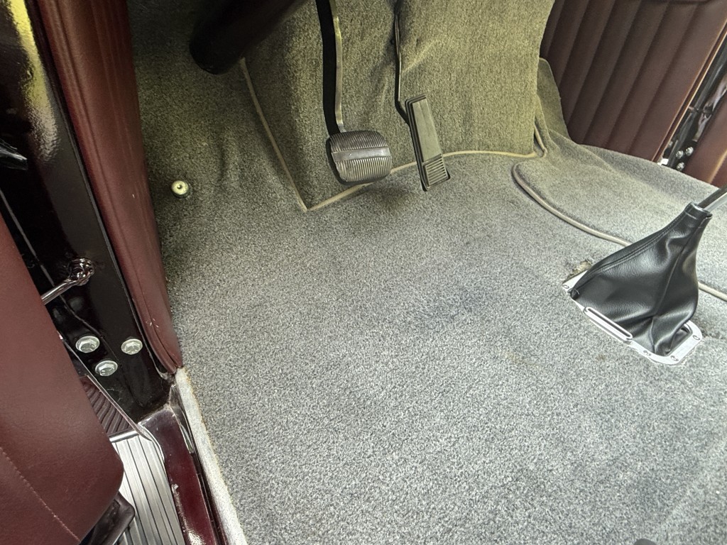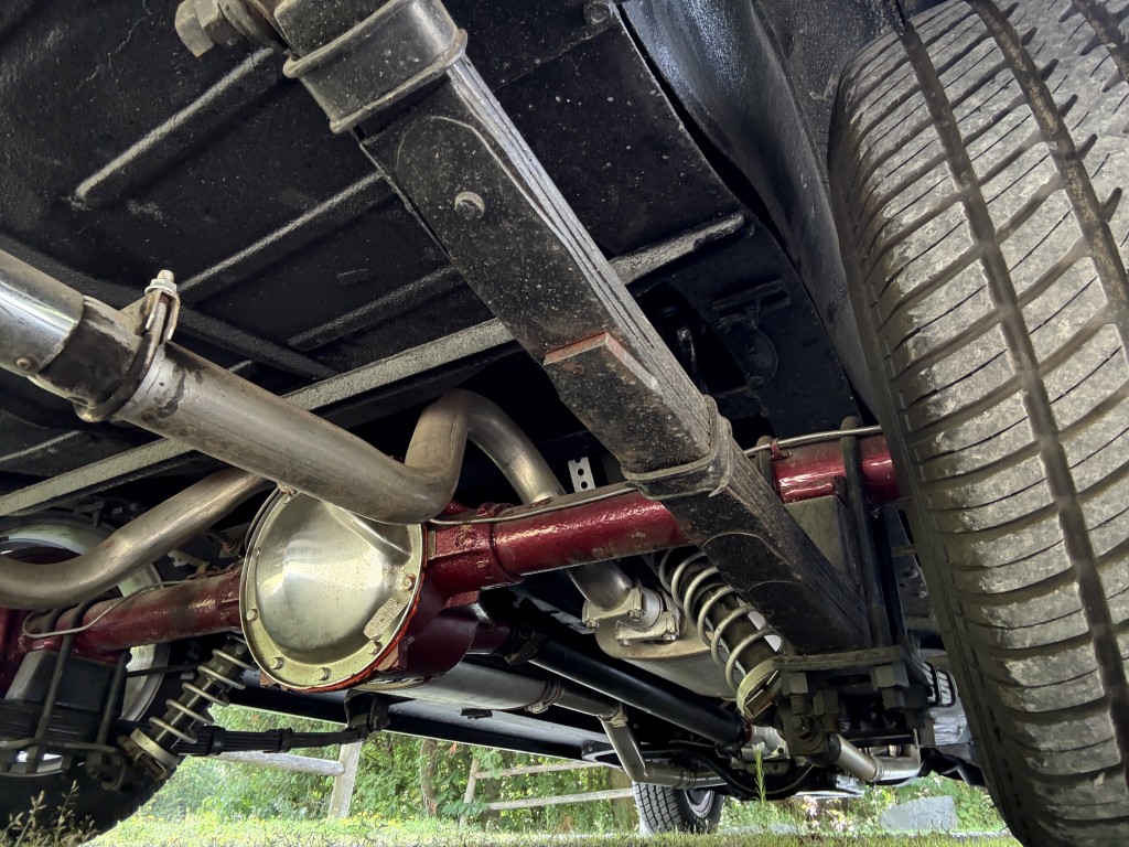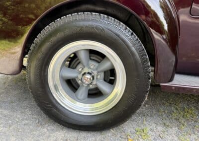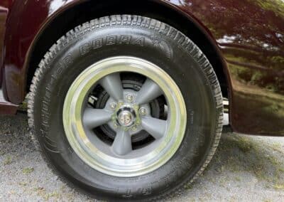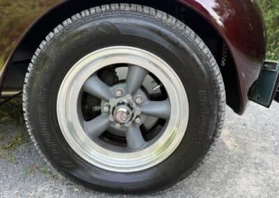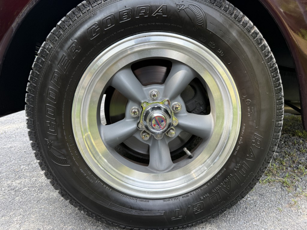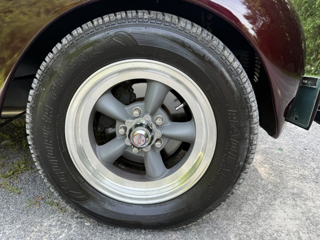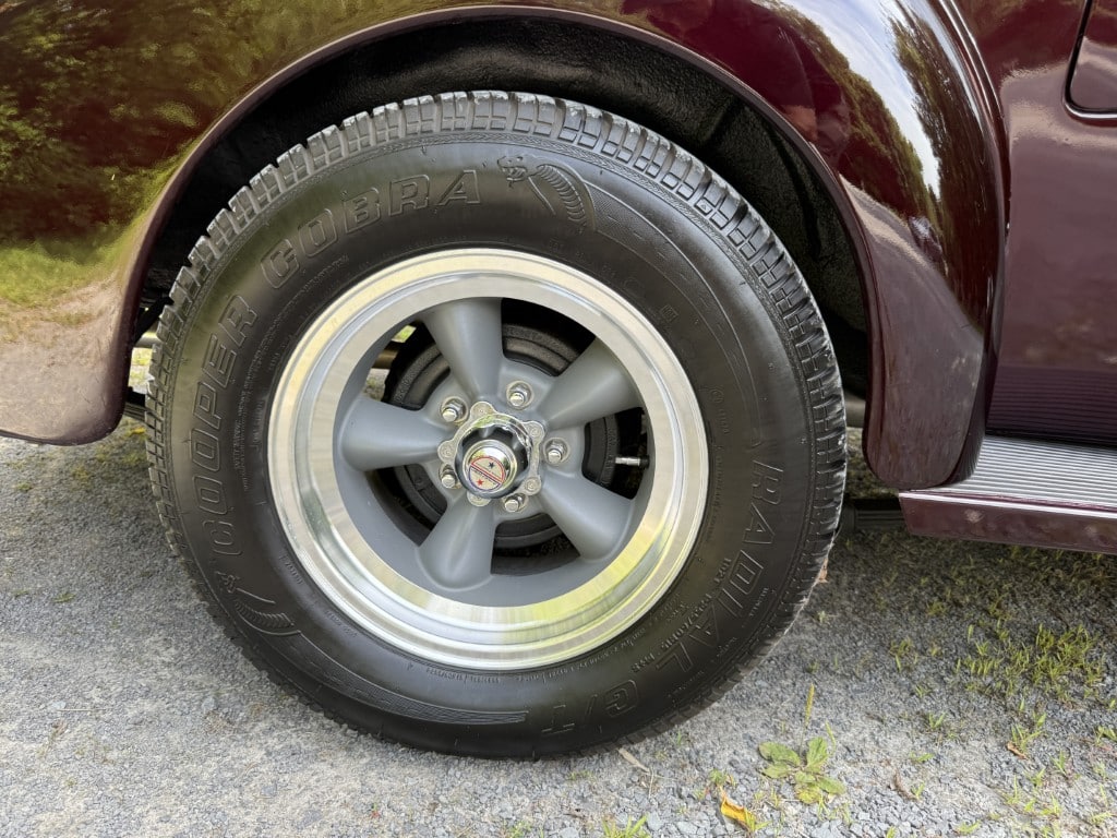 The car is fitted with a set of American Racing Torque Thrust-style forged aluminum wheels which were machined with a polished outer rim and chrome center accents. The staggered Cooper Cobra Radial GT tires feature 215/65R15’s at the front and 255/60R15’s at the rear. These tires are in near-new condition, having covered fewer than 500 miles since installation. The suspension system has been updated to include a modern front coil spring setup and a rebuilt rear suspension system with parallel leaf springs. The car is equipped with power steering, a tilt steering column and power brakes, discs up front and drums under the wider rear wheels.