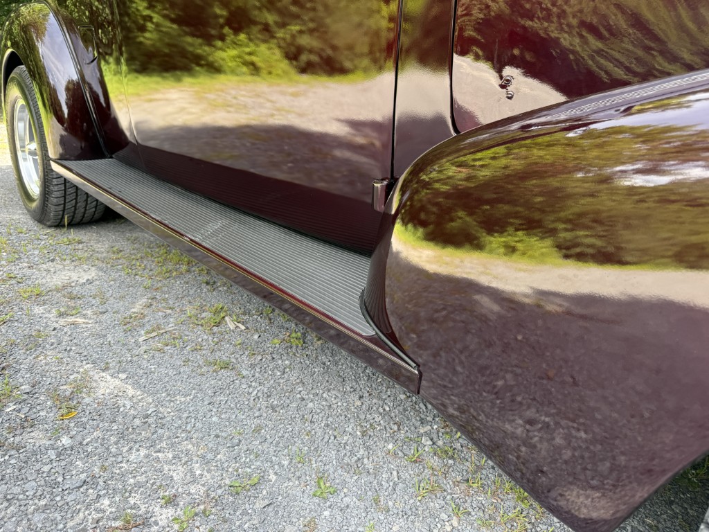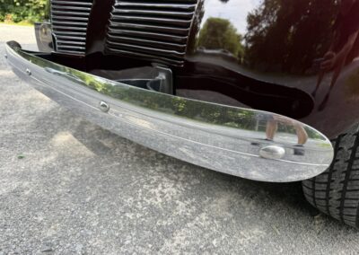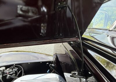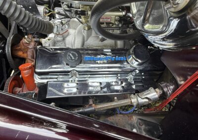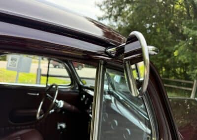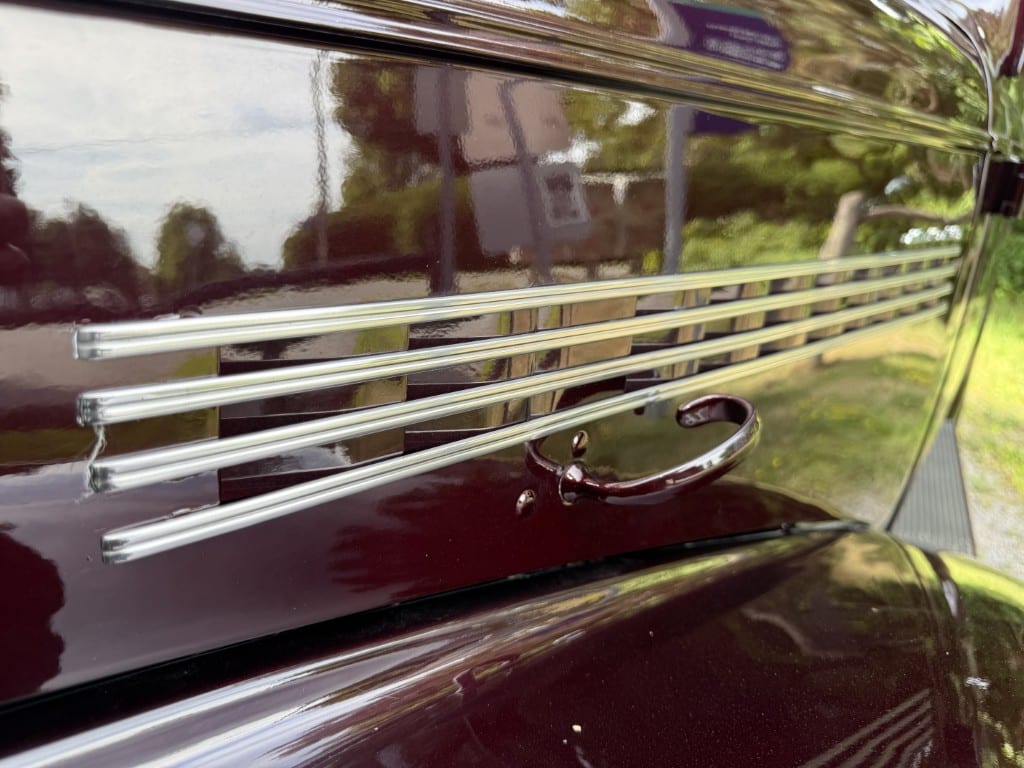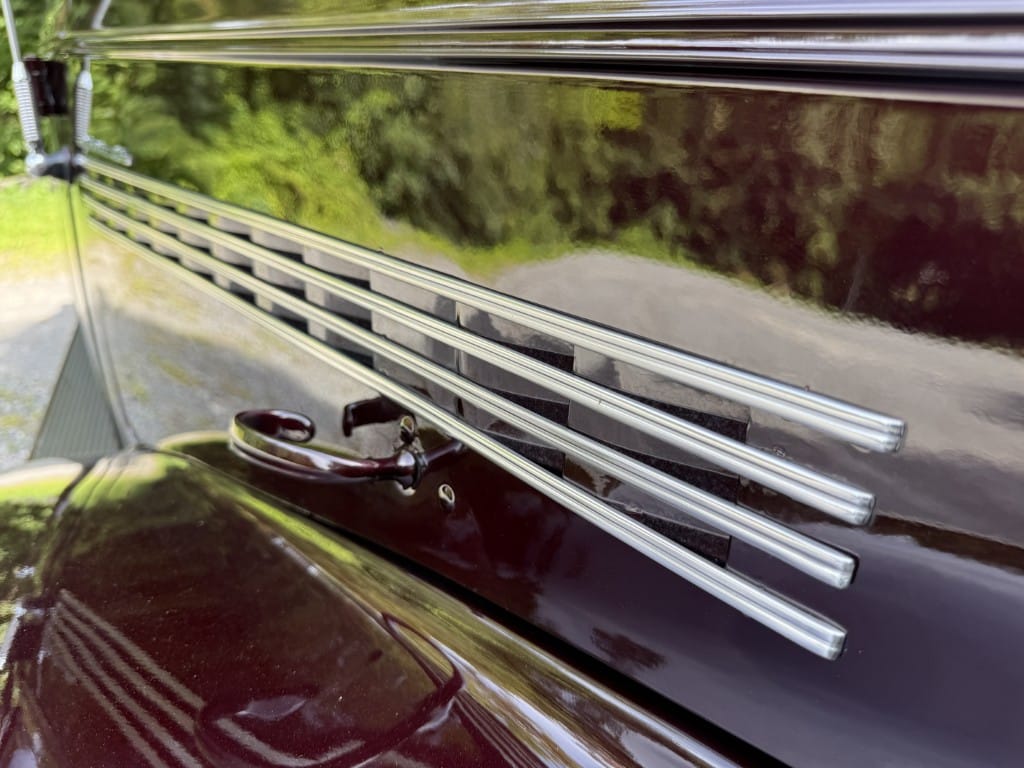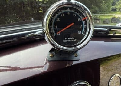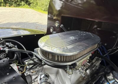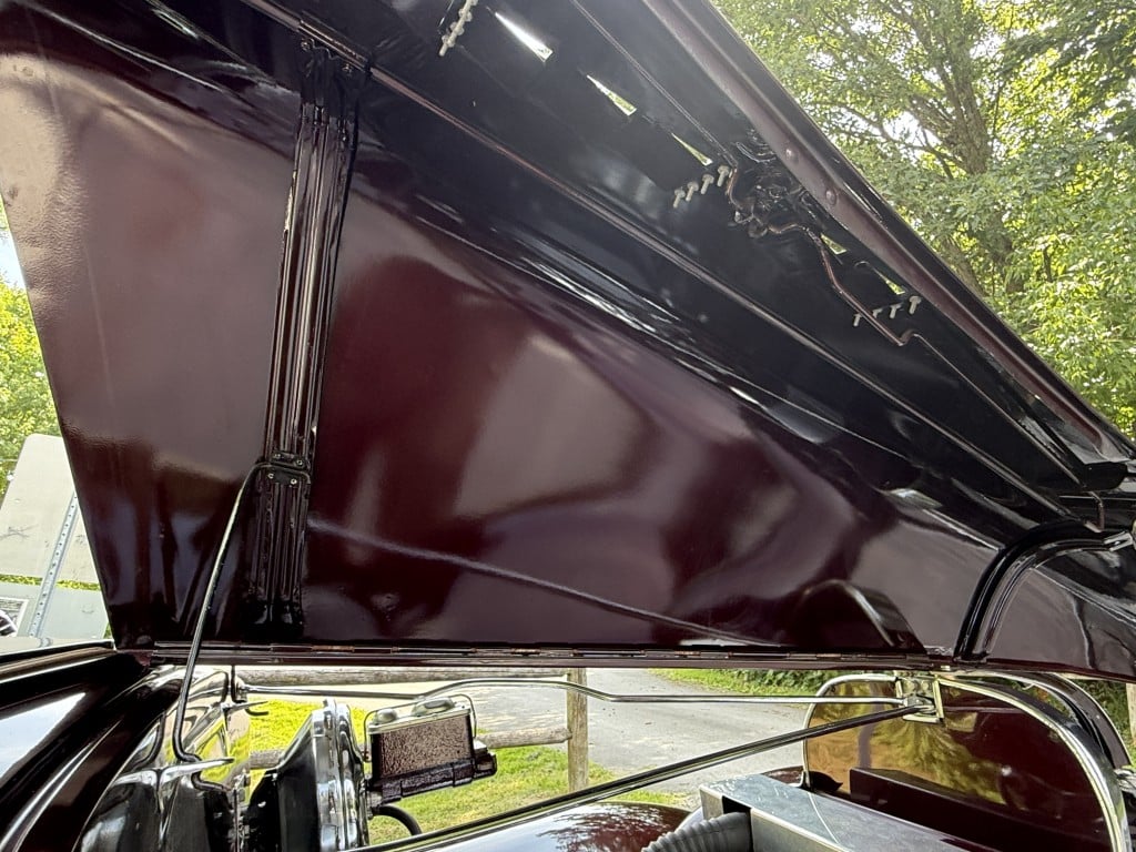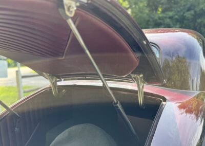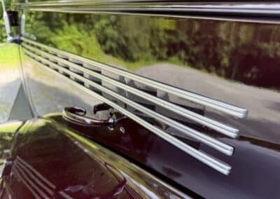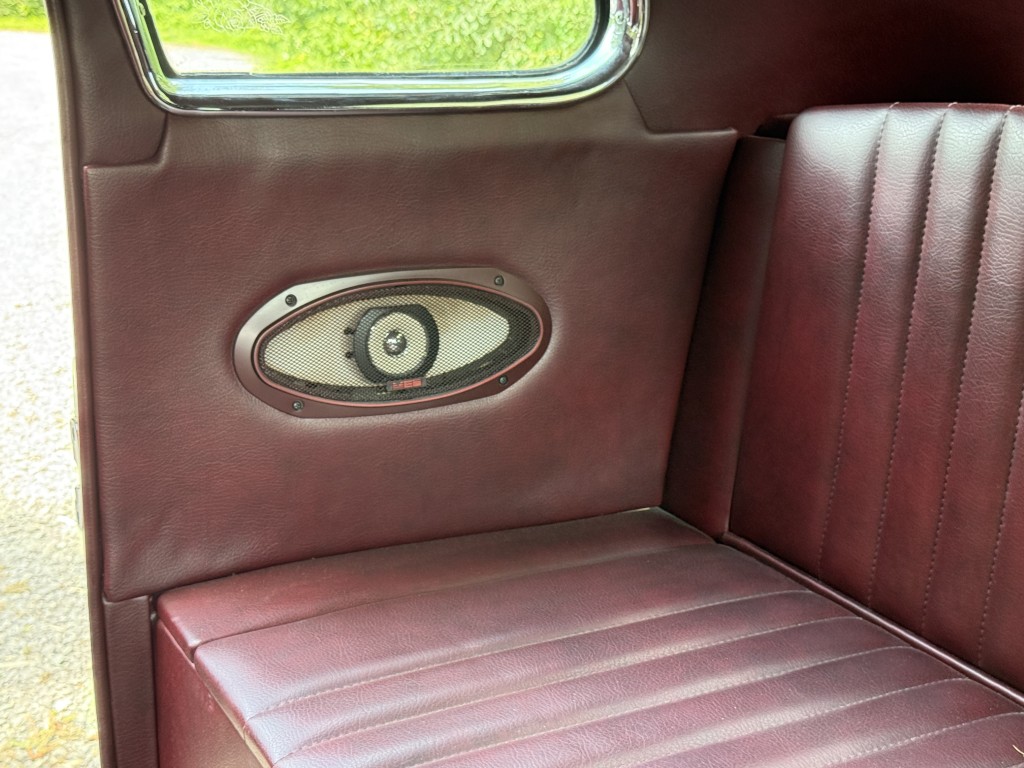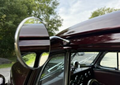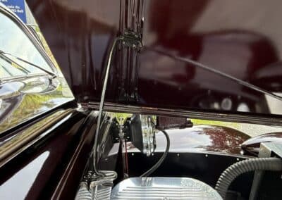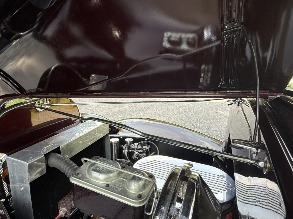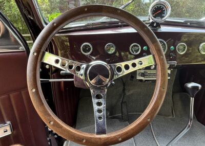 The restoration that the car received under prior ownership has been referred to as an ‘Every nut and bolt’ restoration by the appraiser, whose comprehensive report can be used as a reference, appearing in our gallery. It included an extensive dismantle of the car and rebuild from the ground up. The exterior of this street rod is finished in Black Cherry, professionally completed through a multi-coat paint process. All bright work/trim and accent components have either been replated or buffed and polished to retain the original high gloss finish. Modern safety glass has been used throughout, all with a light grey tint. Custom etchings are visible on several glass sections.