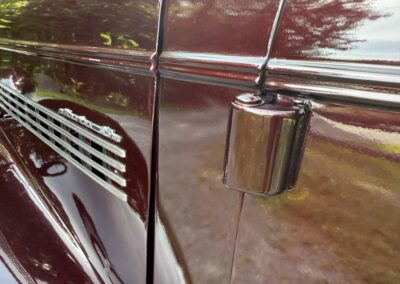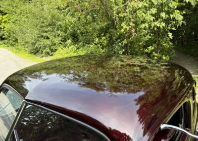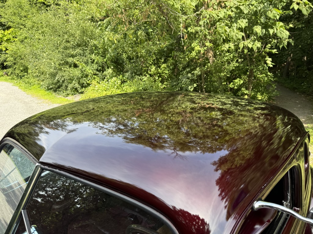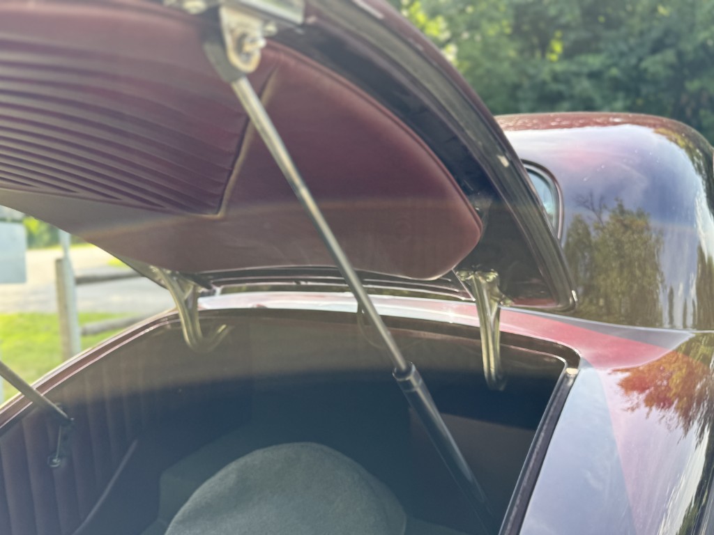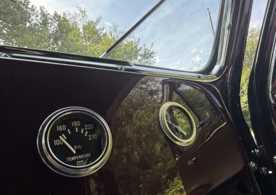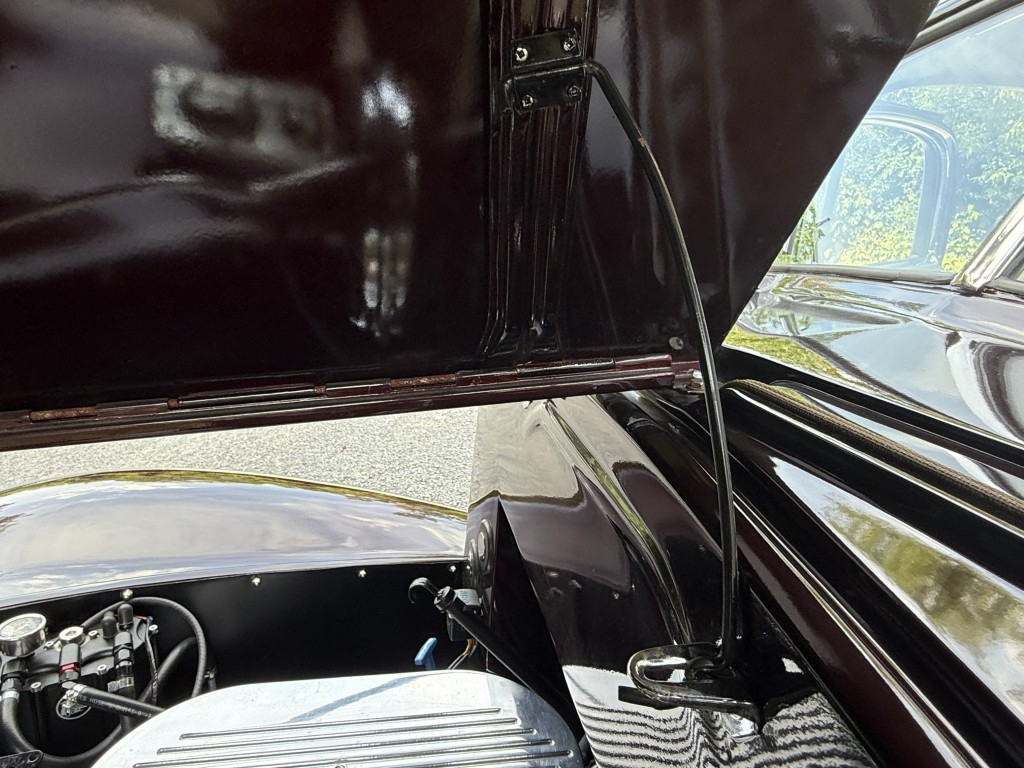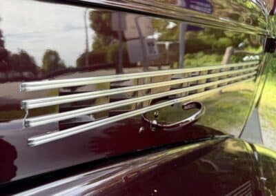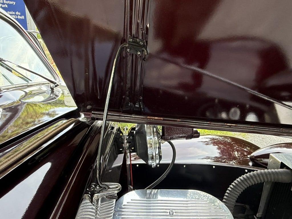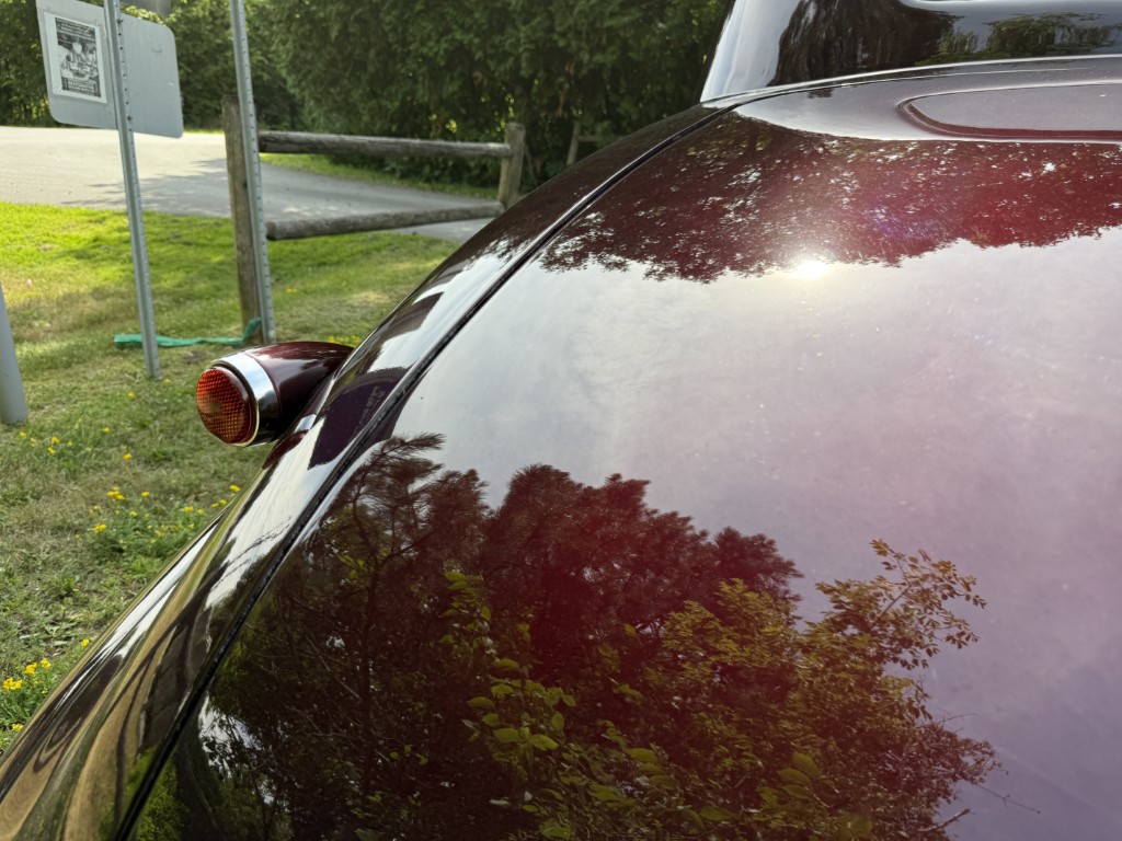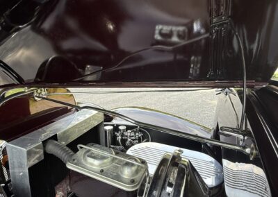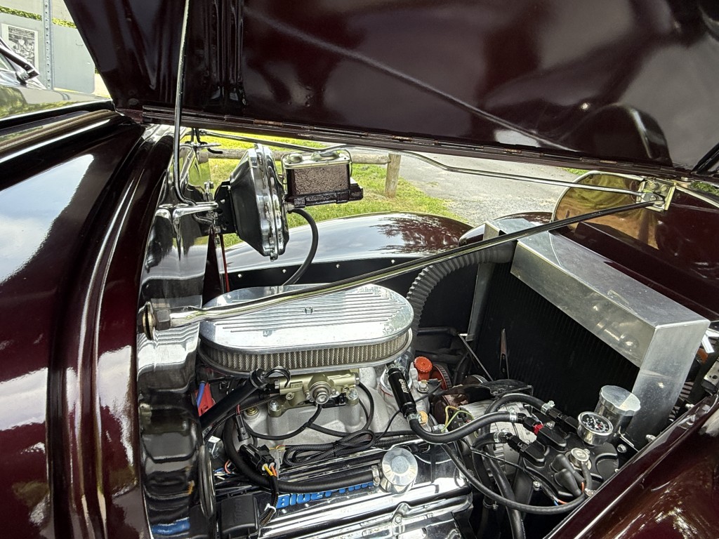 The restoration that the car received under prior ownership has been referred to as an ‘Every nut and bolt’ restoration by the appraiser, whose comprehensive report can be used as a reference, appearing in our gallery. It included an extensive dismantle of the car and rebuild from the ground up. The exterior of this street rod is finished in Black Cherry, professionally completed through a multi-coat paint process. All bright work/trim and accent components have either been replated or buffed and polished to retain the original high gloss finish. Modern safety glass has been used throughout, all with a light grey tint. Custom etchings are visible on several glass sections.