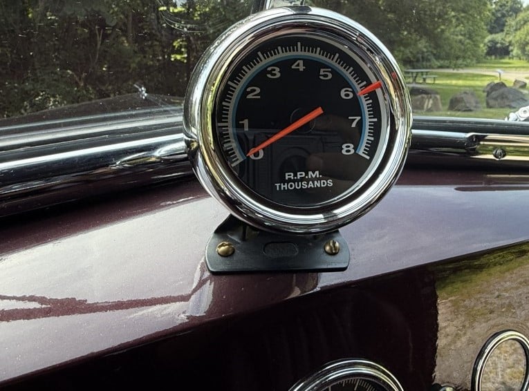 The wooden rim steering wheel with three chromed spokes fronts a custom dash panel with period correct Stewart Warner Instruments, tachometer and coolant temperature gauge excepted. A Realistic brand AM/FM stereo cassette player and a Pulser power booster have been installed, as well as power windows, illustrative of the modern functionalities in this street rod.