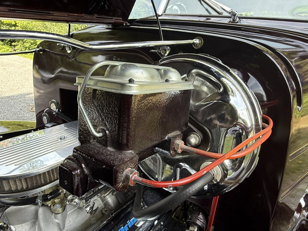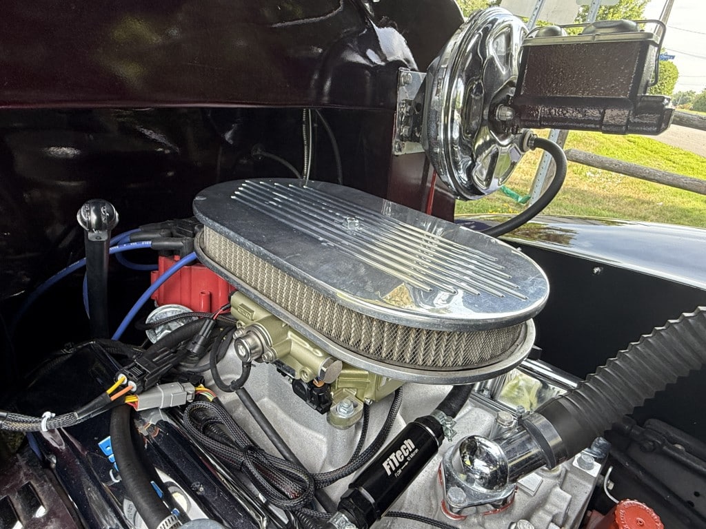The engine in this Chevrolet Master 85 is a professionally assembled 383-cubic-inch stroker V8, featuring an upgrade to electronic fuel injection. The engine compartment is equipped with various polished and chrome components, including a brushed aluminum intake manifold, polished aluminum low restriction air filter, polished aluminum valve covers, aluminum oil filler cap, chrome thermostat housing, a chrome oil breather cap, chrome timing gear cover, aluminum cylinder heads, chrome radiator support rods, aluminum shrouded radiator with polished stainless steel overflow container, flex fan, chrome power brake booster, and chrome hood support rods. The engine’s performance is further enhanced by a performance camshaft and valve train including roller type valve lifters, roller type rocker arms and high-quality rotating assembly including pistons, connecting rods and crankshaft. The engine bay is clean and has been dressed up with several chrome components shown throughout the gallery.
