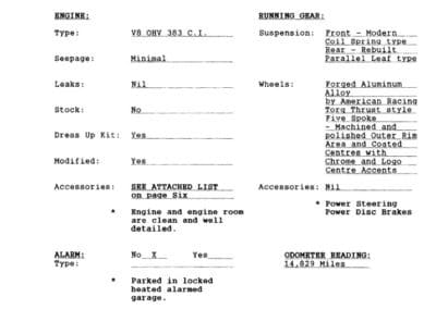 Lot - 284Category - DomesticSeller - CarchambaultSeller location - Ottawa ON K2S(view map)VIN - 9121711626Odometer - 15000 mi (TMU)Engine Info - 383 cubic-inch stroker V8Transmission Info - 700R4 Automatic with integral overdriveExterior Colour - Black CherryInterior Colour - BurgundyOther features - Electronic Fuel Injection, Chrome Engine Accessories with High-performance camshaft, roller valve train, balanced rotating assembly, Fully reupholstered interior with custom dash and Stewart Warner gauges, Power steering and power disc brakesHagerty.Ca Valuation, (#2 - #1) $35,500 – $54,400 (for a stock unit)Model page (click here)Carfax Report - N/A for pre-1981 VehicleInspector’s Report will be clickable, above, when ready.