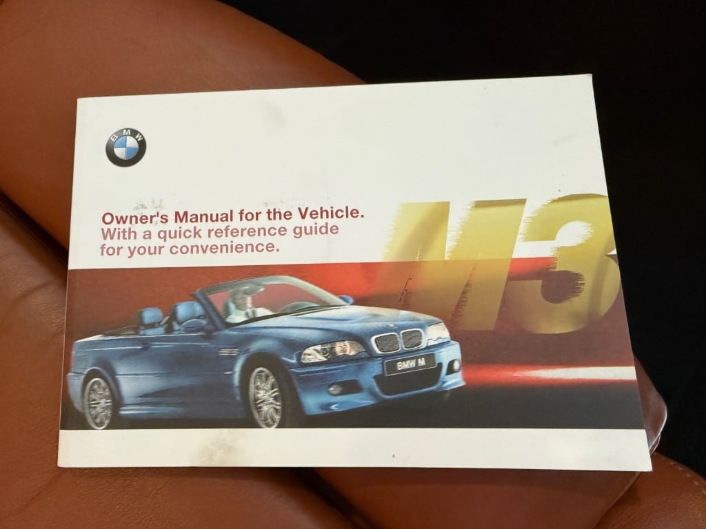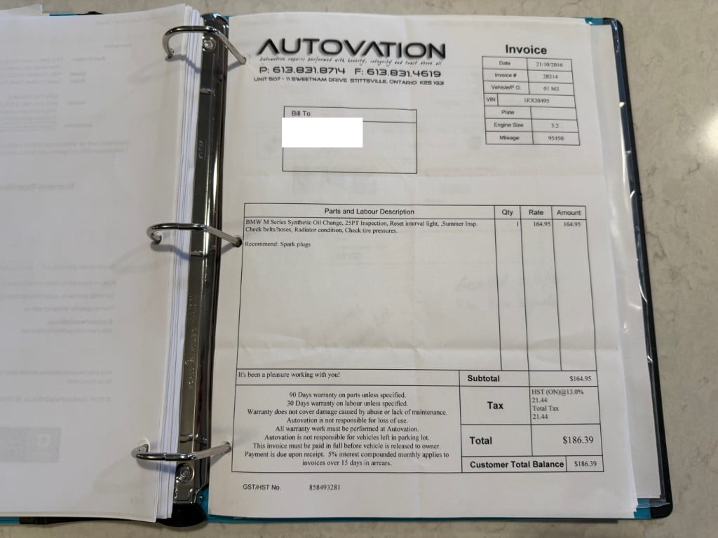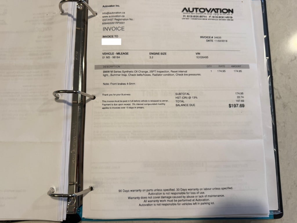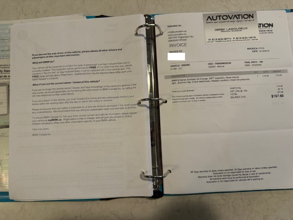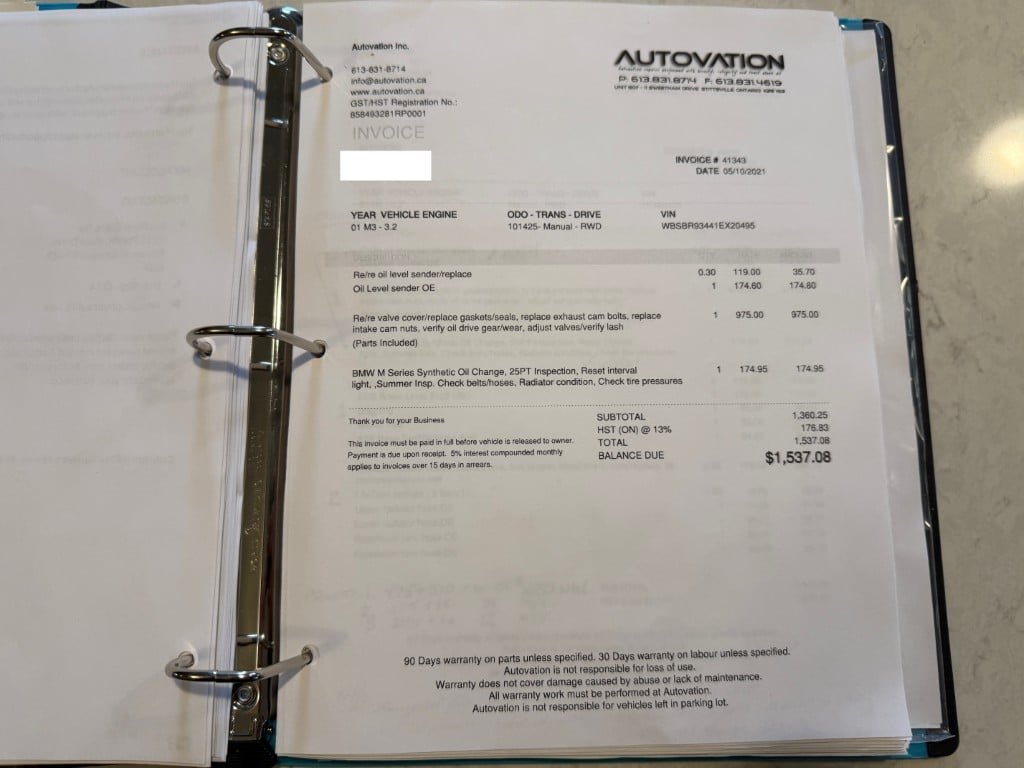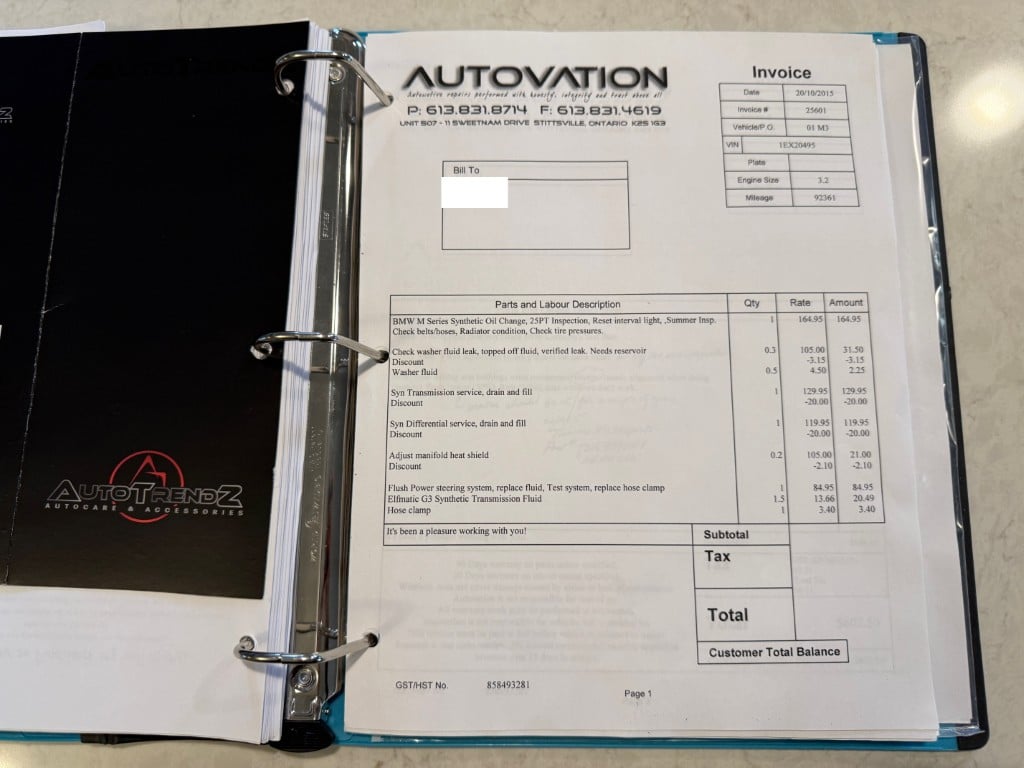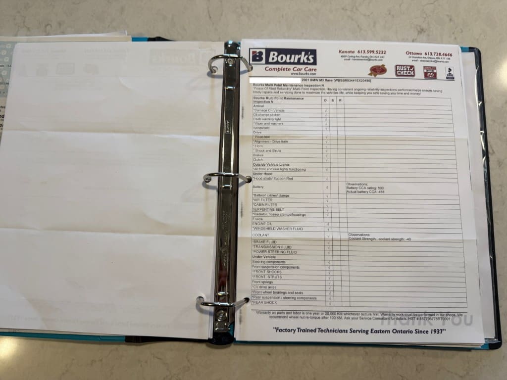 Power is delivered by BMW’s naturally aspirated 3.2-litre S54 inline-six engine, factory-rated at 333 horsepower and 262 lb-ft of torque. The engine is paired with a 6-speed manual gearbox sending power to the rear wheels. The seller advises the car remains mechanically stock aside from the cold air intake; the original unit is included in the sale. Recent maintenance includes an oil and filter change in September 2024 and installation of a new battery, in addition to the Michelin Pilot Sports this spring. Earlier work includes VANOS bolts and nuts replacement, valve adjustment, spark plugs, oil level sender, brake lines, radiator hoses, and differential, transmission, and power steering fluid service. The seller has retained all documentation for completed service work during his ownership and has it organized chronologically in a three-ring binder, which will accompany the car. Most of the binder’s contents are included in the gallery.