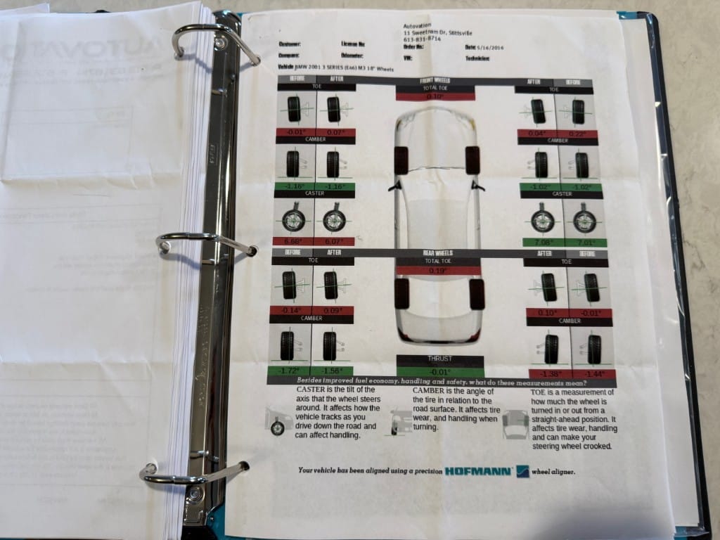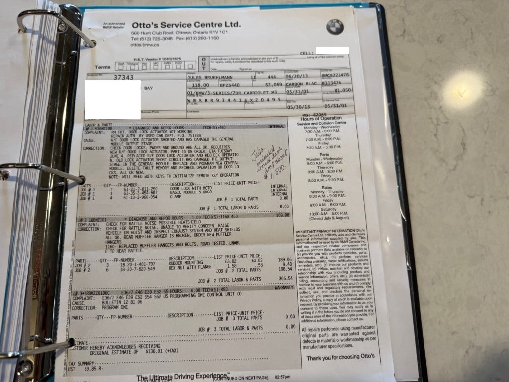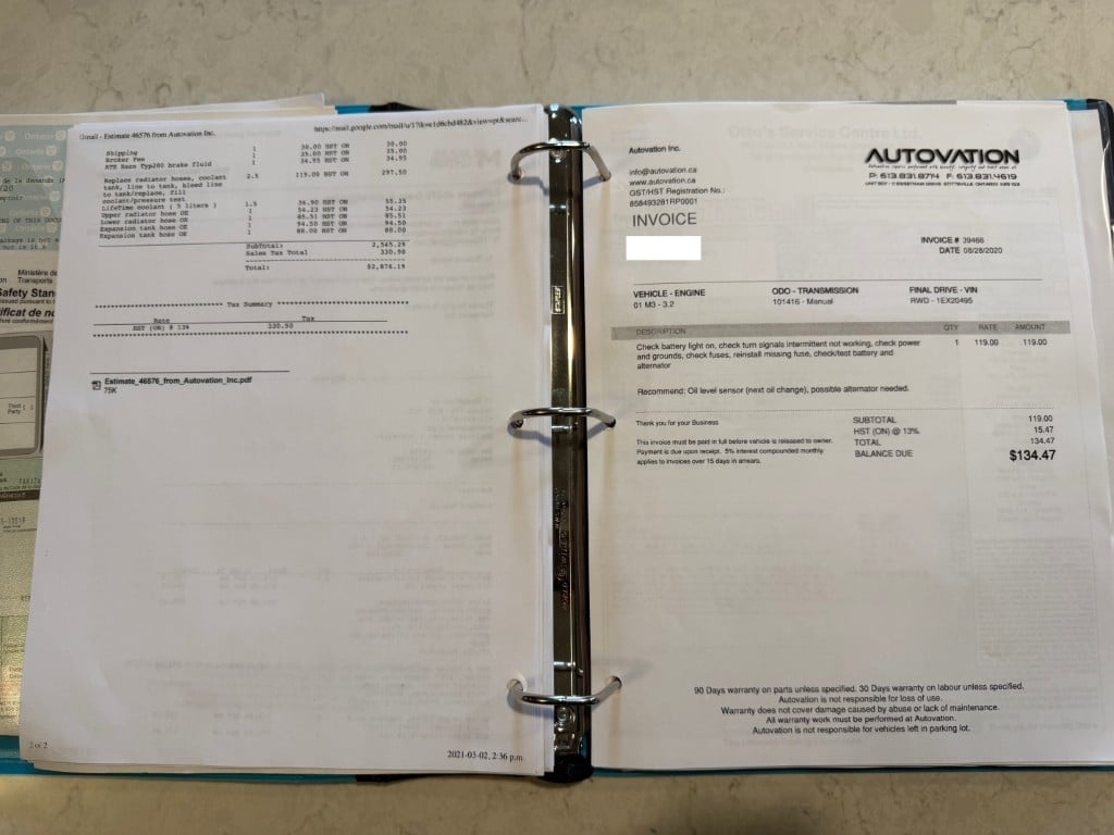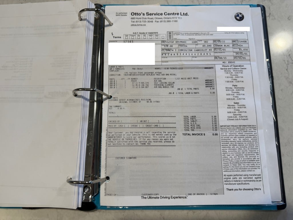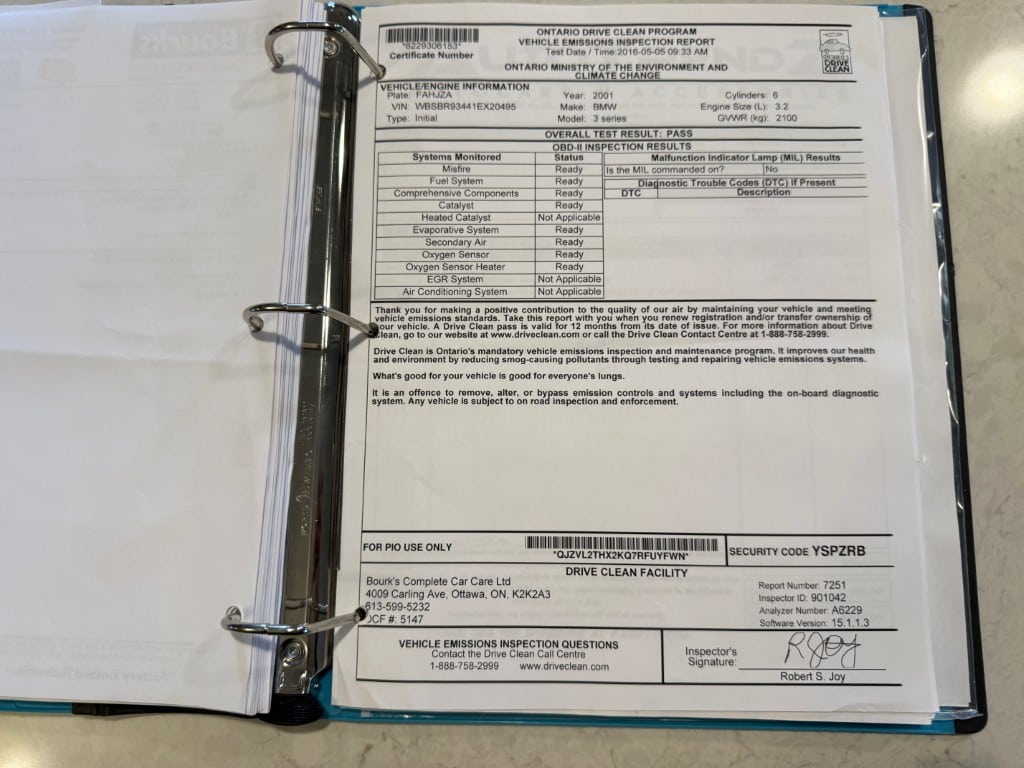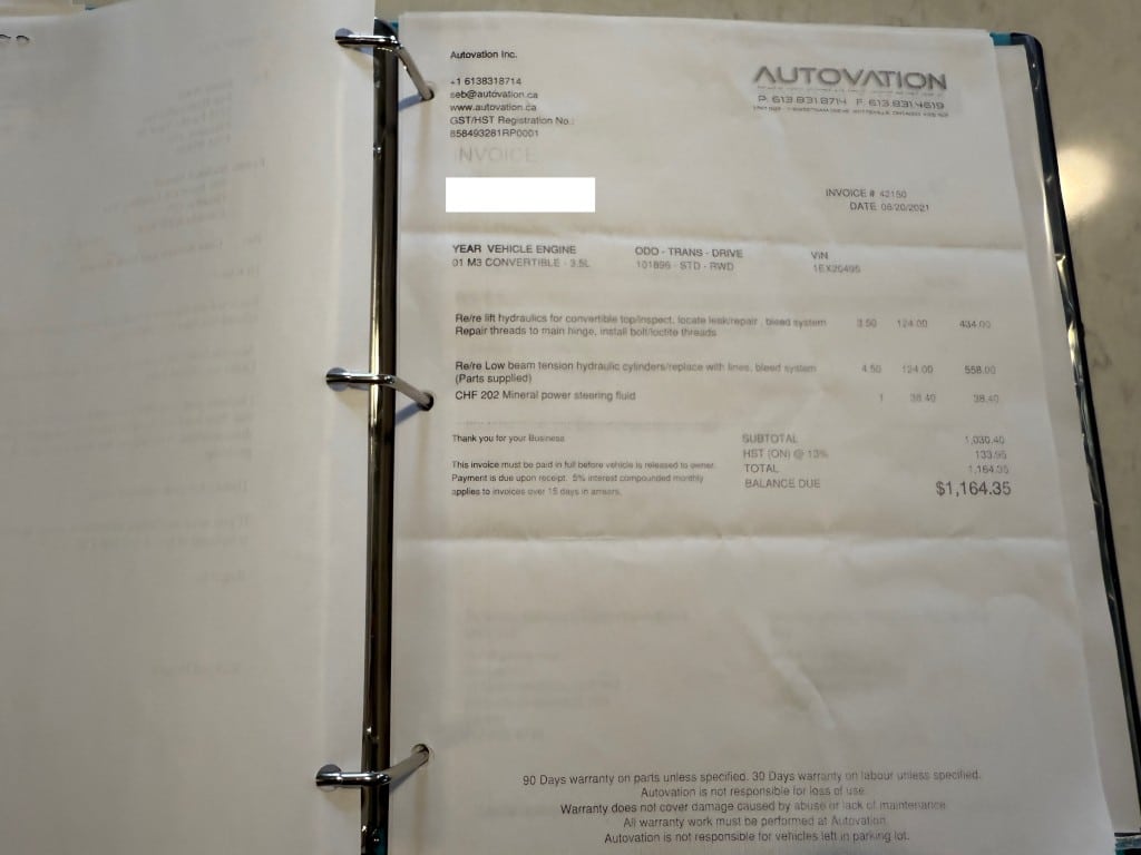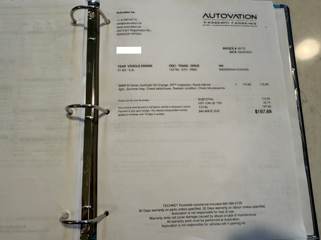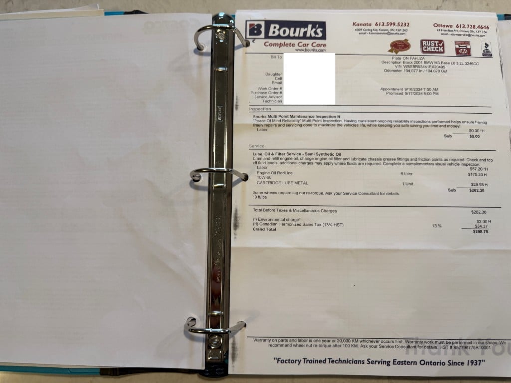 Power is delivered by BMW’s naturally aspirated 3.2-litre S54 inline-six engine, factory-rated at 333 horsepower and 262 lb-ft of torque. The engine is paired with a 6-speed manual gearbox sending power to the rear wheels. The seller advises the car remains mechanically stock aside from the cold air intake; the original unit is included in the sale. Recent maintenance includes an oil and filter change in September 2024 and installation of a new battery, in addition to the Michelin Pilot Sports this spring. Earlier work includes VANOS bolts and nuts replacement, valve adjustment, spark plugs, oil level sender, brake lines, radiator hoses, and differential, transmission, and power steering fluid service. The seller has retained all documentation for completed service work during his ownership and has it organized chronologically in a three-ring binder, which will accompany the car. Most of the binder’s contents are included in the gallery.