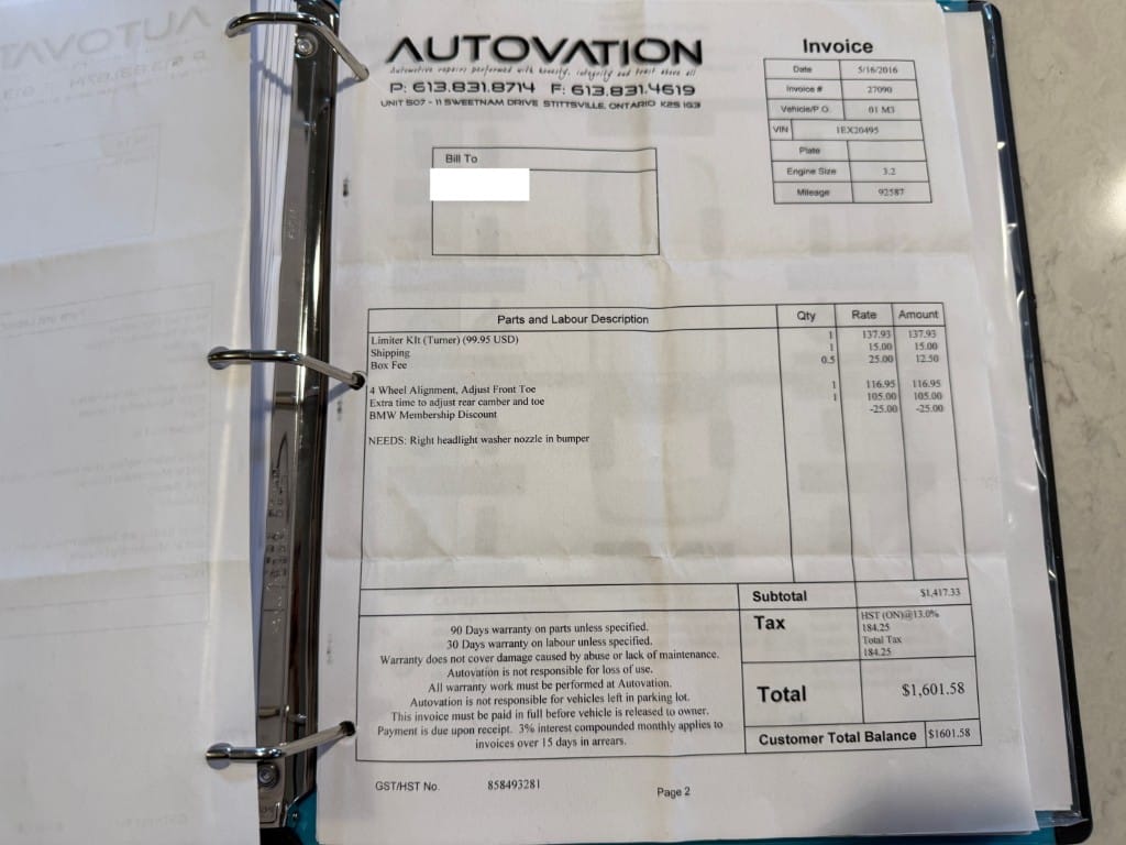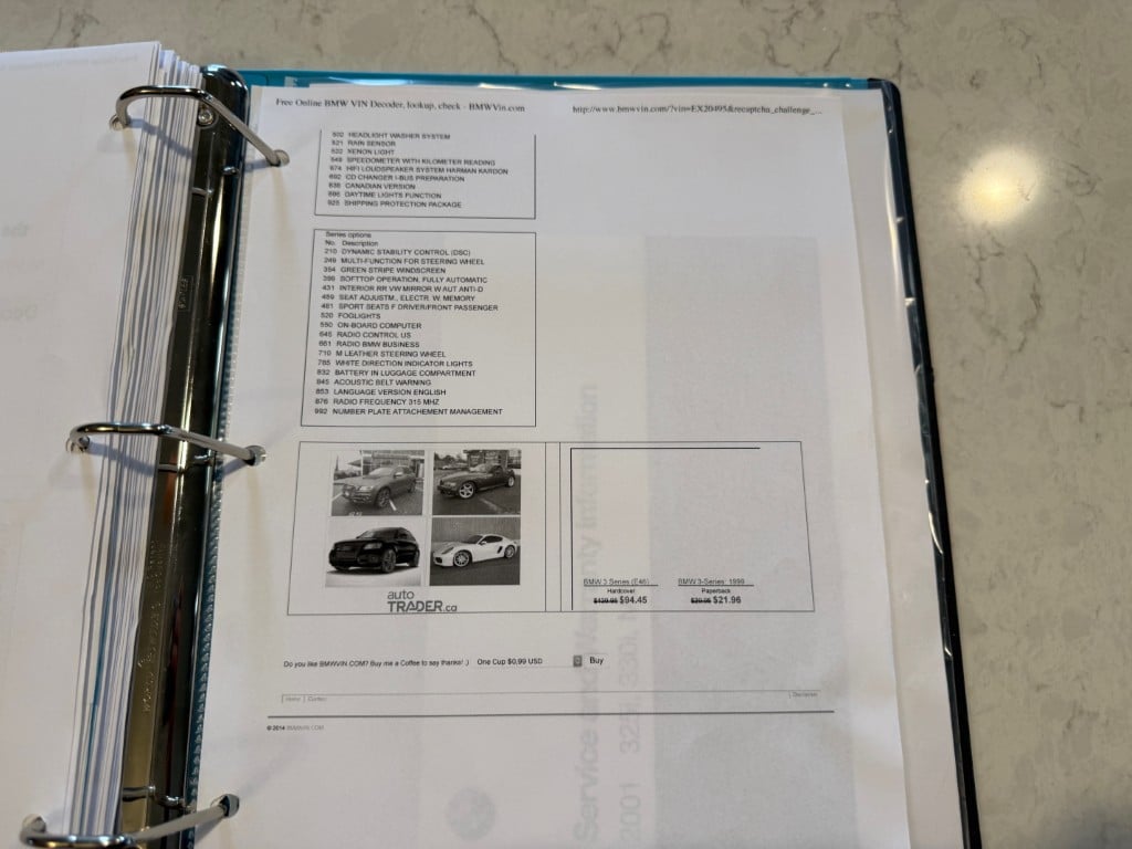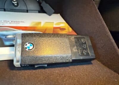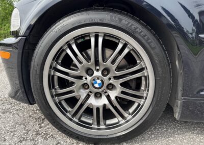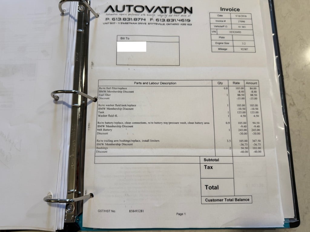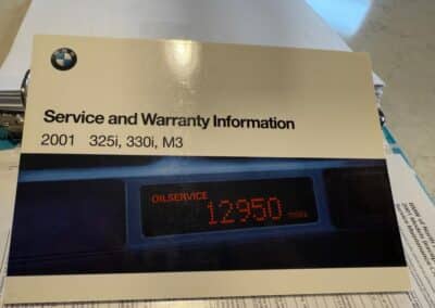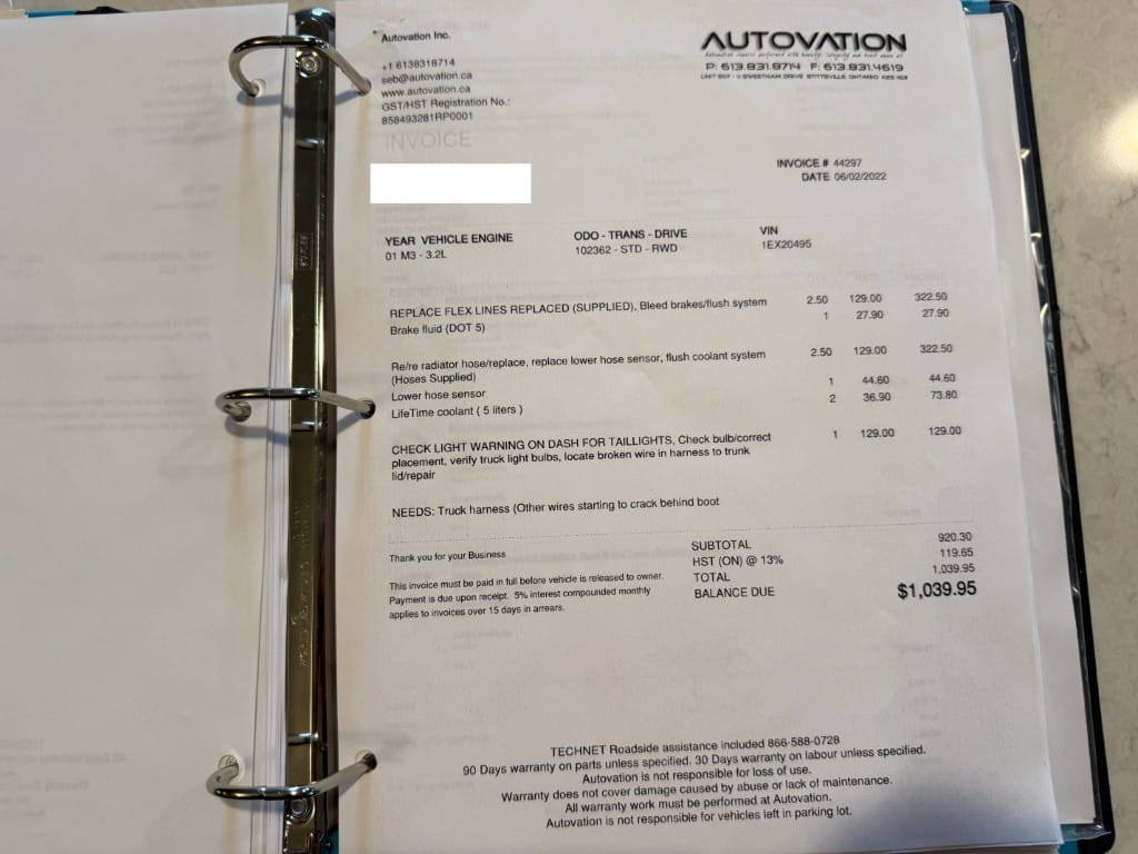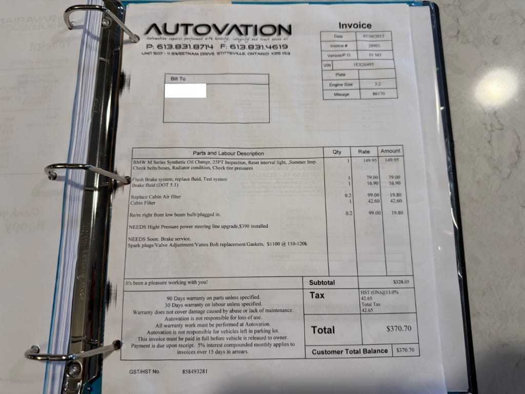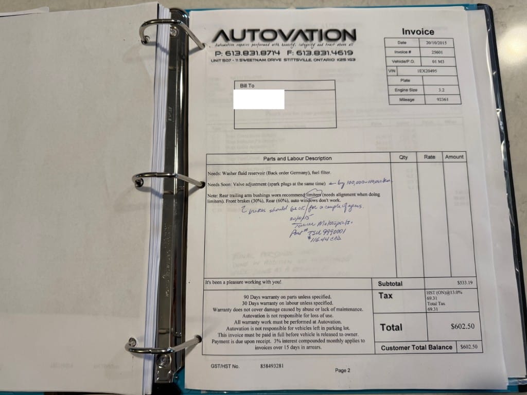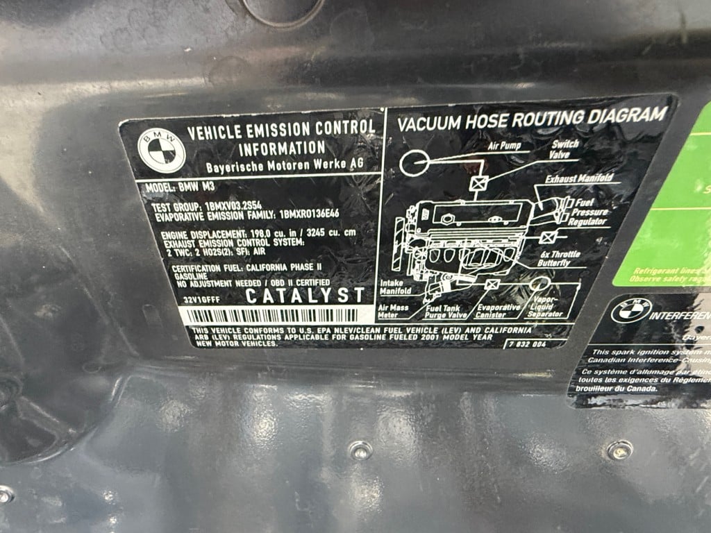 Power is delivered by BMW’s naturally aspirated 3.2-litre S54 inline-six engine, factory-rated at 333 horsepower and 262 lb-ft of torque. The engine is paired with a 6-speed manual gearbox sending power to the rear wheels. The seller advises the car remains mechanically stock aside from the cold air intake; the original unit is included in the sale. Recent maintenance includes an oil and filter change in September 2024 and installation of a new battery, in addition to the Michelin Pilot Sports this spring. Earlier work includes VANOS bolts and nuts replacement, valve adjustment, spark plugs, oil level sender, brake lines, radiator hoses, and differential, transmission, and power steering fluid service. The seller has retained all documentation for completed service work during his ownership and has it organized chronologically in a three-ring binder, which will accompany the car. Most of the binder’s contents are included in the gallery.