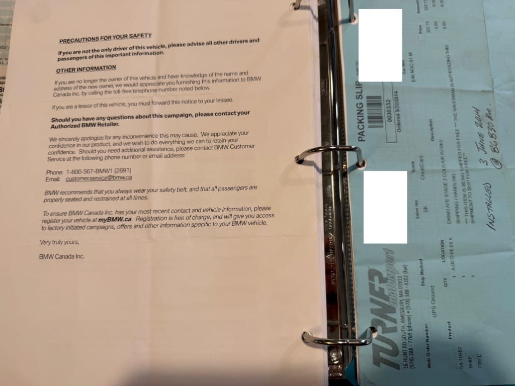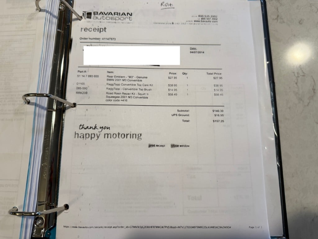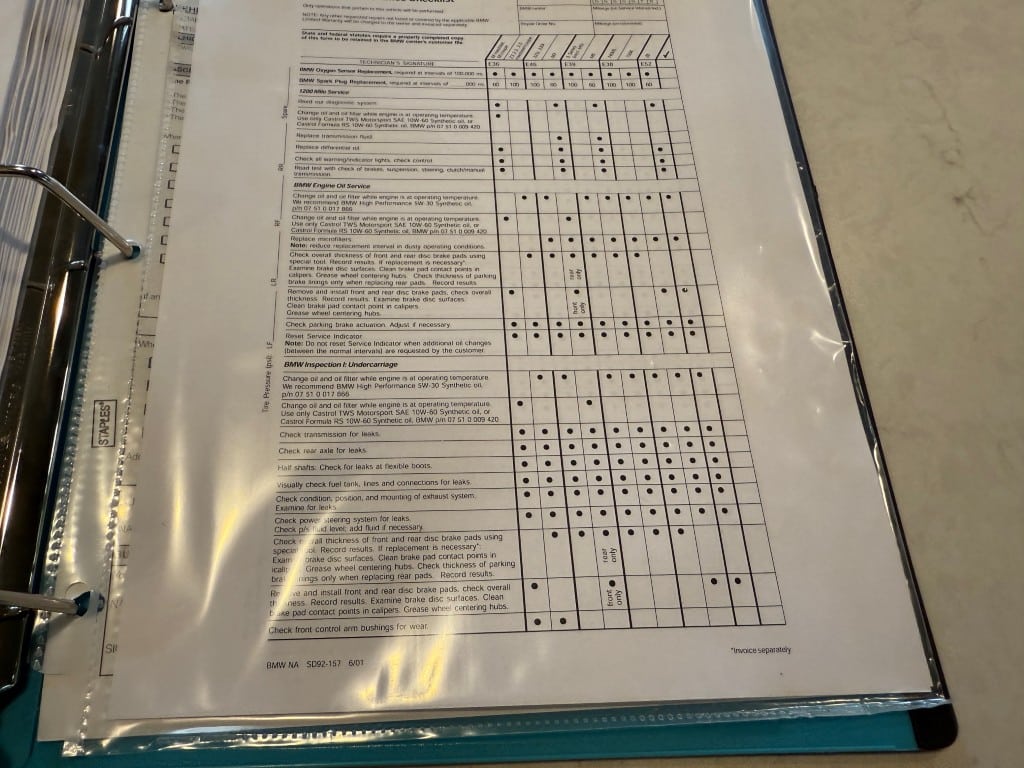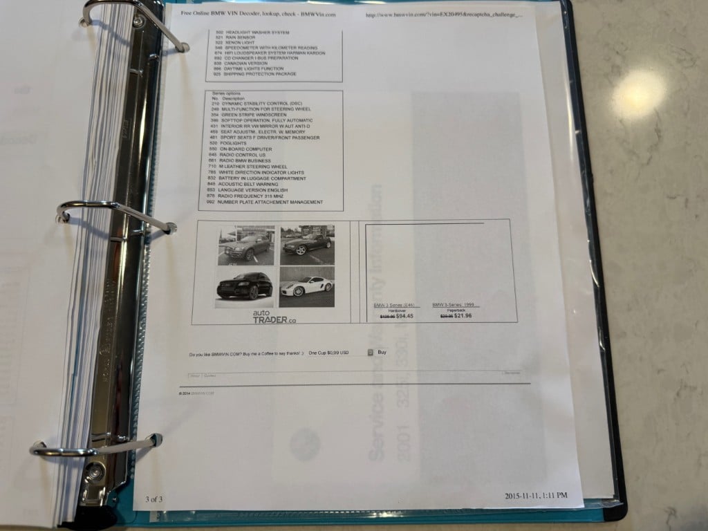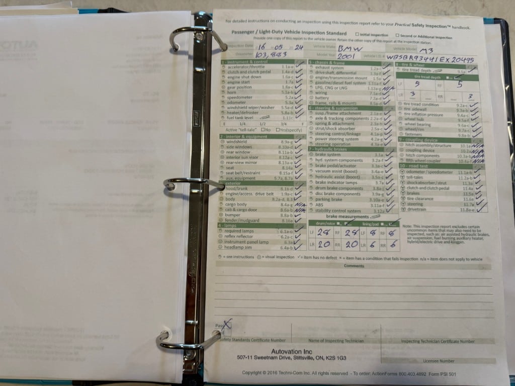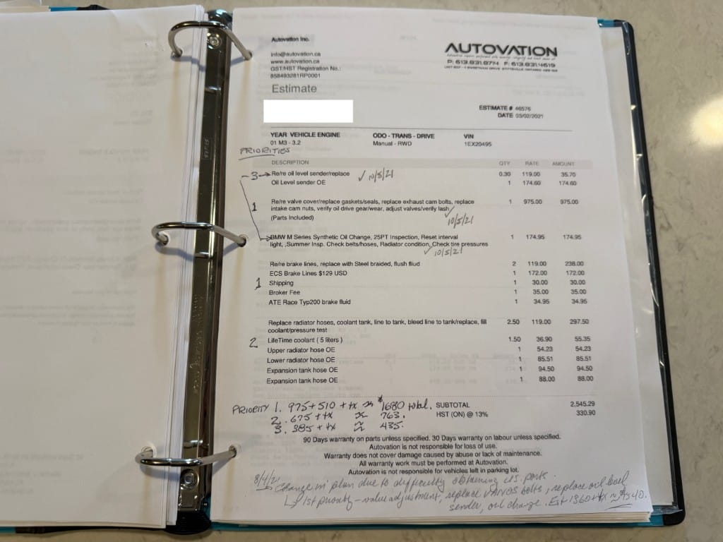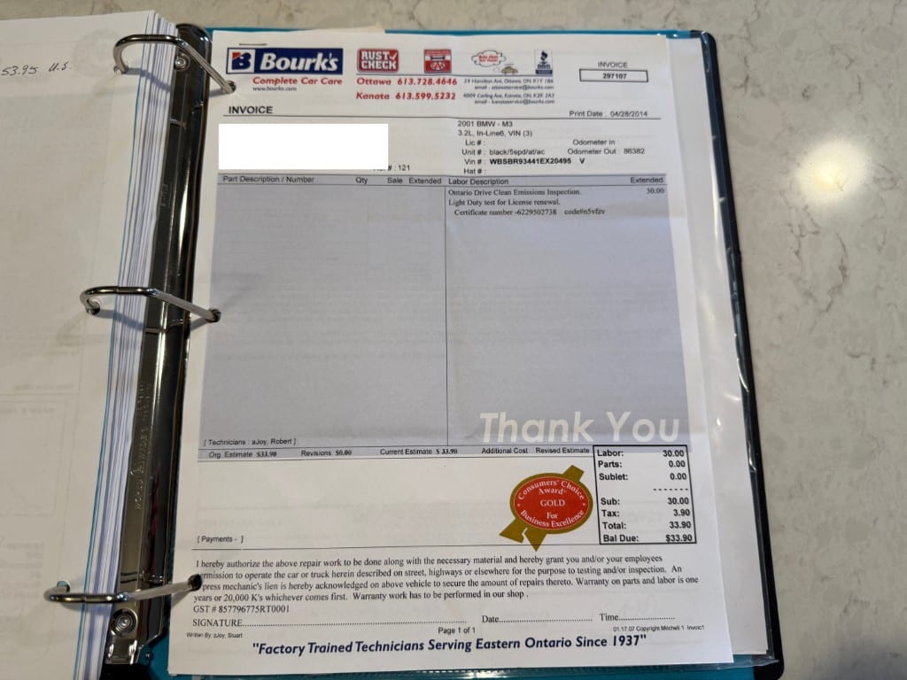 Power is delivered by BMW’s naturally aspirated 3.2-litre S54 inline-six engine, factory-rated at 333 horsepower and 262 lb-ft of torque. The engine is paired with a 6-speed manual gearbox sending power to the rear wheels. The seller advises the car remains mechanically stock aside from the cold air intake; the original unit is included in the sale. Recent maintenance includes an oil and filter change in September 2024 and installation of a new battery, in addition to the Michelin Pilot Sports this spring. Earlier work includes VANOS bolts and nuts replacement, valve adjustment, spark plugs, oil level sender, brake lines, radiator hoses, and differential, transmission, and power steering fluid service. The seller has retained all documentation for completed service work during his ownership and has it organized chronologically in a three-ring binder, which will accompany the car. Most of the binder’s contents are included in the gallery.