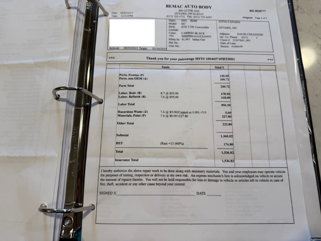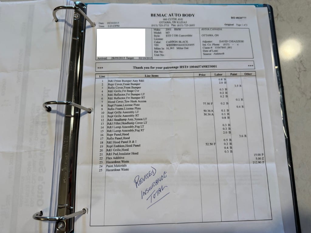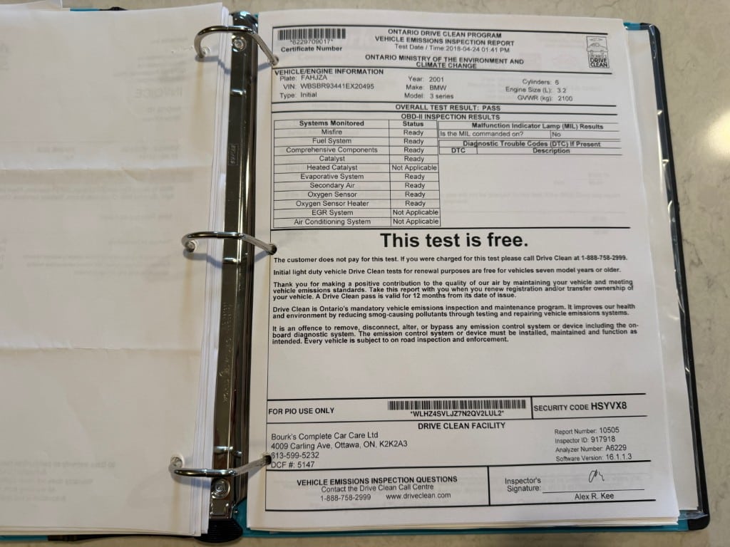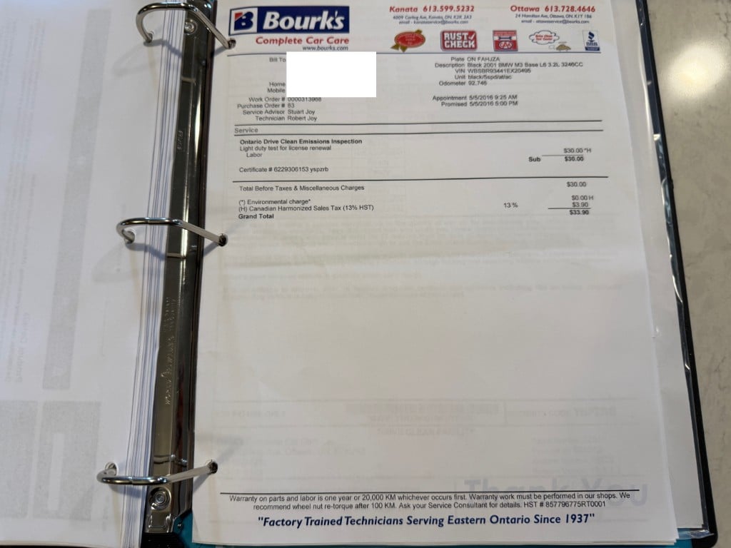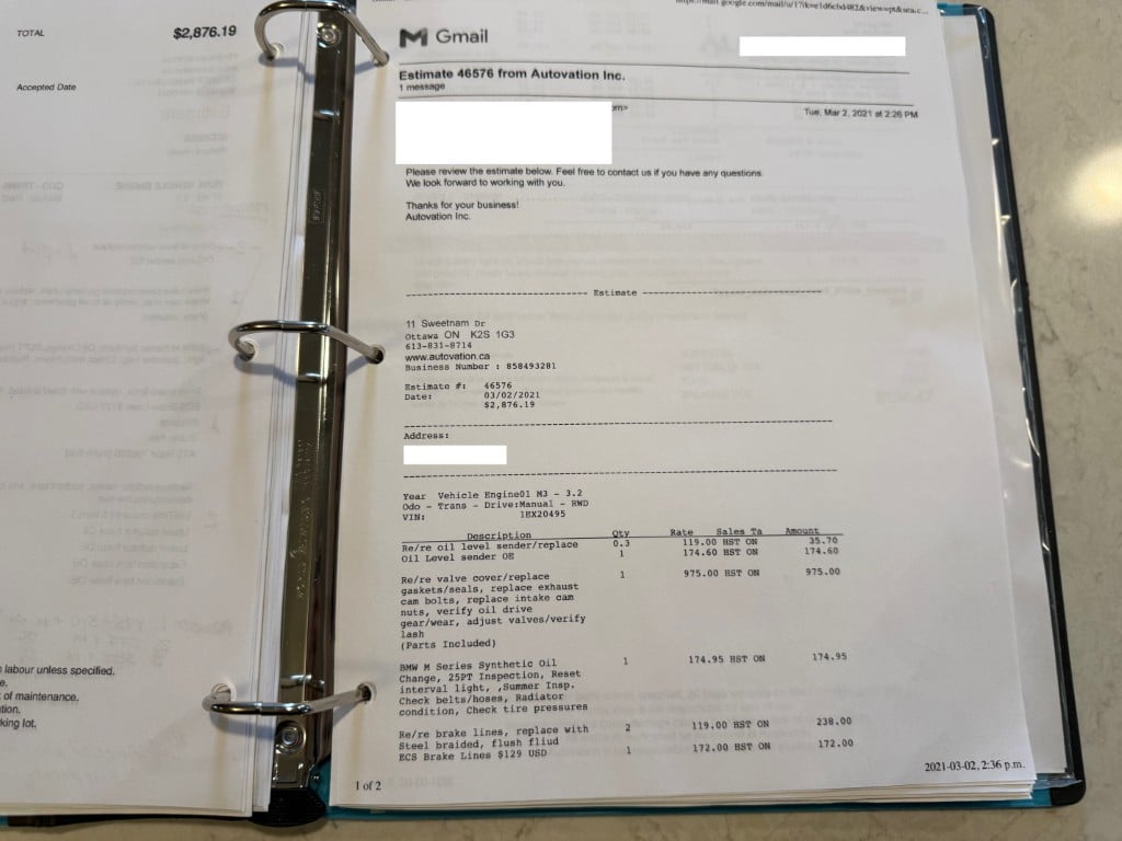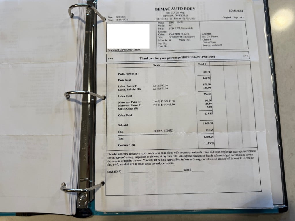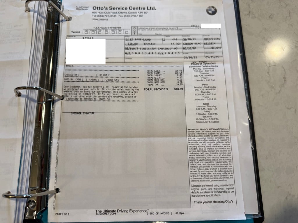 Power is delivered by BMW’s naturally aspirated 3.2-litre S54 inline-six engine, factory-rated at 333 horsepower and 262 lb-ft of torque. The engine is paired with a 6-speed manual gearbox sending power to the rear wheels. The seller advises the car remains mechanically stock aside from the cold air intake; the original unit is included in the sale. Recent maintenance includes an oil and filter change in September 2024 and installation of a new battery, in addition to the Michelin Pilot Sports this spring. Earlier work includes VANOS bolts and nuts replacement, valve adjustment, spark plugs, oil level sender, brake lines, radiator hoses, and differential, transmission, and power steering fluid service. The seller has retained all documentation for completed service work during his ownership and has it organized chronologically in a three-ring binder, which will accompany the car. Most of the binder’s contents are included in the gallery.