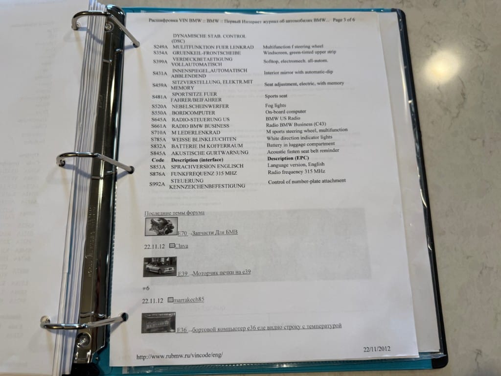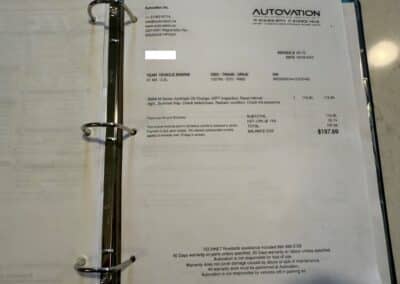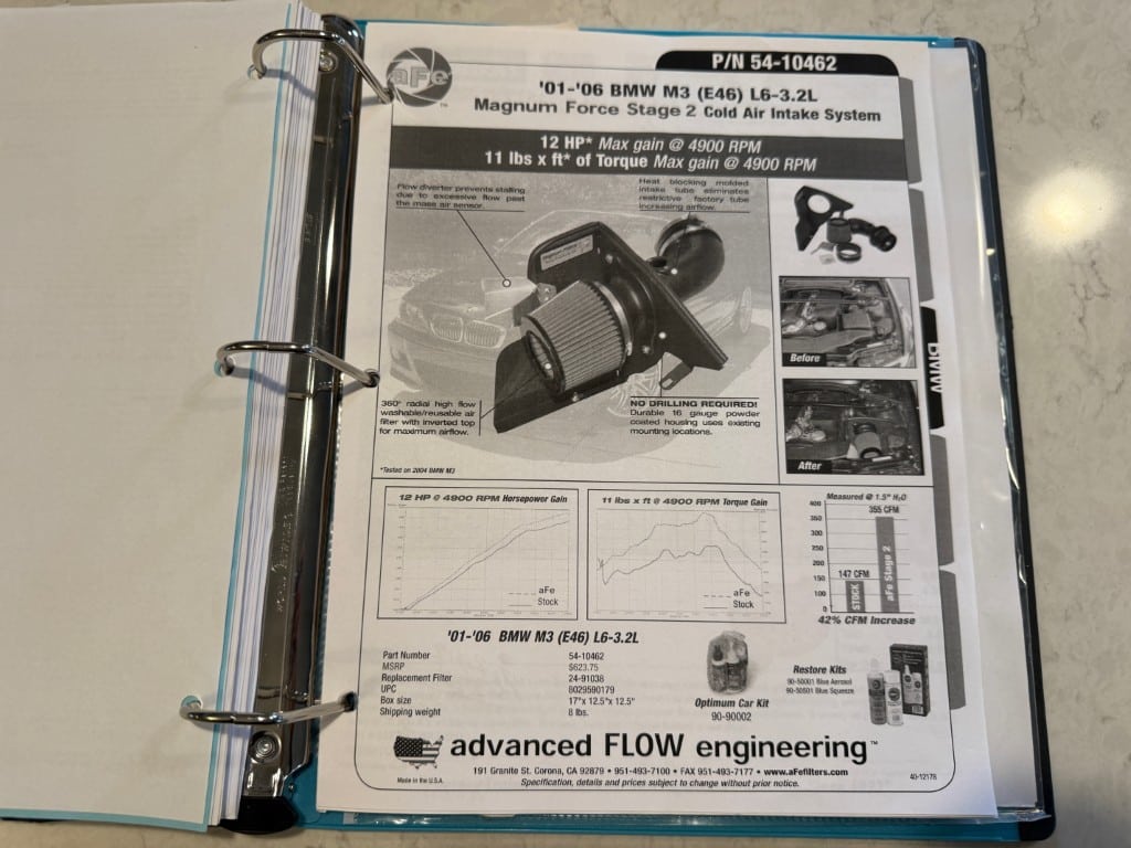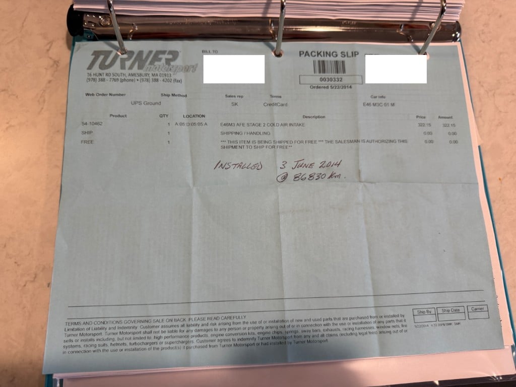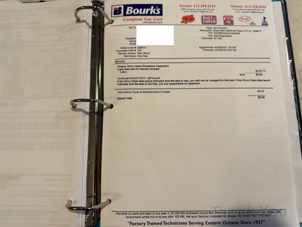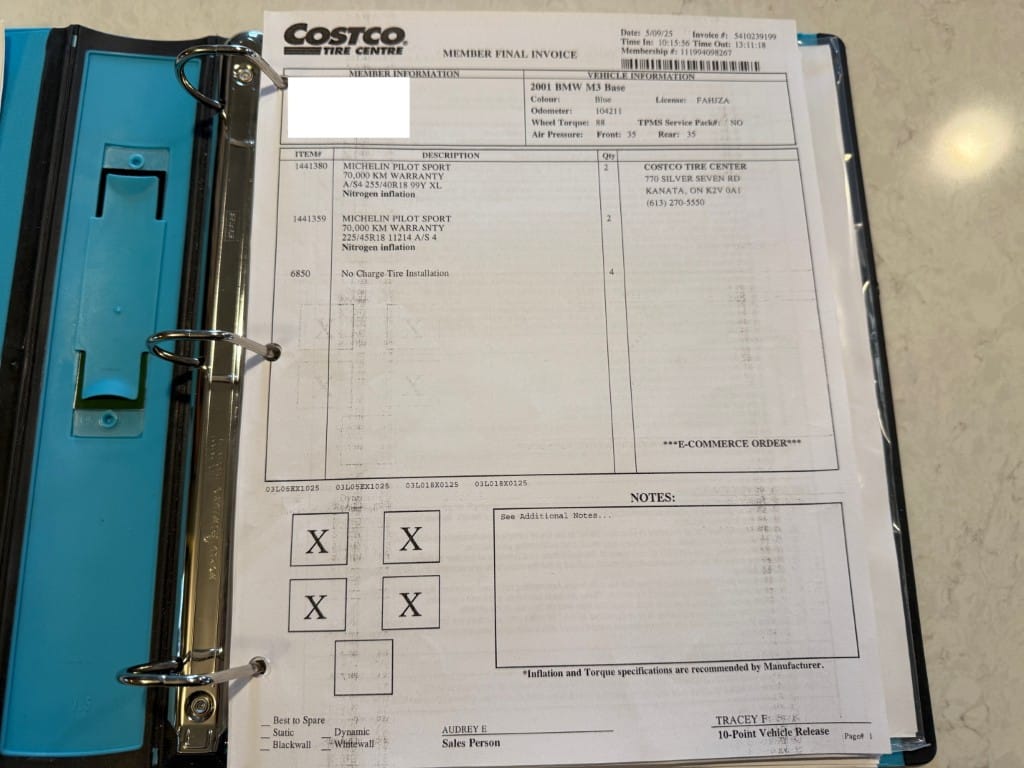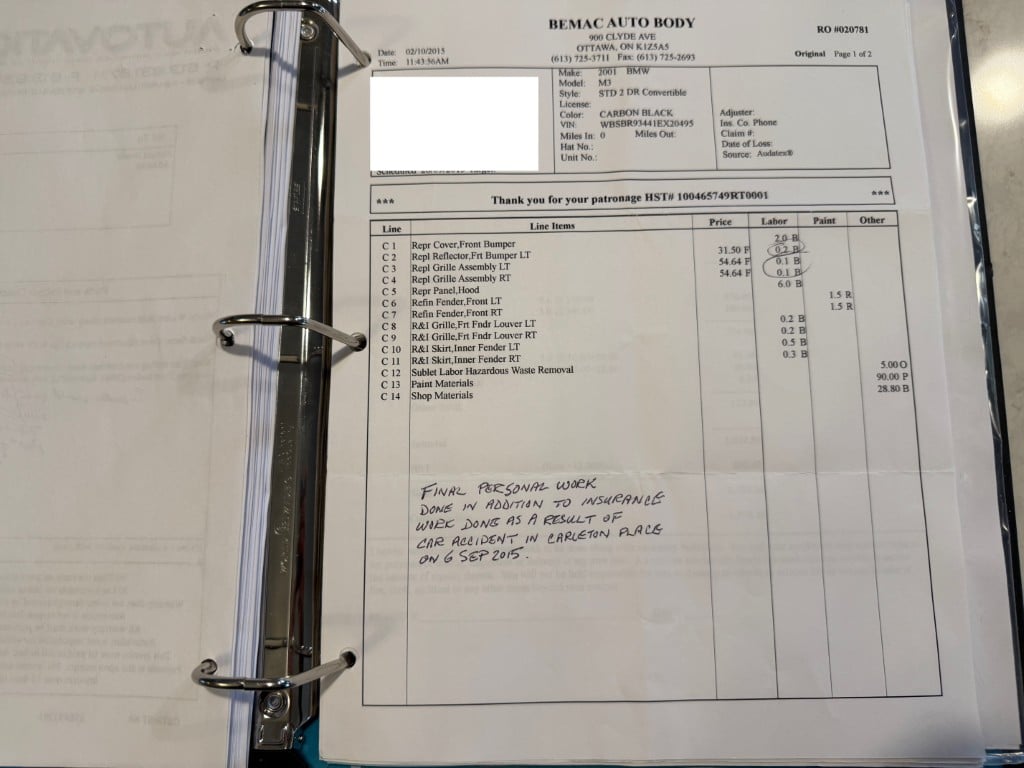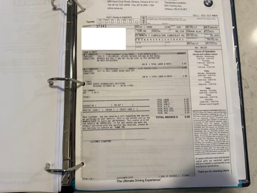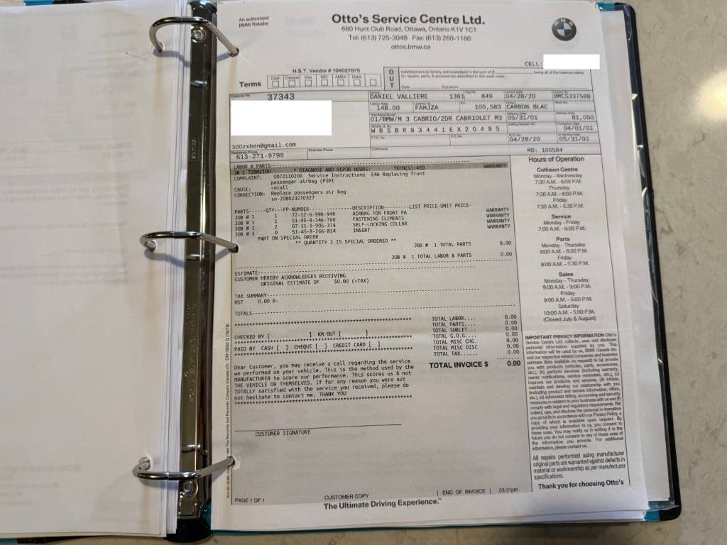 Power is delivered by BMW’s naturally aspirated 3.2-litre S54 inline-six engine, factory-rated at 333 horsepower and 262 lb-ft of torque. The engine is paired with a 6-speed manual gearbox sending power to the rear wheels. The seller advises the car remains mechanically stock aside from the cold air intake; the original unit is included in the sale. Recent maintenance includes an oil and filter change in September 2024 and installation of a new battery, in addition to the Michelin Pilot Sports this spring. Earlier work includes VANOS bolts and nuts replacement, valve adjustment, spark plugs, oil level sender, brake lines, radiator hoses, and differential, transmission, and power steering fluid service. The seller has retained all documentation for completed service work during his ownership and has it organized chronologically in a three-ring binder, which will accompany the car. Most of the binder’s contents are included in the gallery.