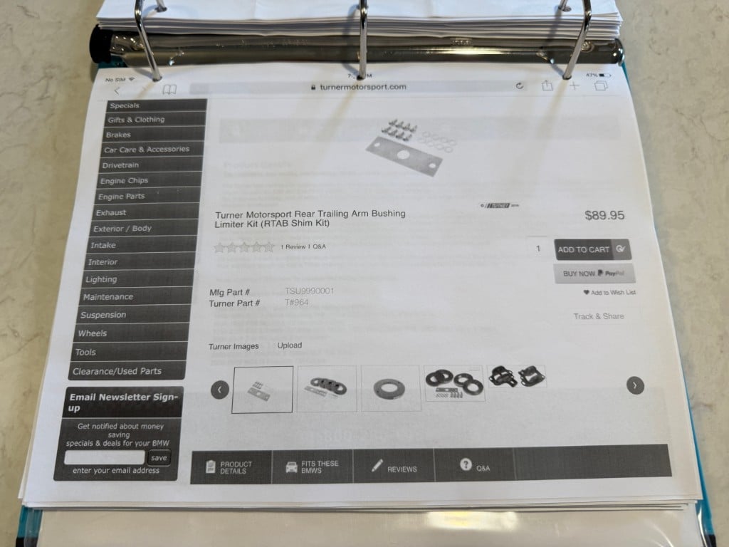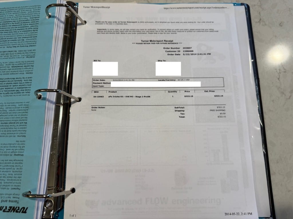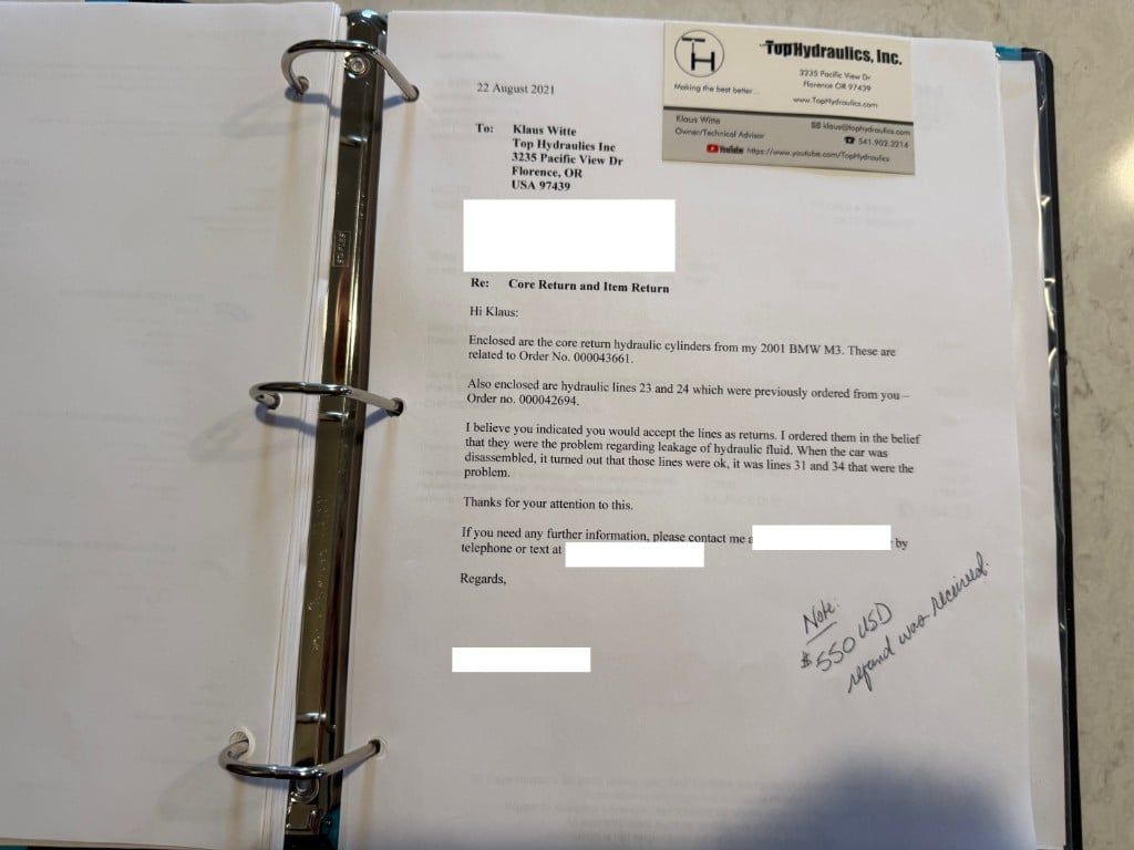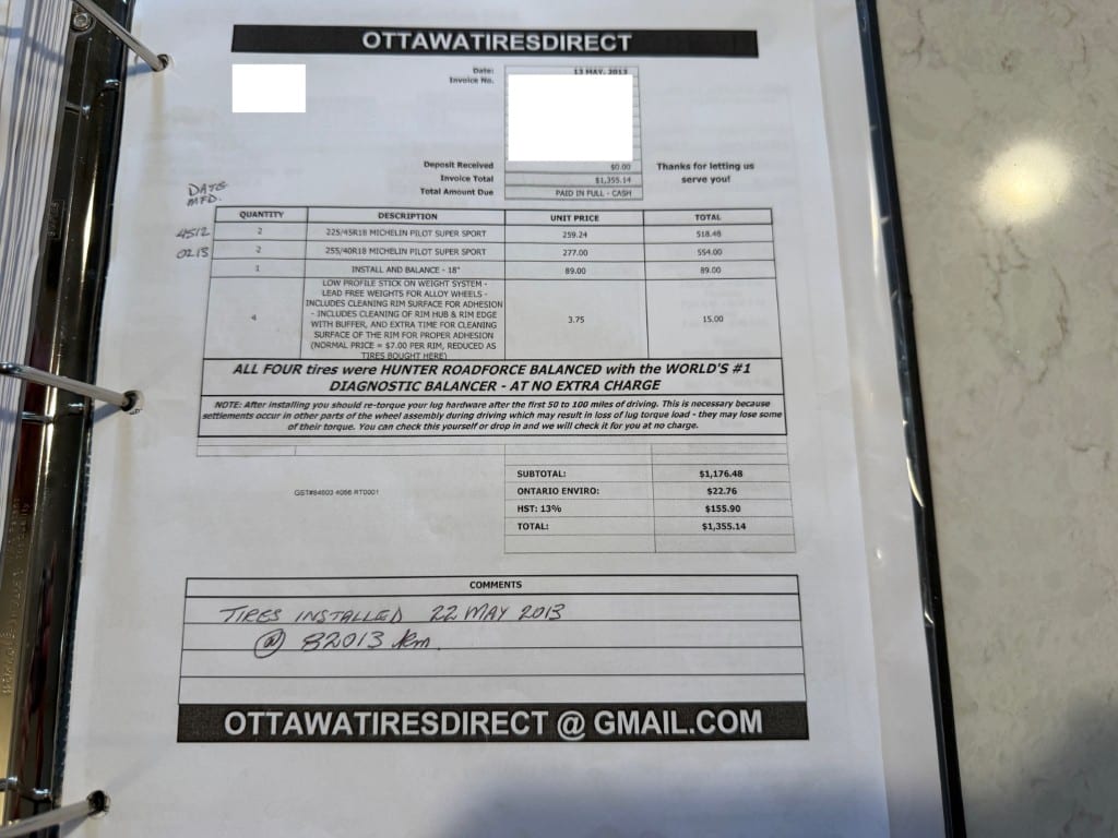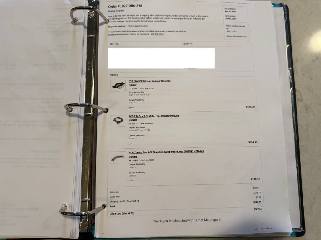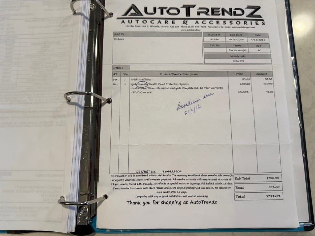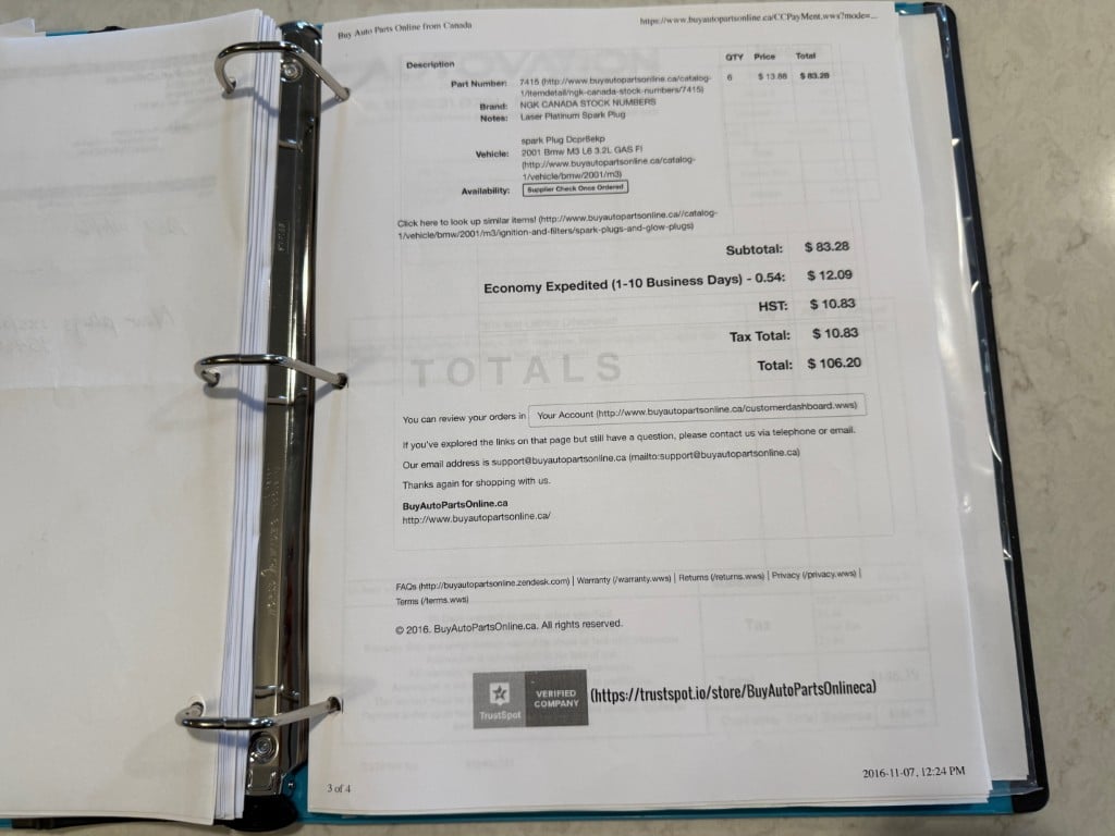 Power is delivered by BMW’s naturally aspirated 3.2-litre S54 inline-six engine, factory-rated at 333 horsepower and 262 lb-ft of torque. The engine is paired with a 6-speed manual gearbox sending power to the rear wheels. The seller advises the car remains mechanically stock aside from the cold air intake; the original unit is included in the sale. Recent maintenance includes an oil and filter change in September 2024 and installation of a new battery, in addition to the Michelin Pilot Sports this spring. Earlier work includes VANOS bolts and nuts replacement, valve adjustment, spark plugs, oil level sender, brake lines, radiator hoses, and differential, transmission, and power steering fluid service. The seller has retained all documentation for completed service work during his ownership and has it organized chronologically in a three-ring binder, which will accompany the car. Most of the binder’s contents are included in the gallery.