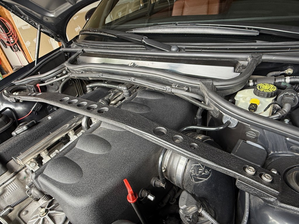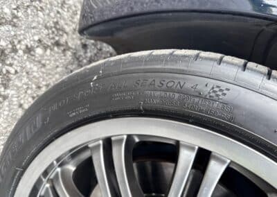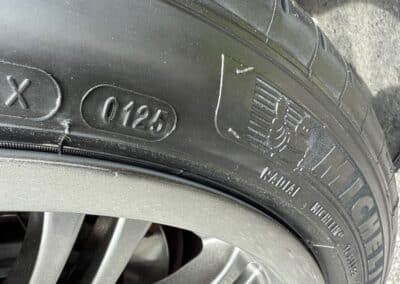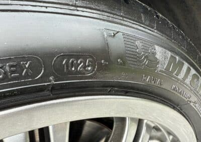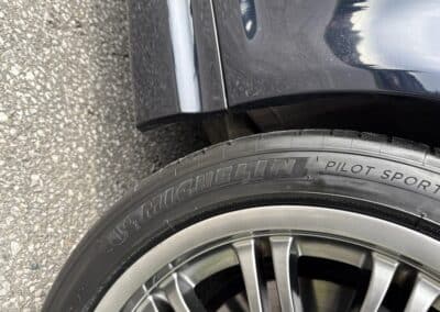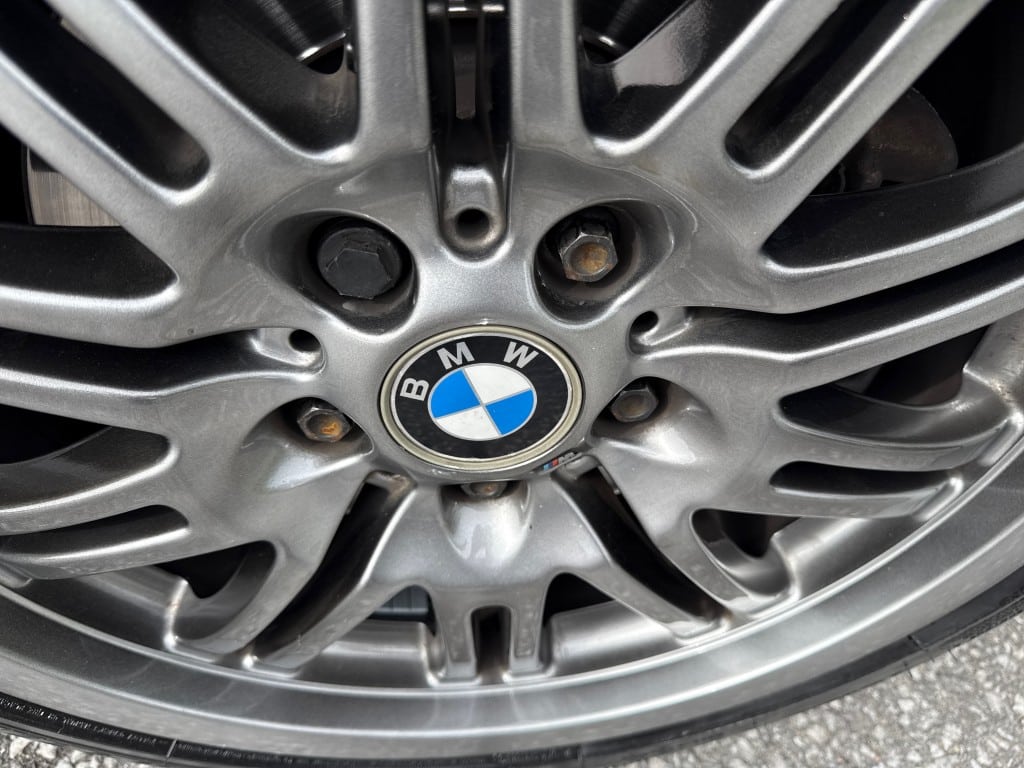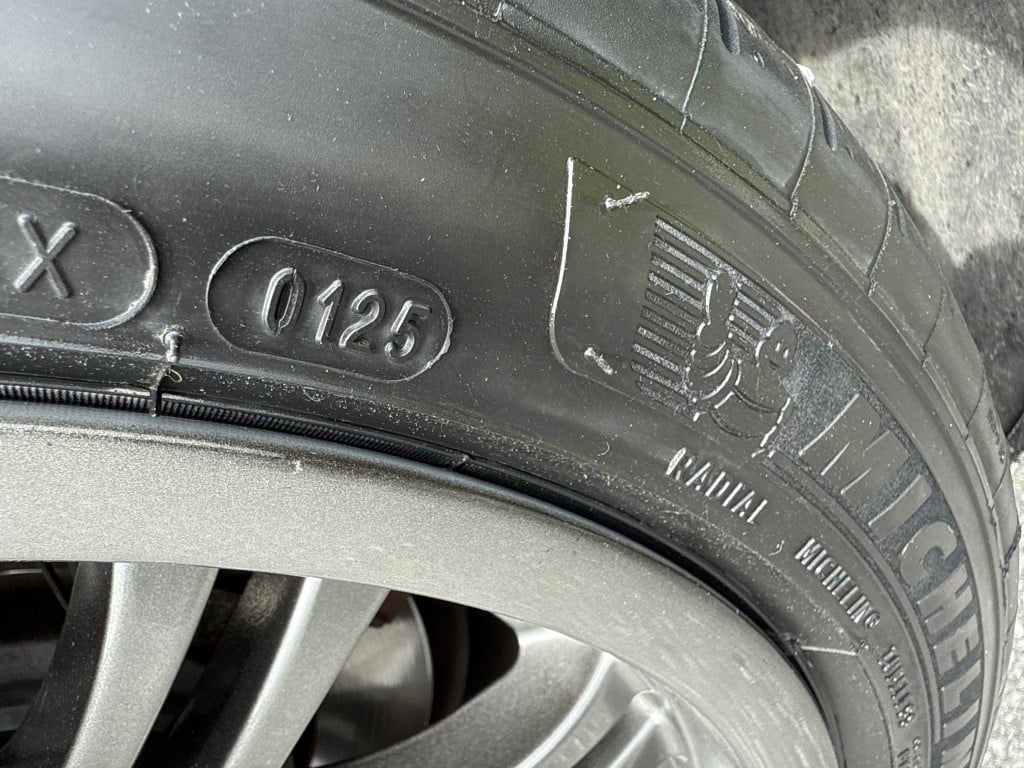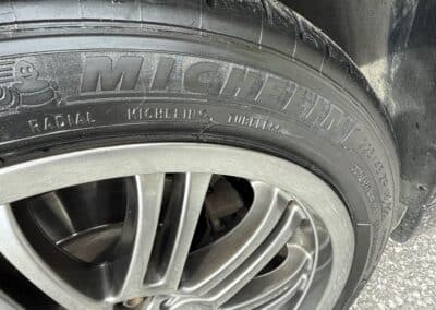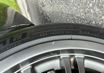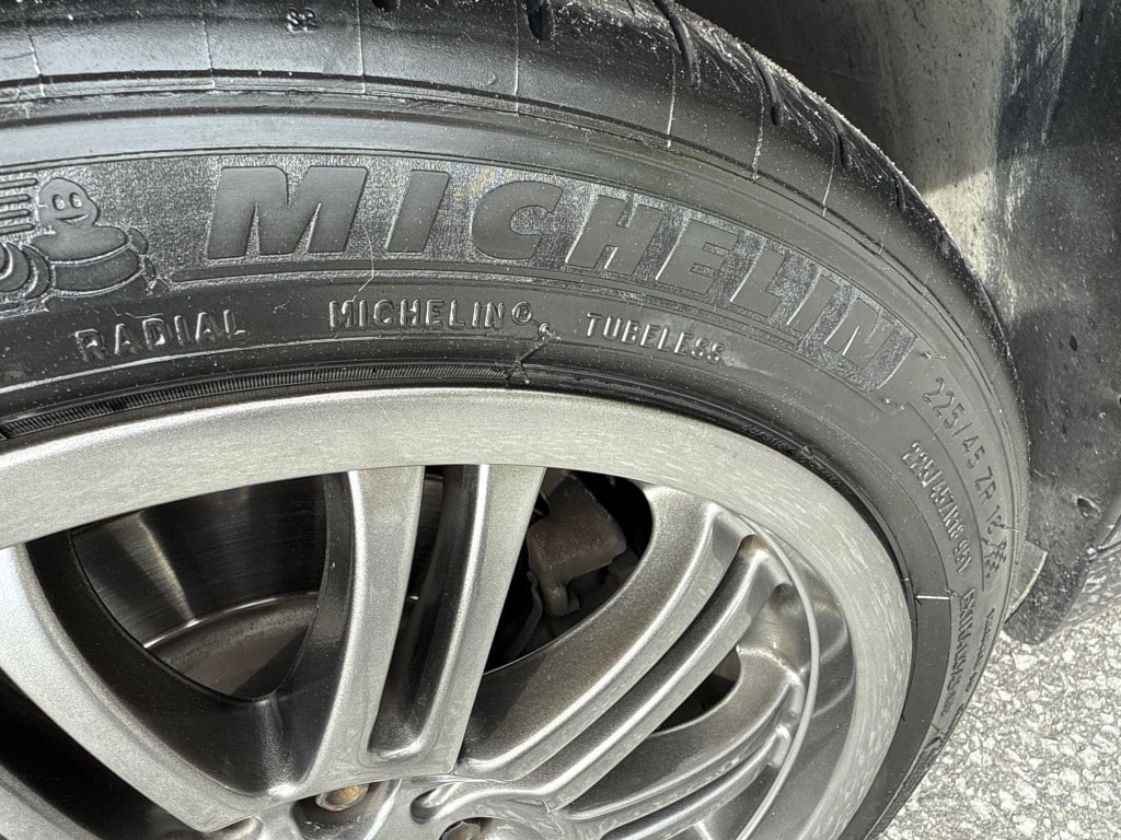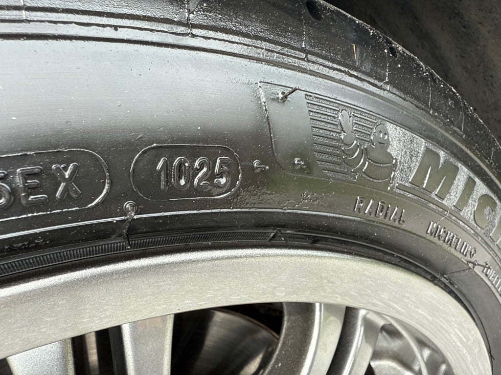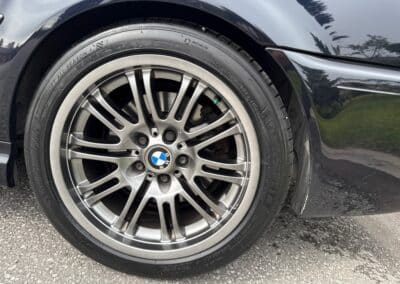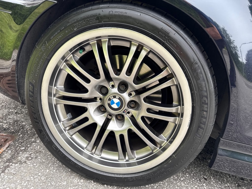 Factory staggered-width BMW Style 67 alloy wheels are fitted with Michelin Pilot Sport tires, all installed in May 2025. Date codes from the sidewalls show 0125 and 1025 production, and the seller notes minimal mileage since installation. Braking is handled by a power-assisted four-wheel anti-lock disc system, and suspension has been updated by replacement of the rear trailing arm bushings and installation of a limiter kit. A Strong Strut front strut bar is installed on the front shock towers. A wheel alignment was recently performed and brake fluid was flushed during current ownership.