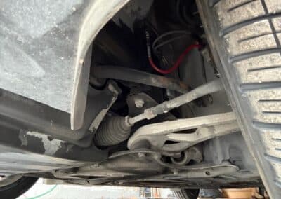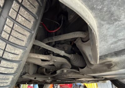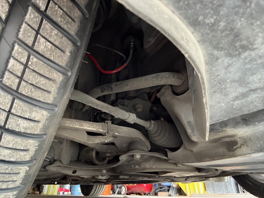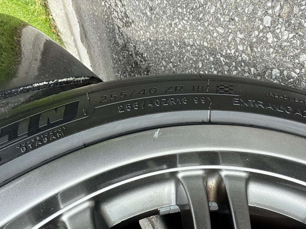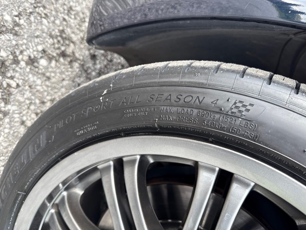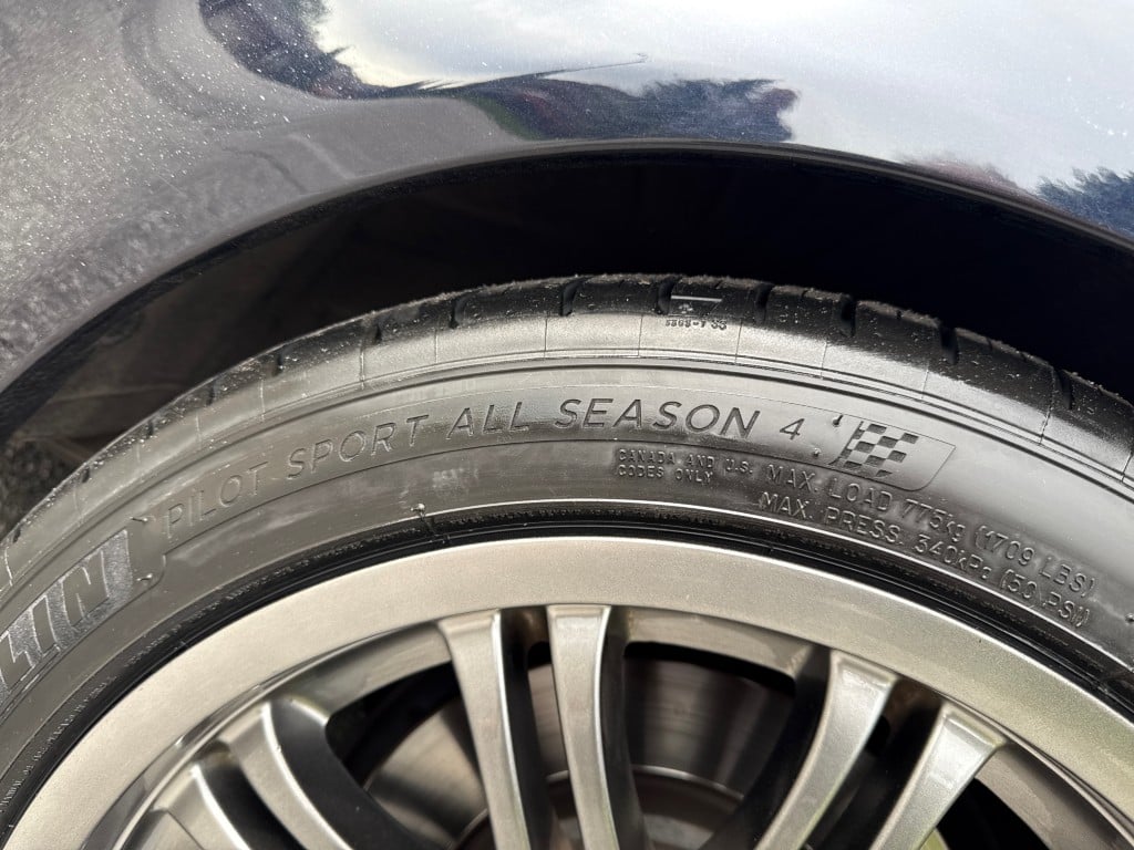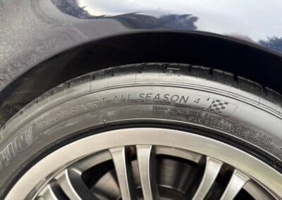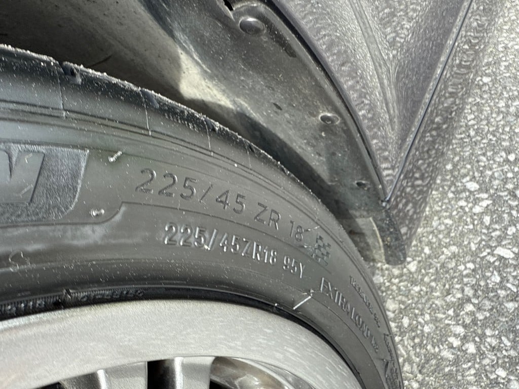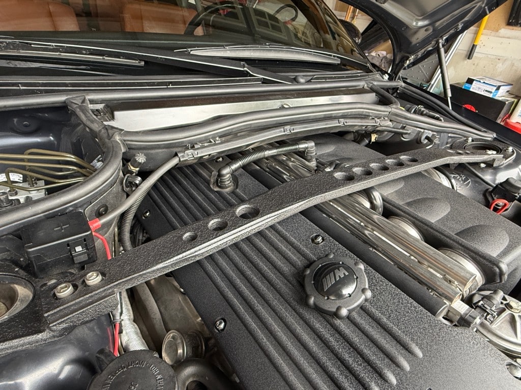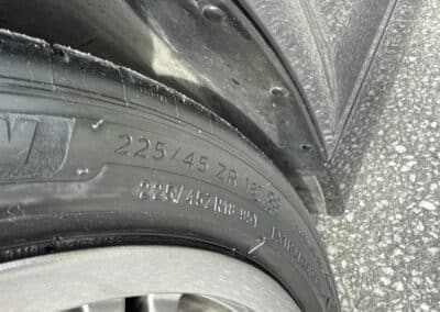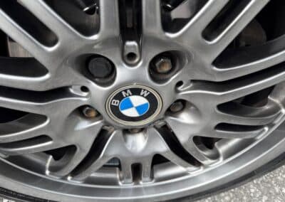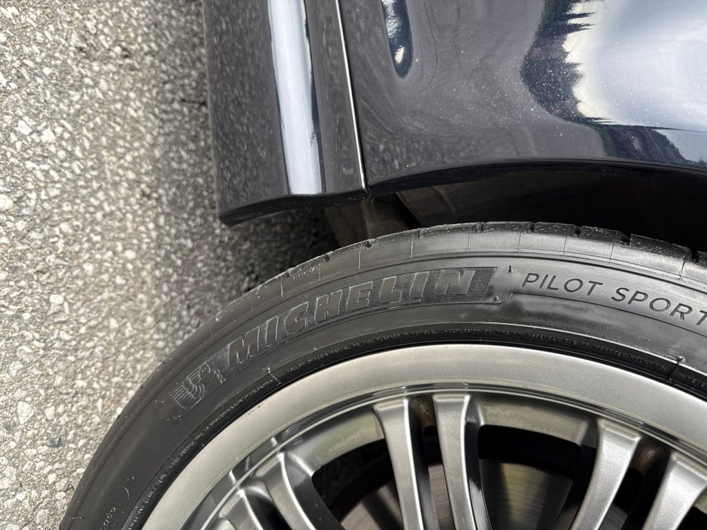 Factory staggered-width BMW Style 67 alloy wheels are fitted with Michelin Pilot Sport tires, all installed in May 2025. Date codes from the sidewalls show 0125 and 1025 production, and the seller notes minimal mileage since installation. Braking is handled by a power-assisted four-wheel anti-lock disc system, and suspension has been updated by replacement of the rear trailing arm bushings and installation of a limiter kit. A Strong Strut front strut bar is installed on the front shock towers. A wheel alignment was recently performed and brake fluid was flushed during current ownership.