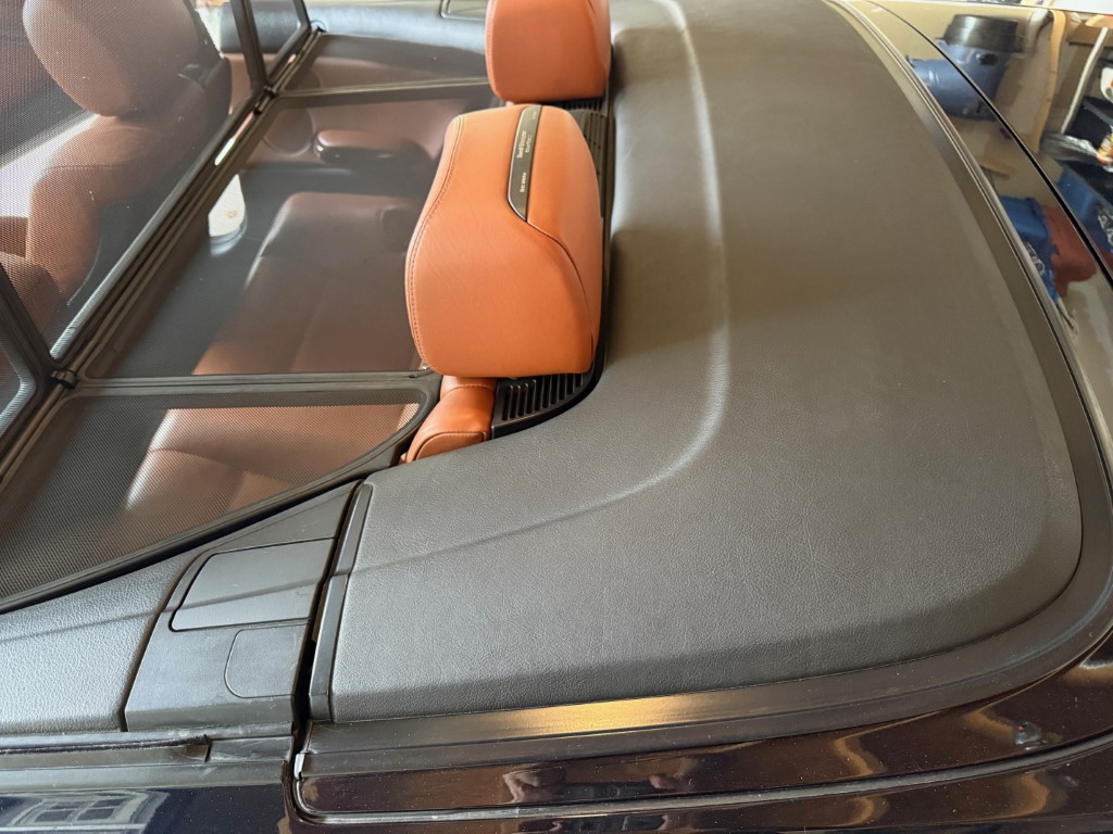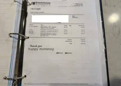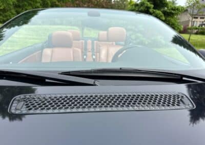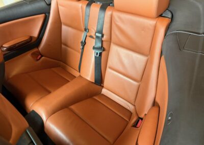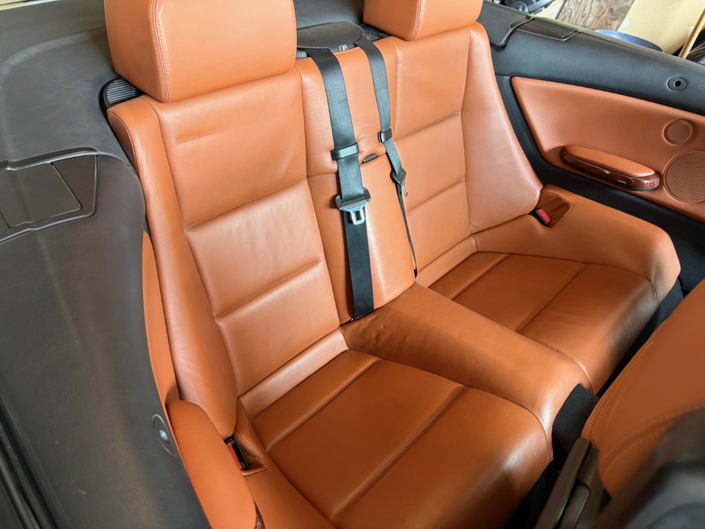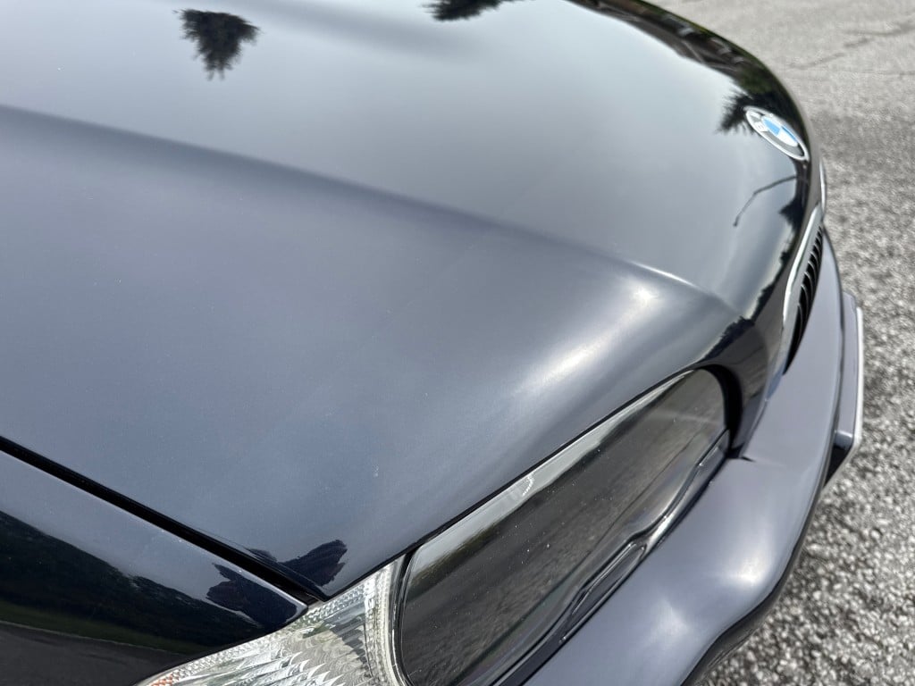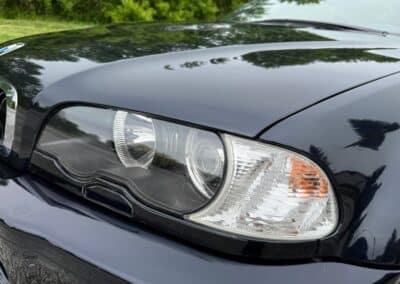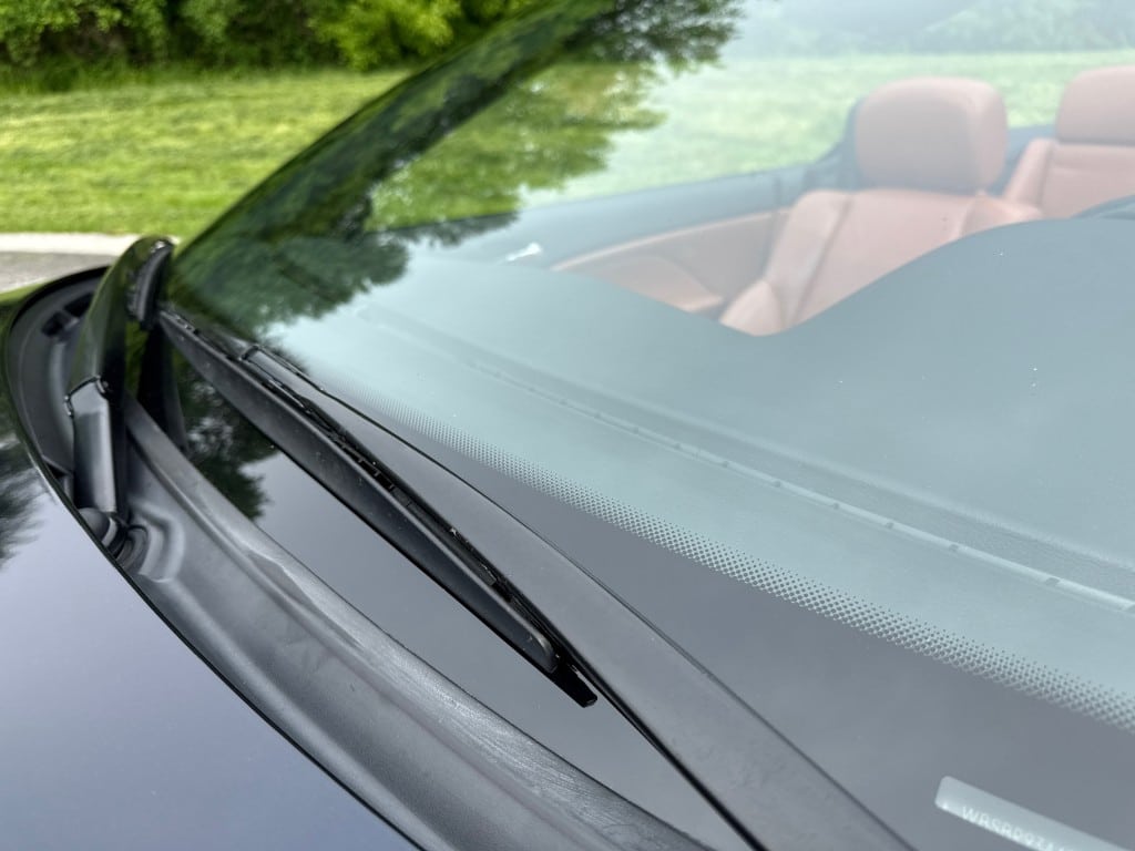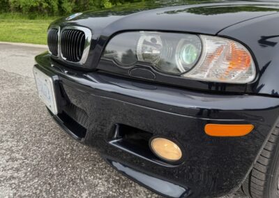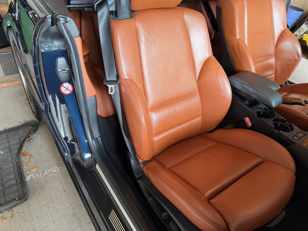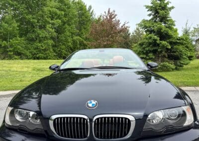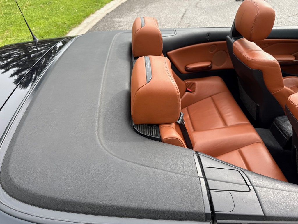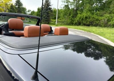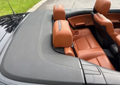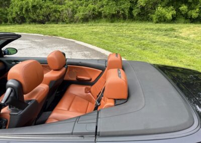 At the body shop’s recommendation, the seller opted to have the entire hood stripped and repainted, with blending carried out on the front fenders. The additional repairs were performed at the seller’s expense, as documented by invoices shown in images 263 and 264. An XPEL protective film (PPF) is installed on the front end of the car and the most forward-facing portions of the aerodynamic side mirrors. The black power-operated convertible soft top is shown operating in videos and additional photos are also available in the gallery. Other exterior features include Xenon low-beam headlights clear-lens side markers, round front fog lamps, dual exhaust outlets on each muffler for four total, and M3 badging.
