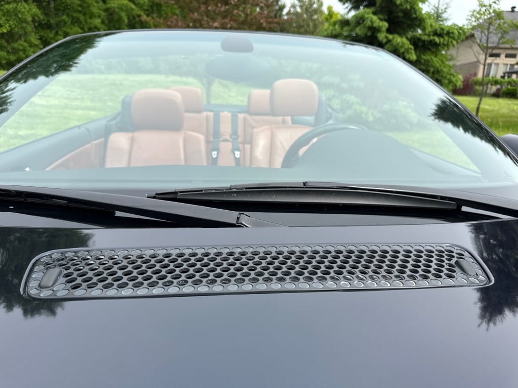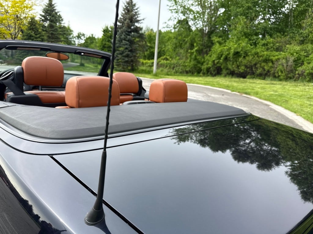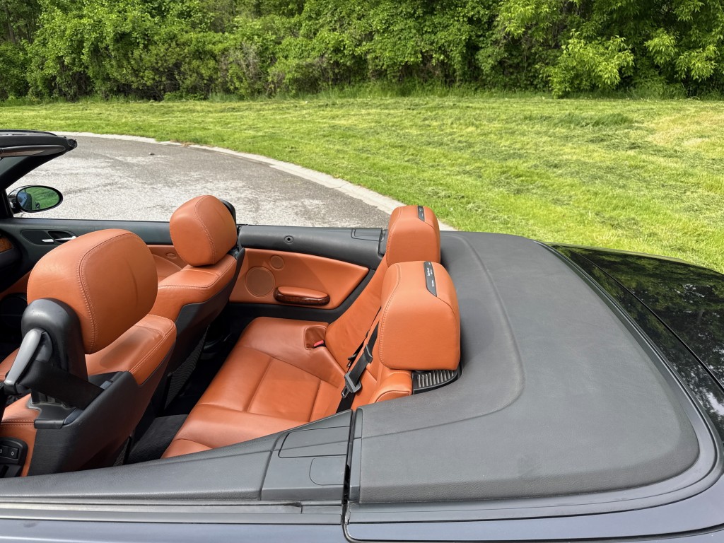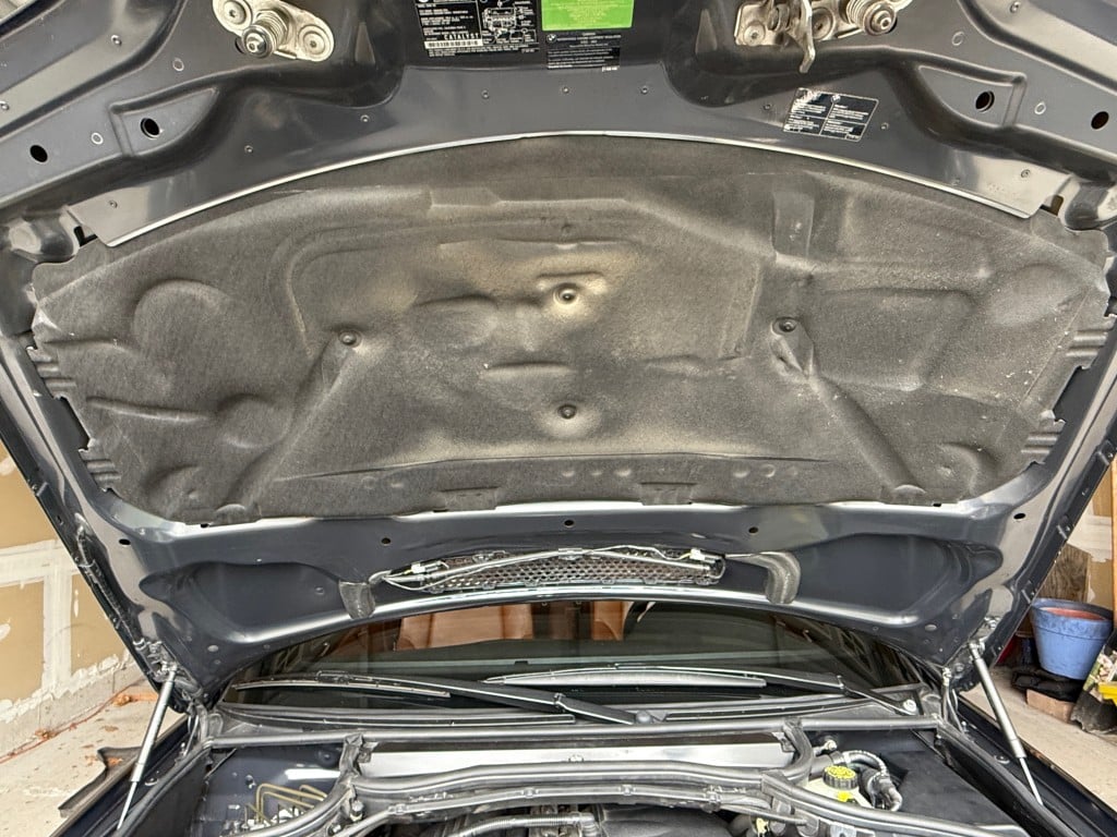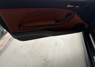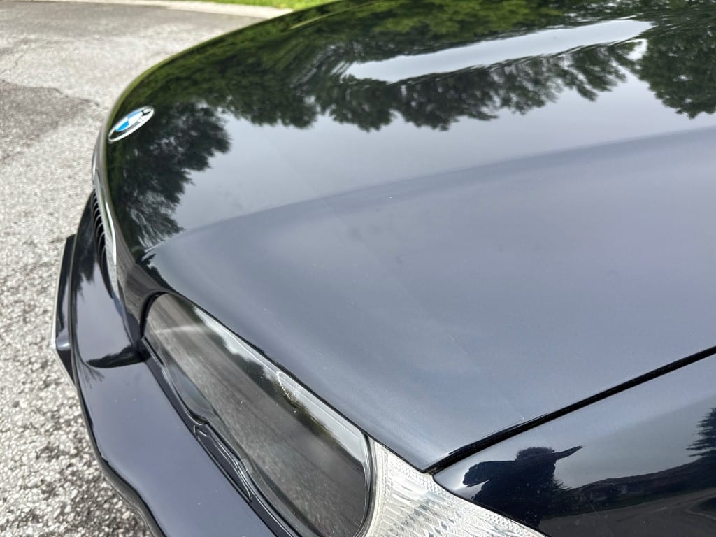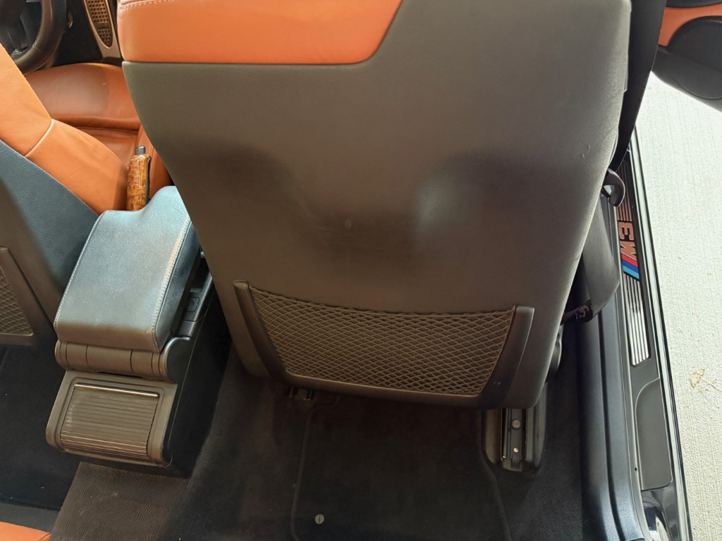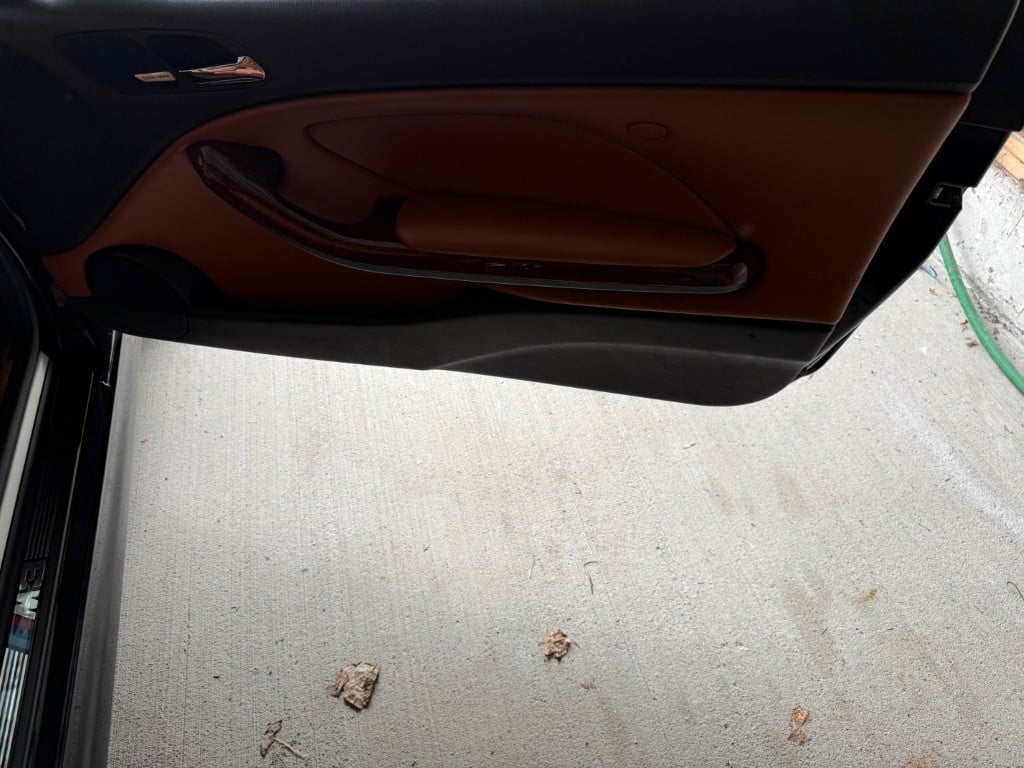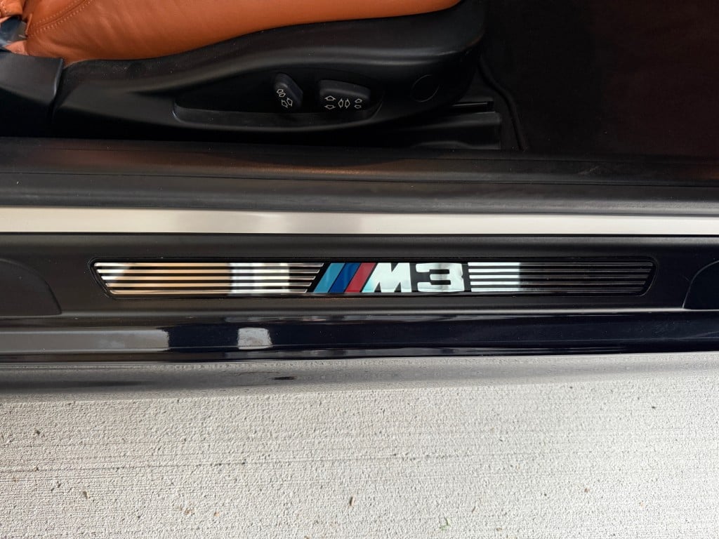 At the body shop’s recommendation, the seller opted to have the entire hood stripped and repainted, with blending carried out on the front fenders. The additional repairs were performed at the seller’s expense, as documented by invoices shown in images 263 and 264. An XPEL protective film (PPF) is installed on the front end of the car and the most forward-facing portions of the aerodynamic side mirrors. The black power-operated convertible soft top is shown operating in videos and additional photos are also available in the gallery. Other exterior features include Xenon low-beam headlights clear-lens side markers, round front fog lamps, dual exhaust outlets on each muffler for four total, and M3 badging.