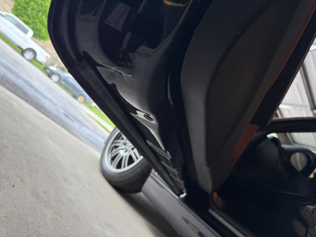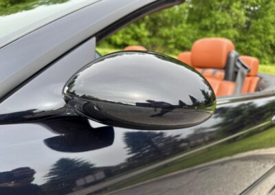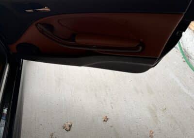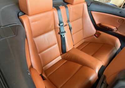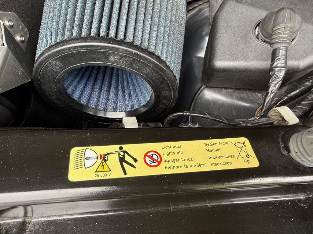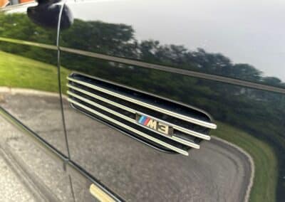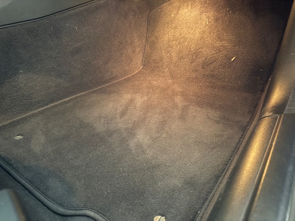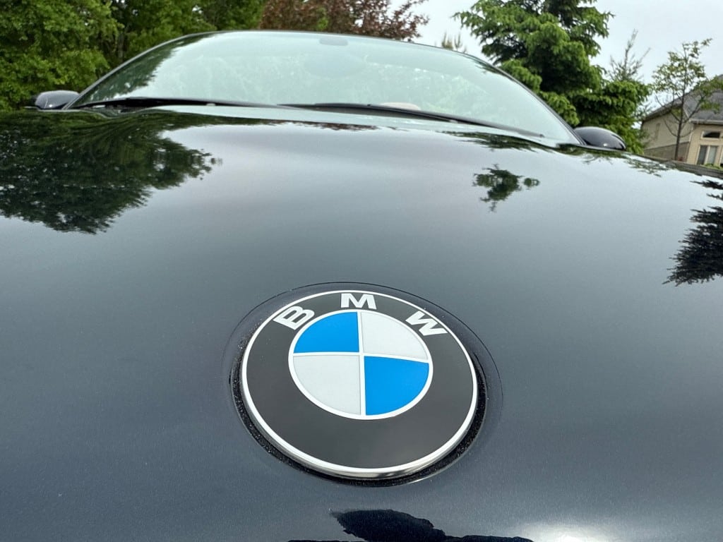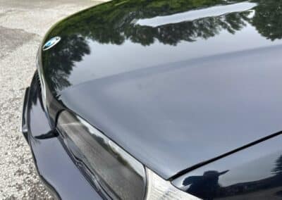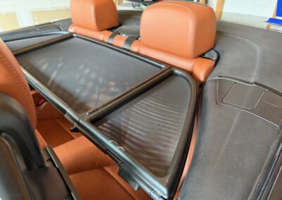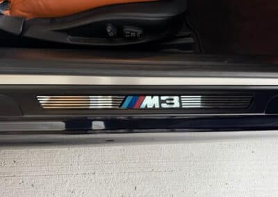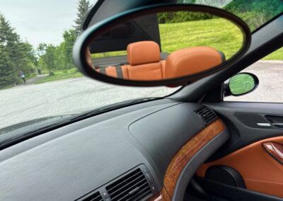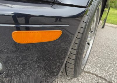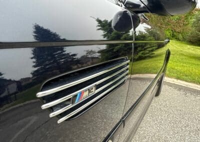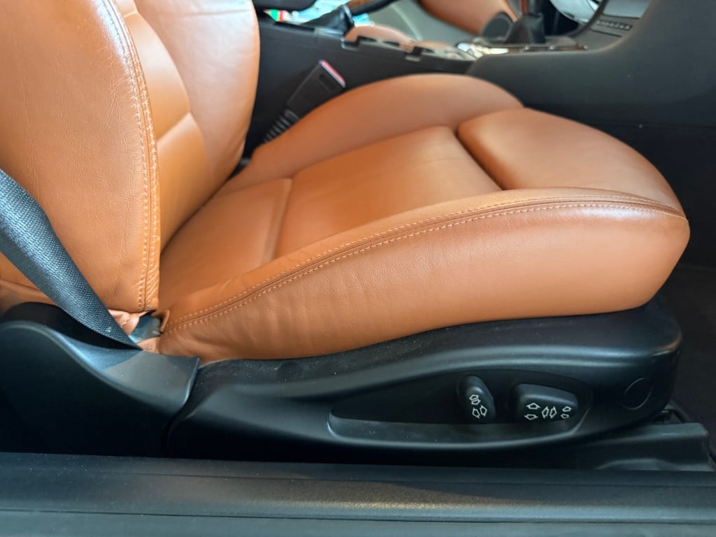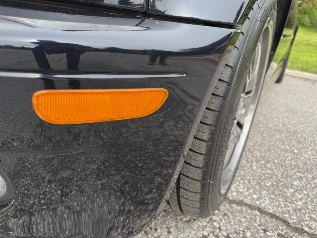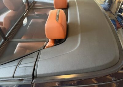 At the body shop’s recommendation, the seller opted to have the entire hood stripped and repainted, with blending carried out on the front fenders. The additional repairs were performed at the seller’s expense, as documented by invoices shown in images 263 and 264. An XPEL protective film (PPF) is installed on the front end of the car and the most forward-facing portions of the aerodynamic side mirrors. The black power-operated convertible soft top is shown operating in videos and additional photos are also available in the gallery. Other exterior features include Xenon low-beam headlights clear-lens side markers, round front fog lamps, dual exhaust outlets on each muffler for four total, and M3 badging.