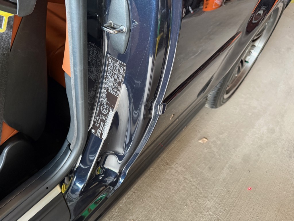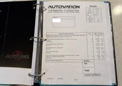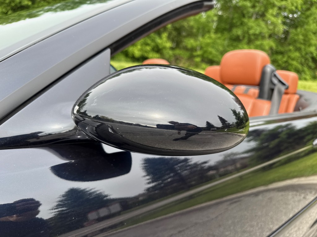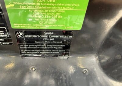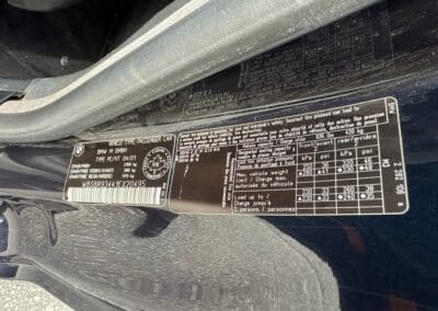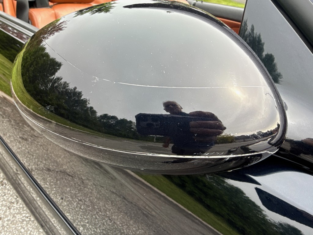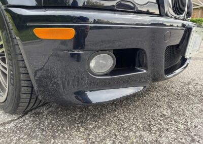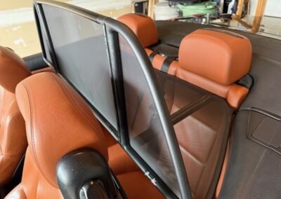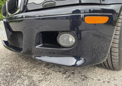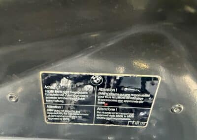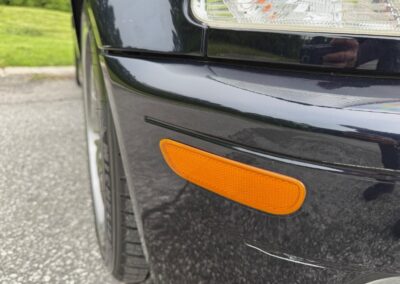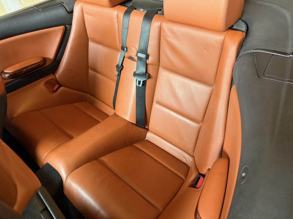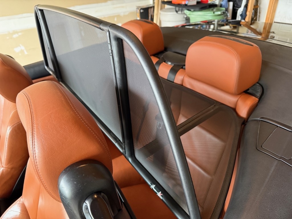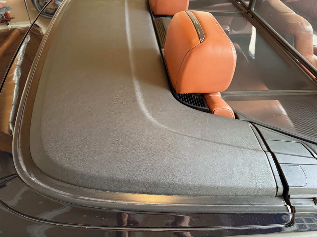 At the body shop’s recommendation, the seller opted to have the entire hood stripped and repainted, with blending carried out on the front fenders. The additional repairs were performed at the seller’s expense, as documented by invoices shown in images 263 and 264. An XPEL protective film (PPF) is installed on the front end of the car and the most forward-facing portions of the aerodynamic side mirrors. The black power-operated convertible soft top is shown operating in videos and additional photos are also available in the gallery. Other exterior features include Xenon low-beam headlights clear-lens side markers, round front fog lamps, dual exhaust outlets on each muffler for four total, and M3 badging.