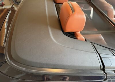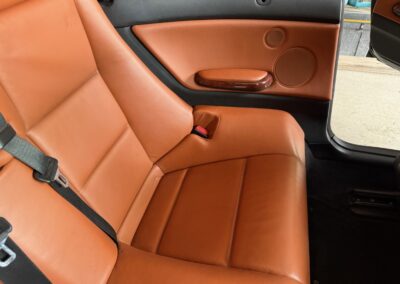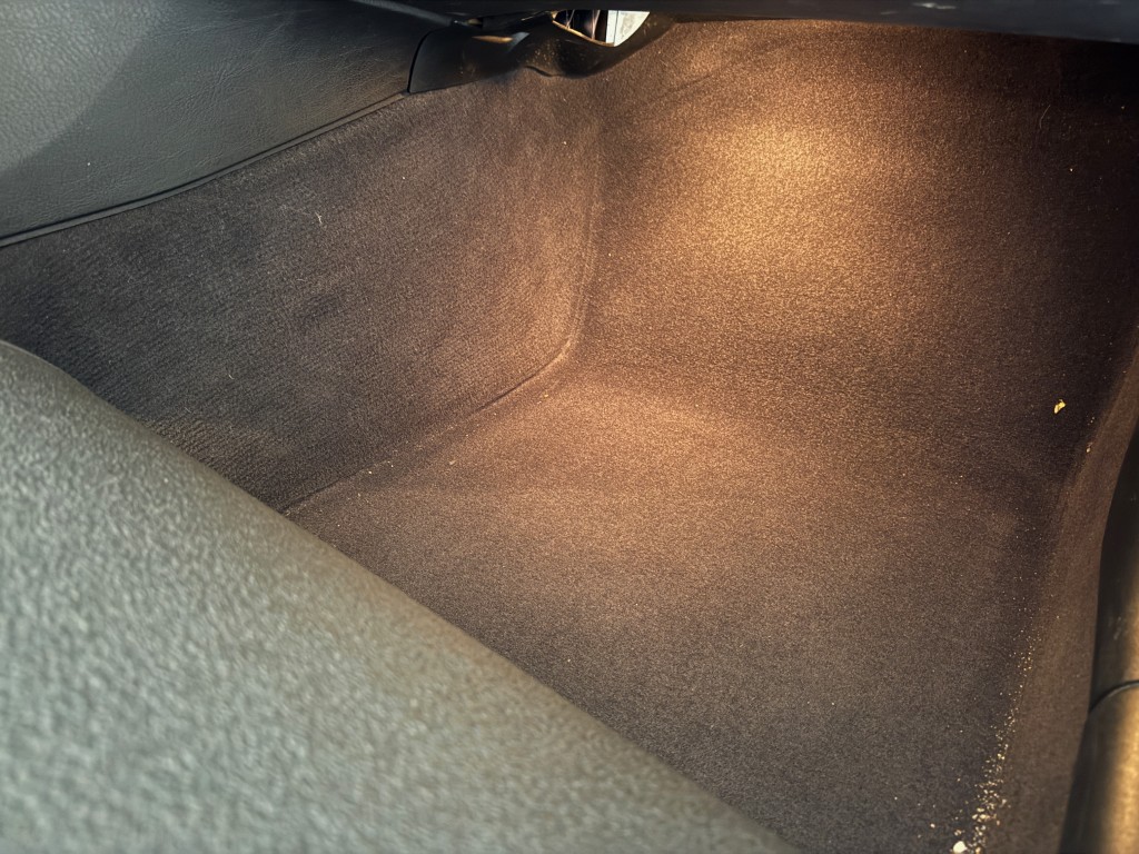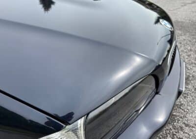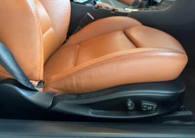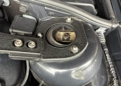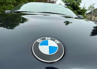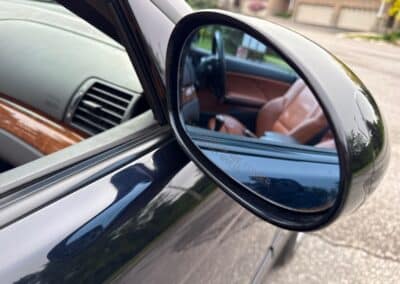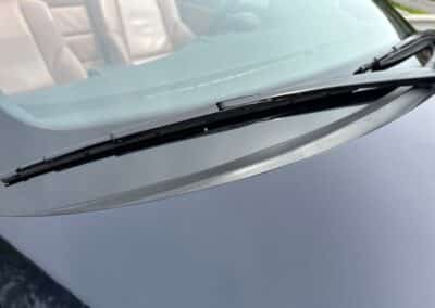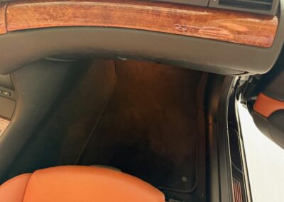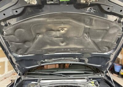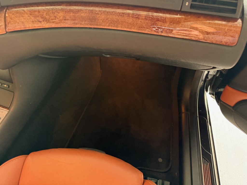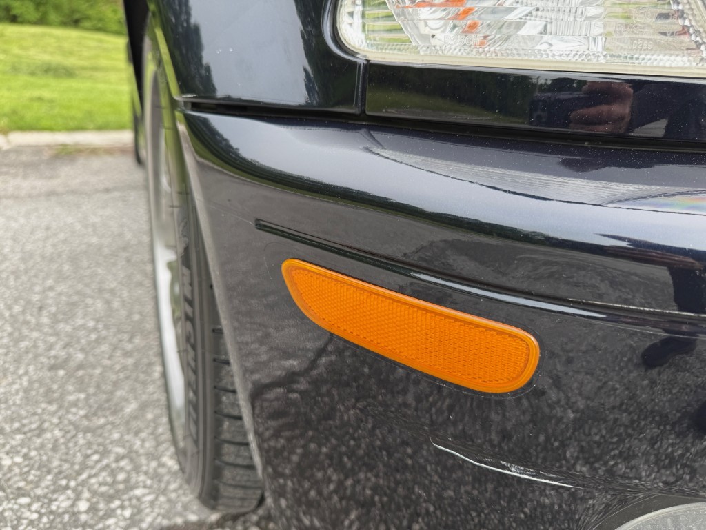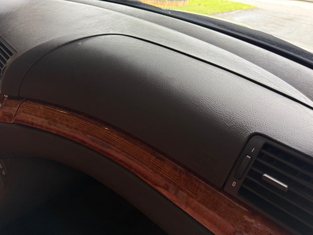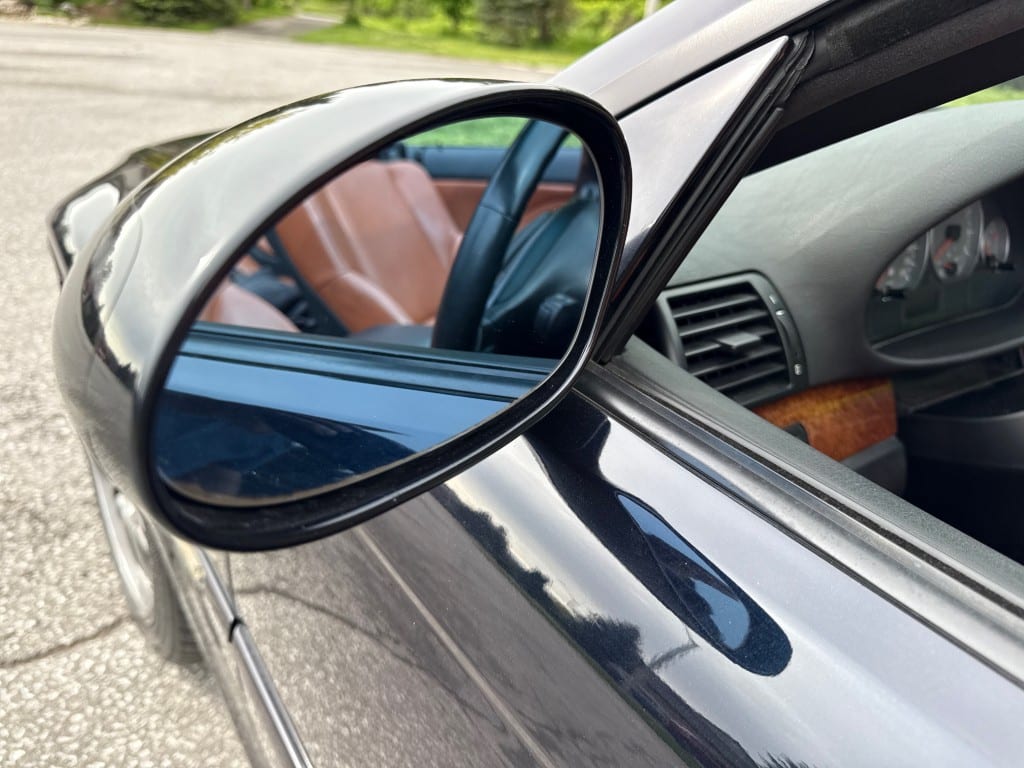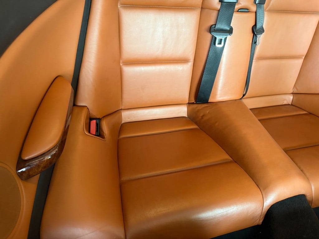 At the body shop’s recommendation, the seller opted to have the entire hood stripped and repainted, with blending carried out on the front fenders. The additional repairs were performed at the seller’s expense, as documented by invoices shown in images 263 and 264. An XPEL protective film (PPF) is installed on the front end of the car and the most forward-facing portions of the aerodynamic side mirrors. The black power-operated convertible soft top is shown operating in videos and additional photos are also available in the gallery. Other exterior features include Xenon low-beam headlights clear-lens side markers, round front fog lamps, dual exhaust outlets on each muffler for four total, and M3 badging.