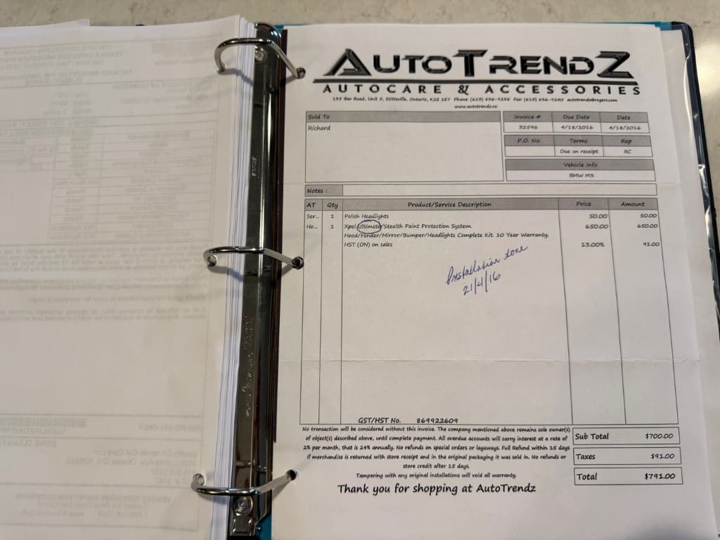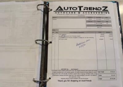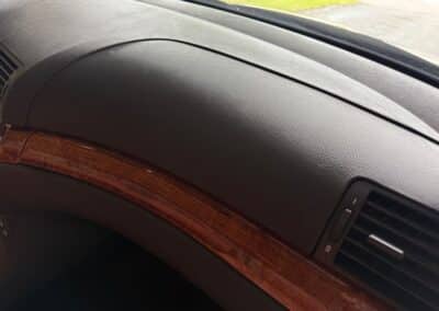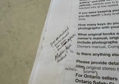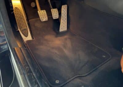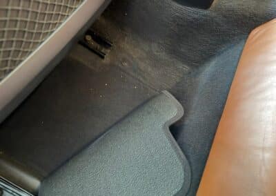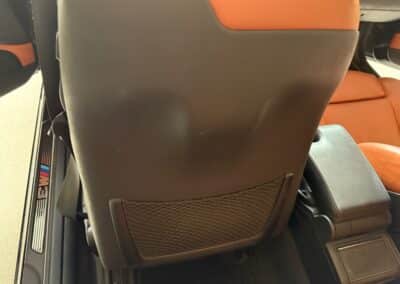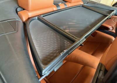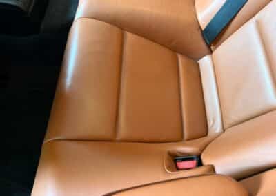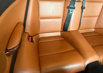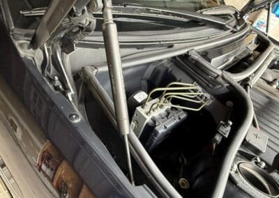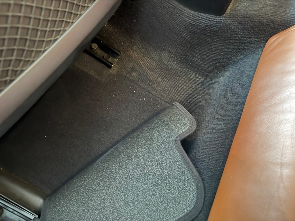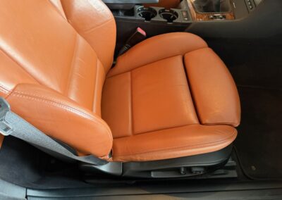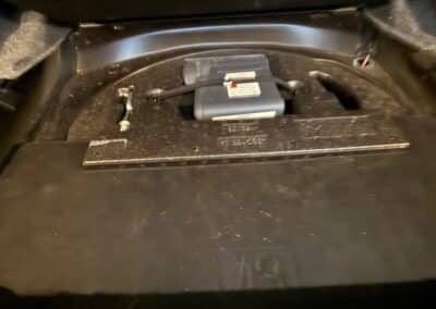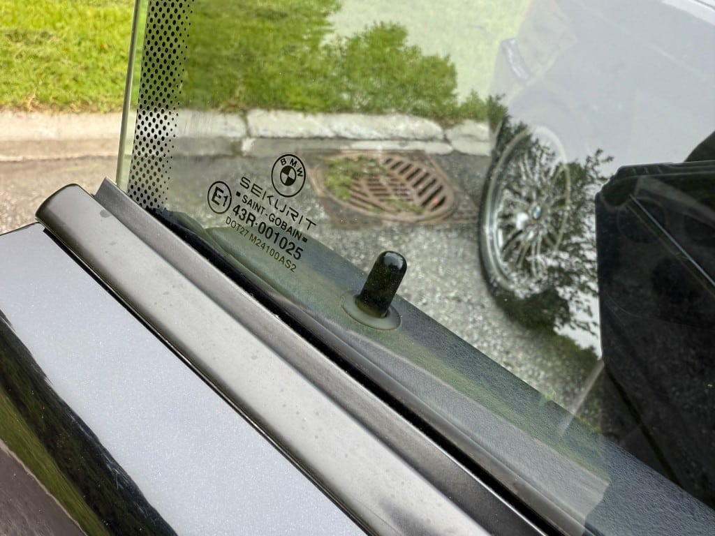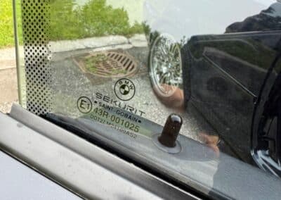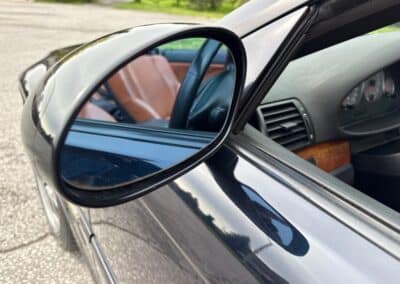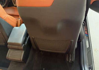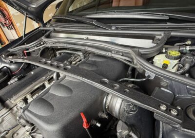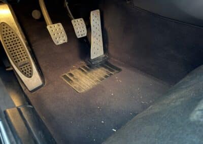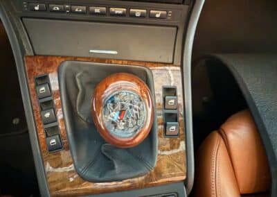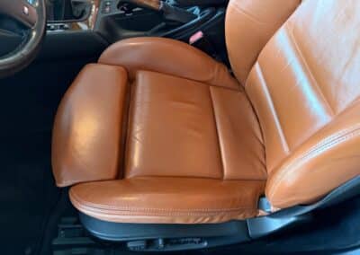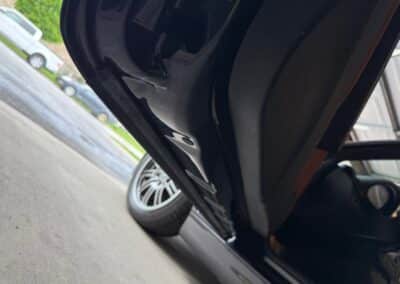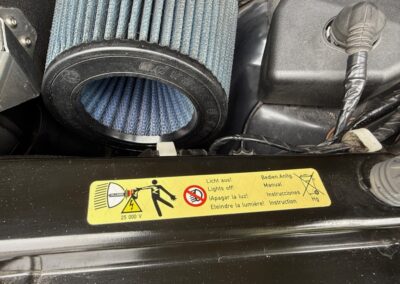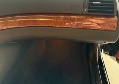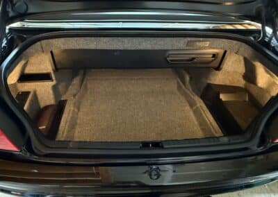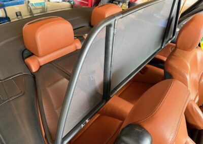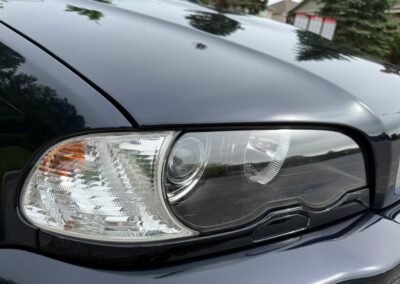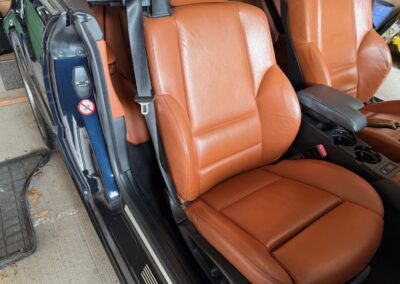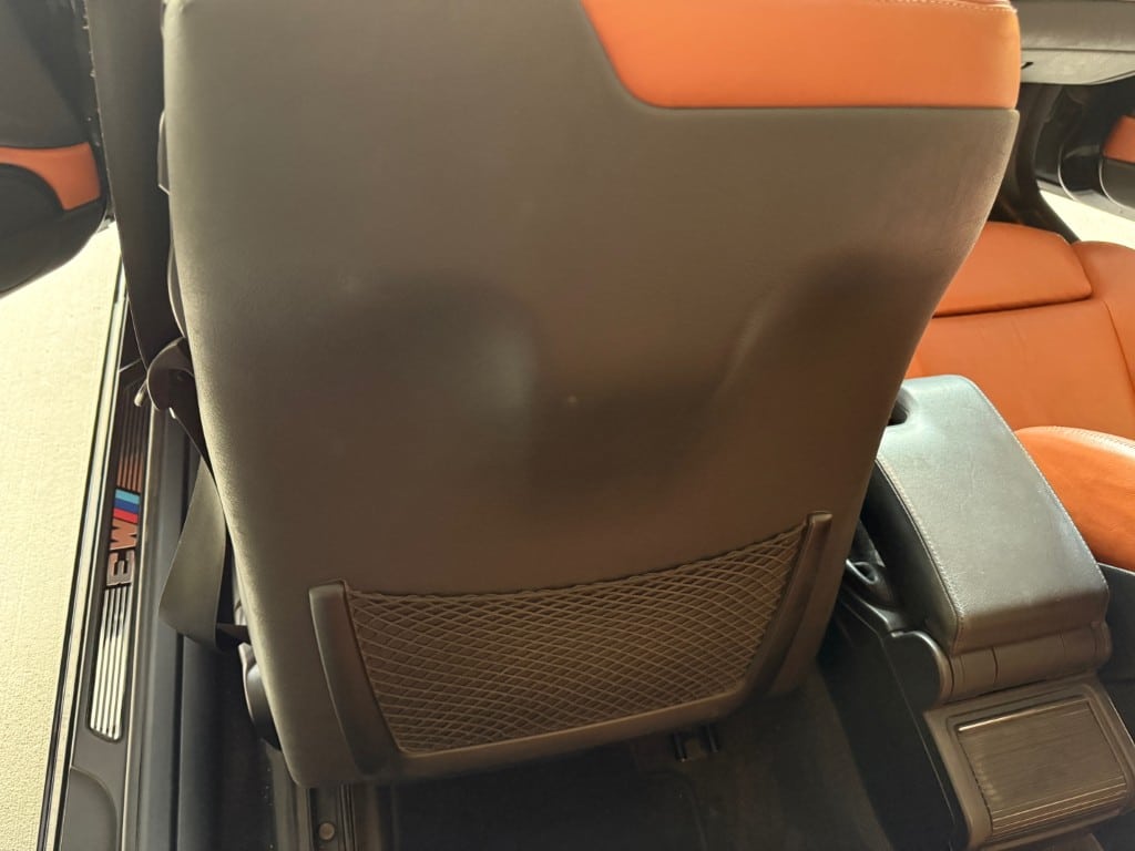 At the body shop’s recommendation, the seller opted to have the entire hood stripped and repainted, with blending carried out on the front fenders. The additional repairs were performed at the seller’s expense, as documented by invoices shown in images 263 and 264. An XPEL protective film (PPF) is installed on the front end of the car and the most forward-facing portions of the aerodynamic side mirrors. The black power-operated convertible soft top is shown operating in videos and additional photos are also available in the gallery. Other exterior features include Xenon low-beam headlights clear-lens side markers, round front fog lamps, dual exhaust outlets on each muffler for four total, and M3 badging.