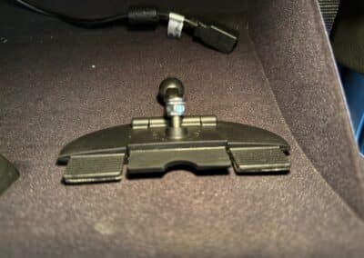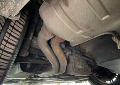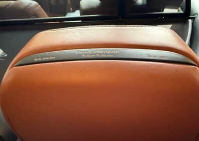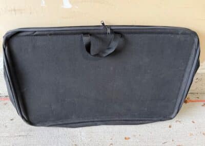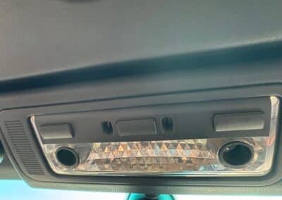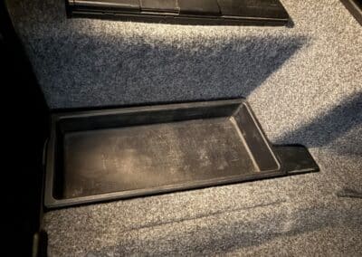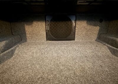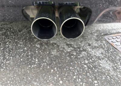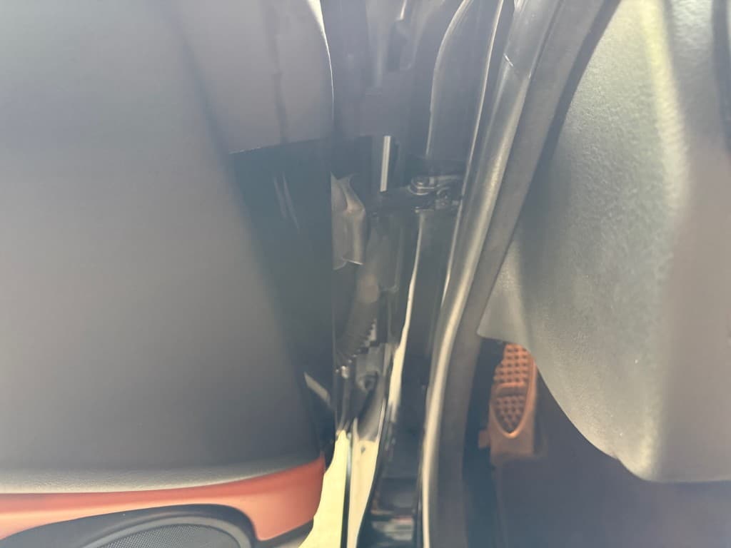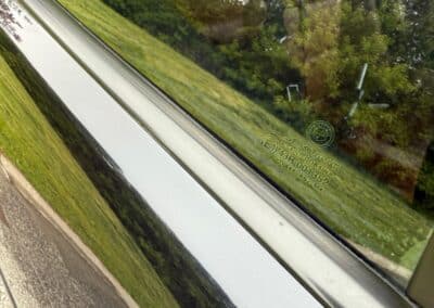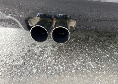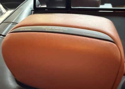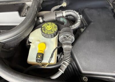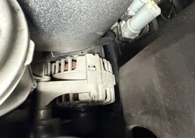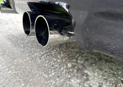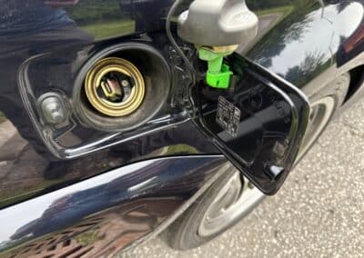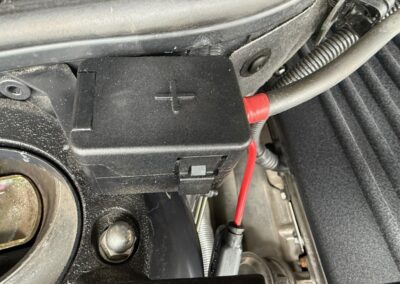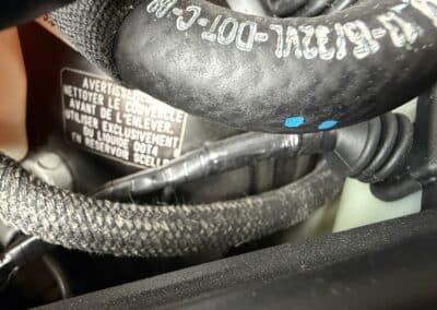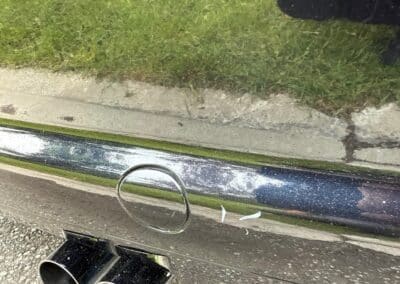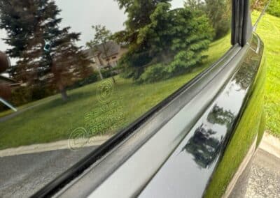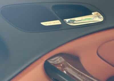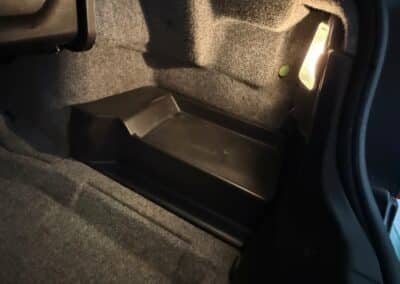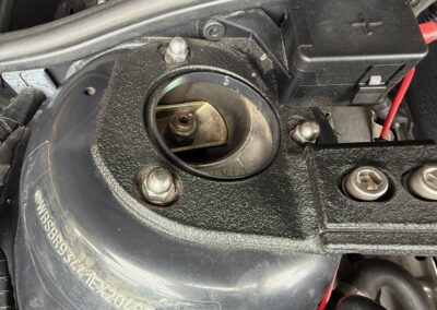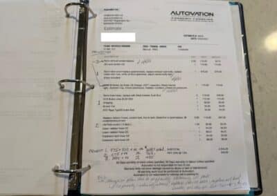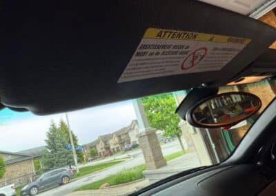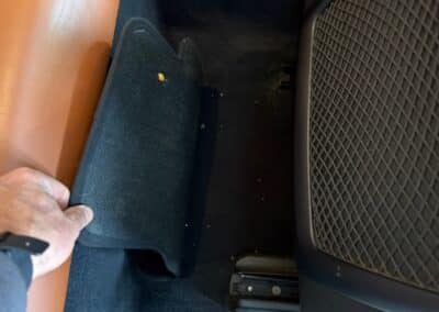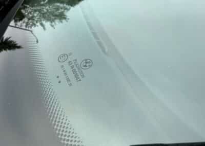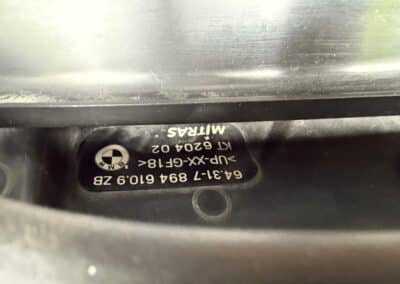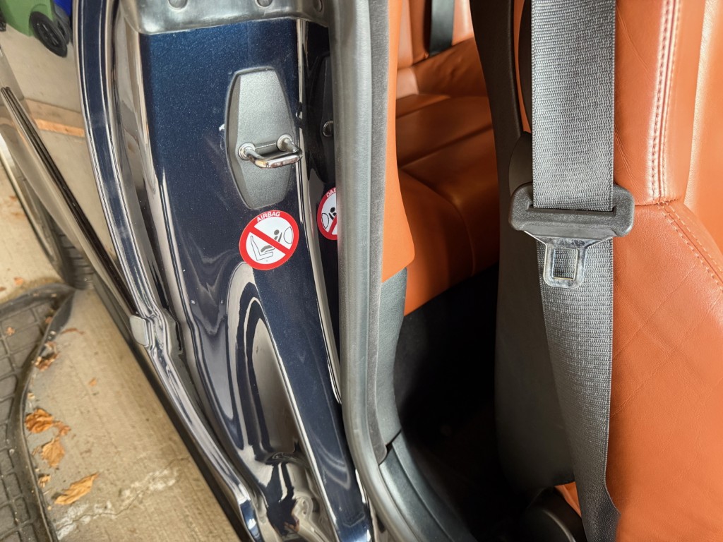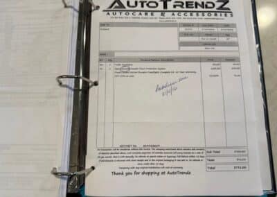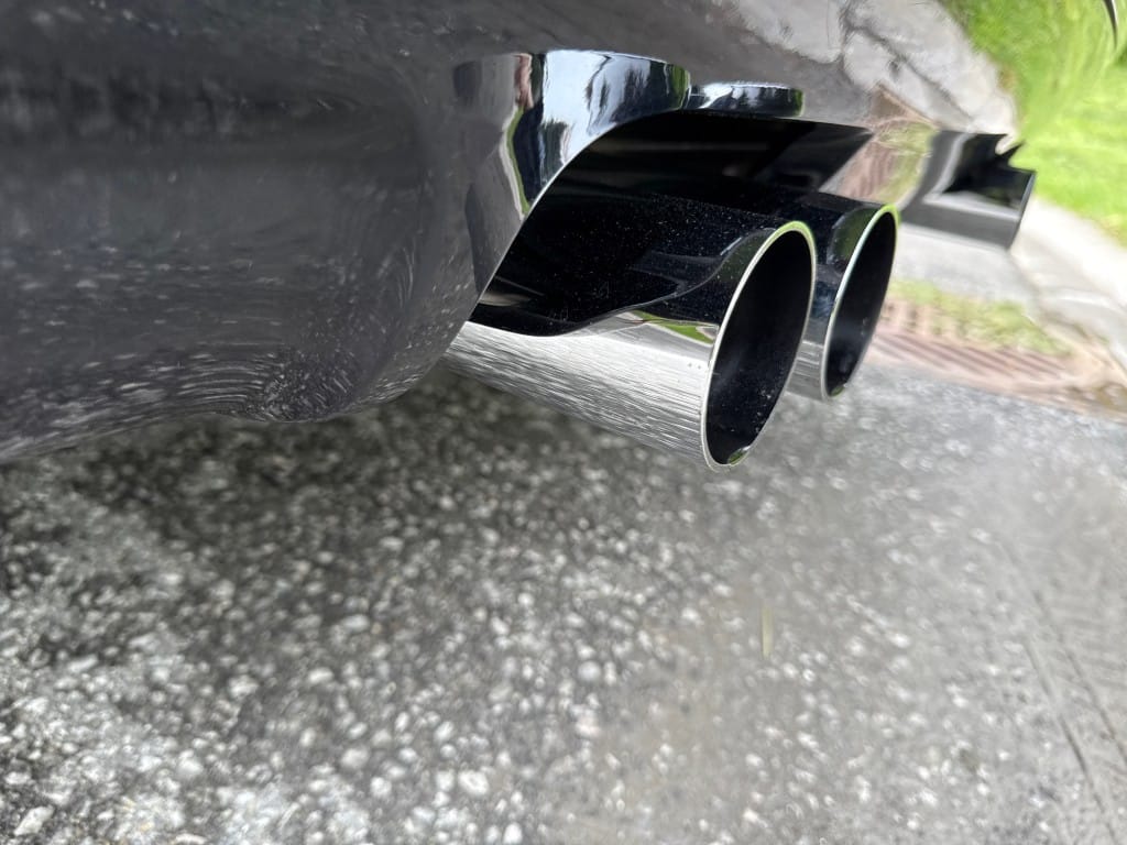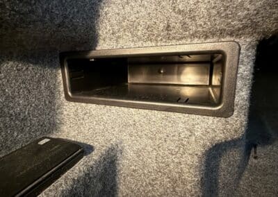 At the body shop’s recommendation, the seller opted to have the entire hood stripped and repainted, with blending carried out on the front fenders. The additional repairs were performed at the seller’s expense, as documented by invoices shown in images 263 and 264. An XPEL protective film (PPF) is installed on the front end of the car and the most forward-facing portions of the aerodynamic side mirrors. The black power-operated convertible soft top is shown operating in videos and additional photos are also available in the gallery. Other exterior features include Xenon low-beam headlights clear-lens side markers, round front fog lamps, dual exhaust outlets on each muffler for four total, and M3 badging.