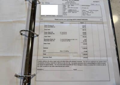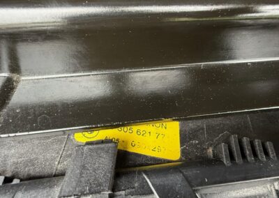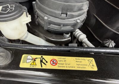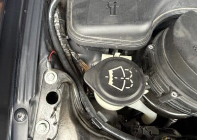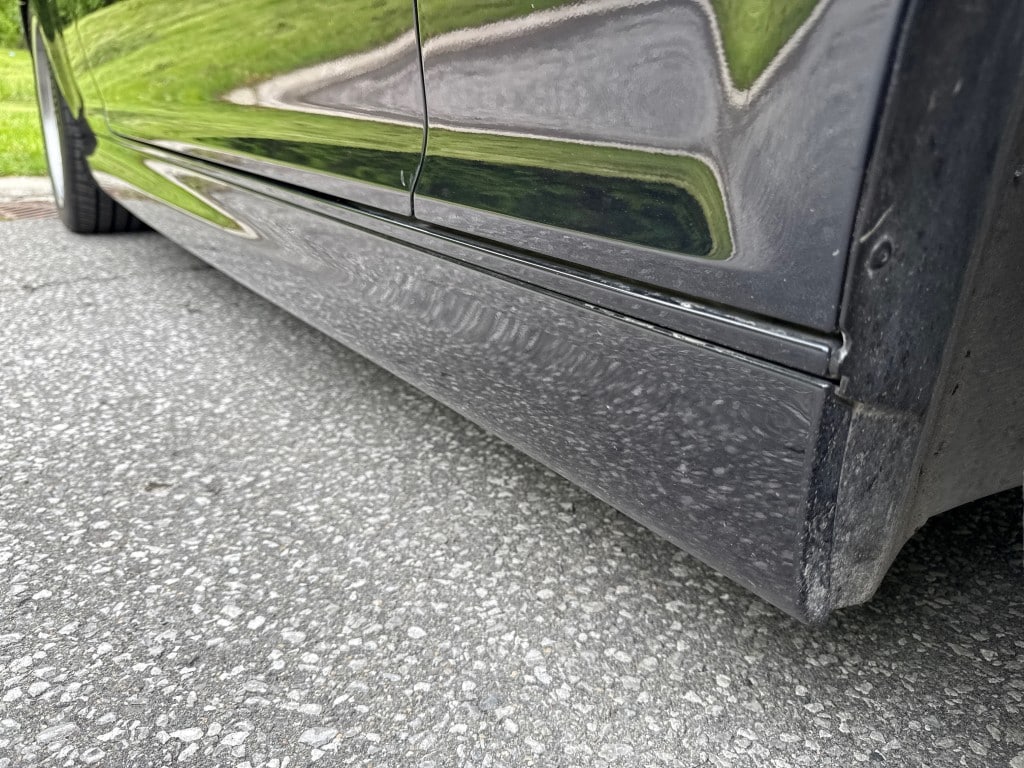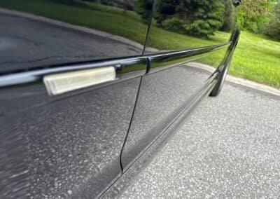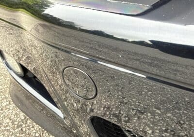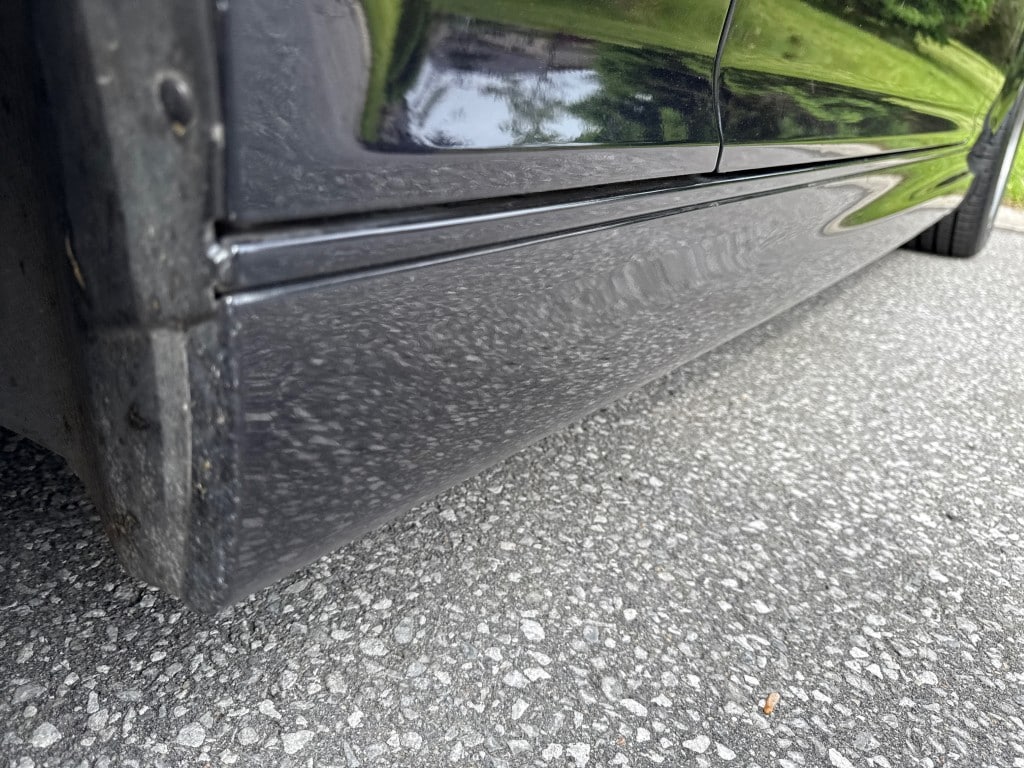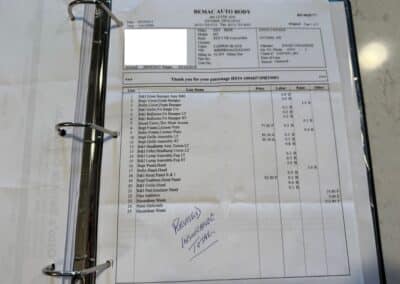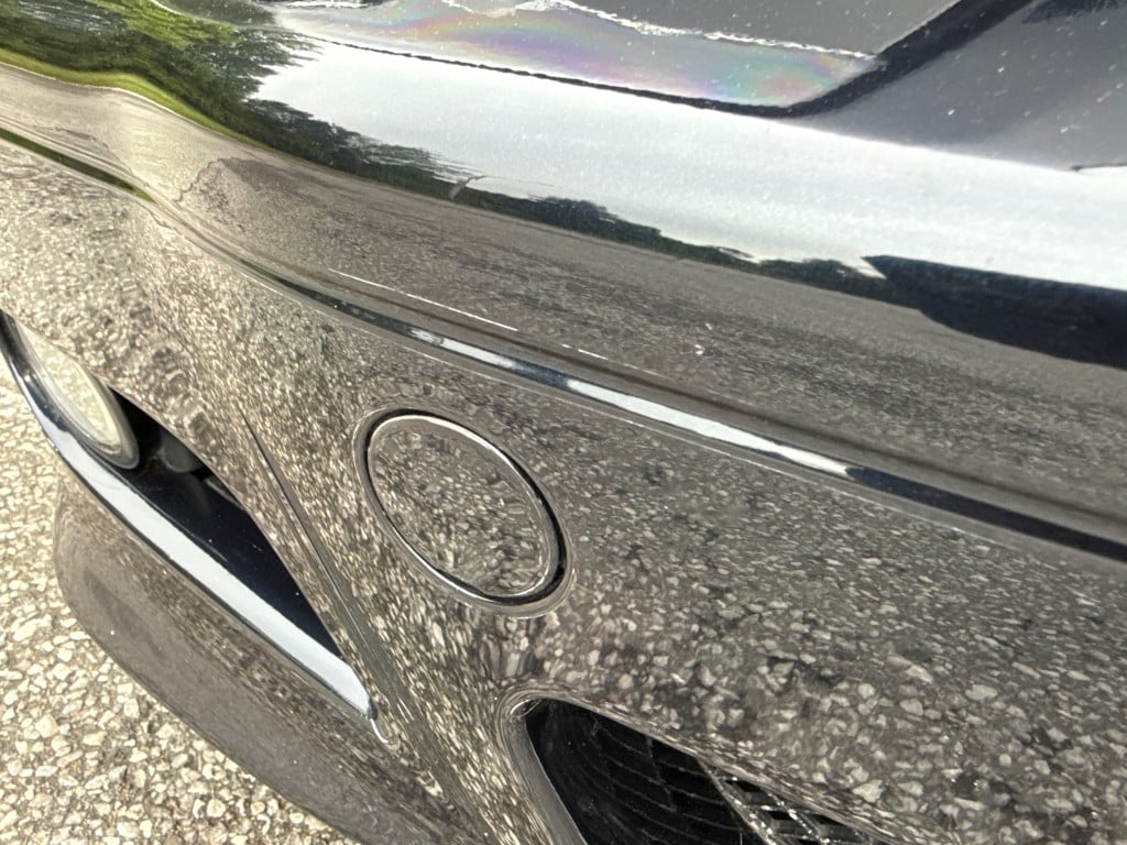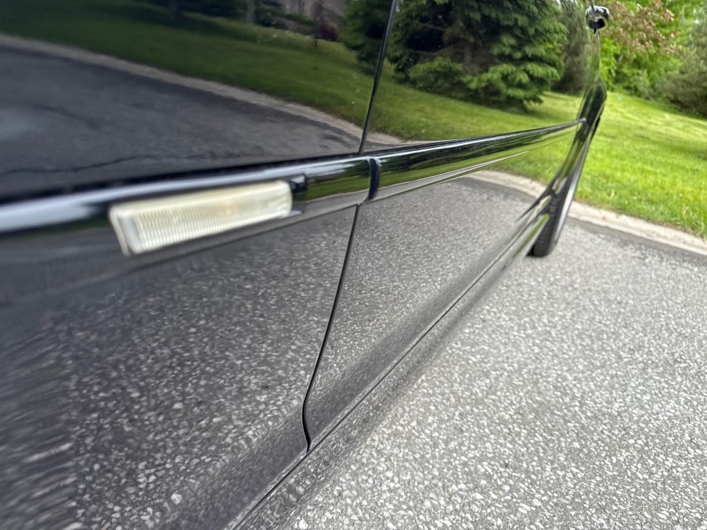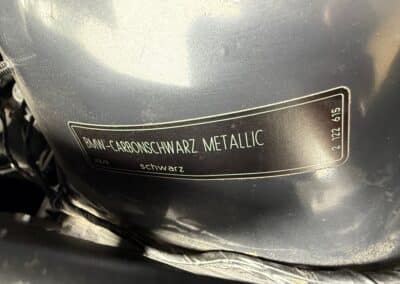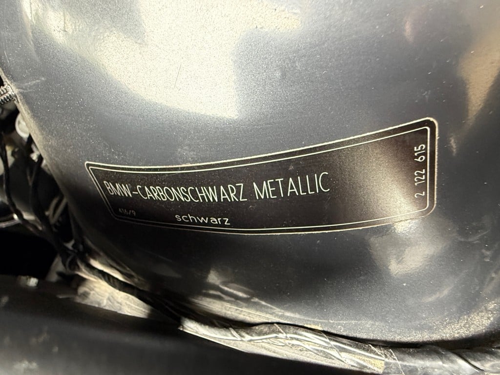 The exterior is finished in Carbon Black Metallic (Carbonschwarz metallic on the German language label on the driver’s front shock tower). The seller advises that the front end was refinished following a minor incident in which the vehicle was backed into at low speed, noted on the Carfax as an insurance of under $1,600. The initial insurance repair quote, shown in gallery images 261 and 262, included partial refinishing of the hood and blending into adjacent panels, along with the replacement of the hood emblem and grill assemblies.