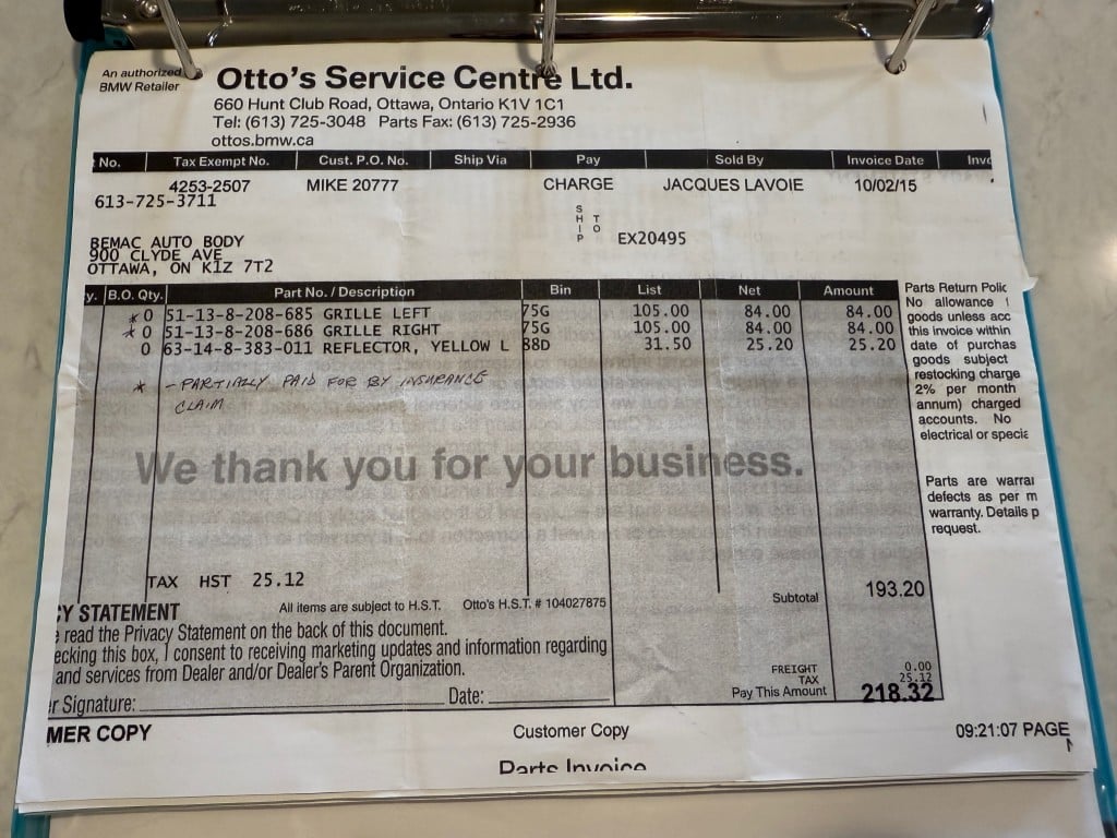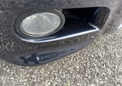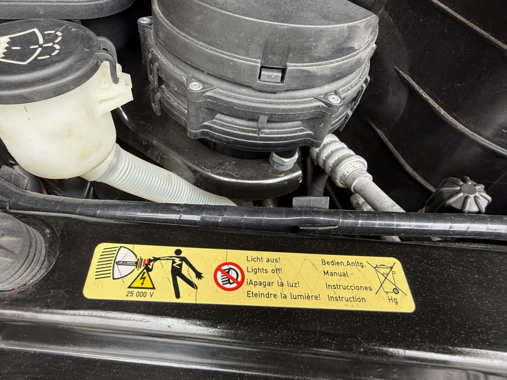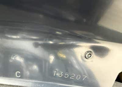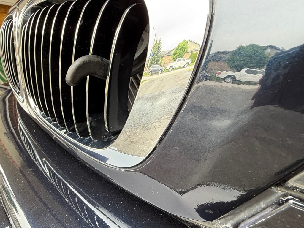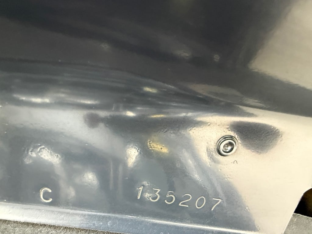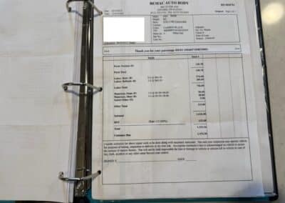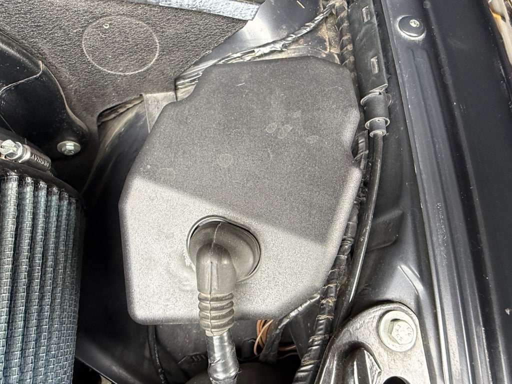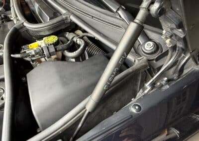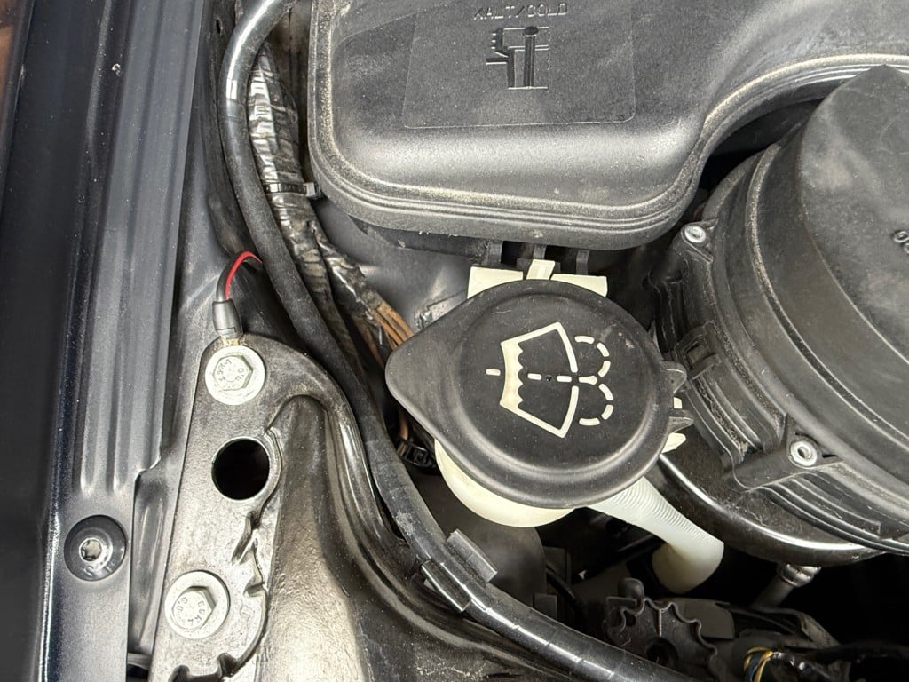 The exterior is finished in Carbon Black Metallic (Carbonschwarz metallic on the German language label on the driver’s front shock tower). The seller advises that the front end was refinished following a minor incident in which the vehicle was backed into at low speed, noted on the Carfax as an insurance of under $1,600. The initial insurance repair quote, shown in gallery images 261 and 262, included partial refinishing of the hood and blending into adjacent panels, along with the replacement of the hood emblem and grill assemblies.