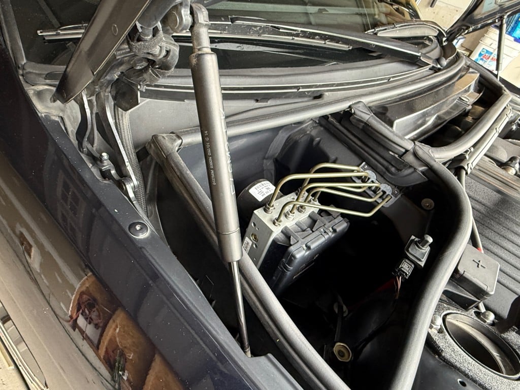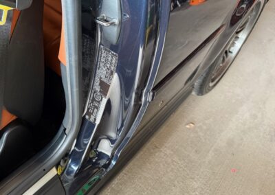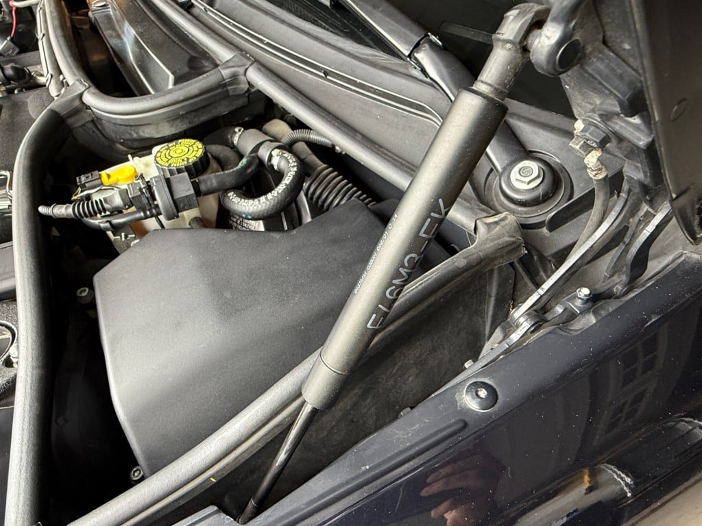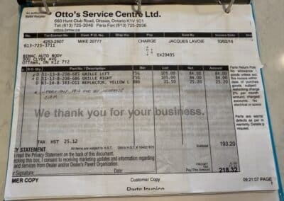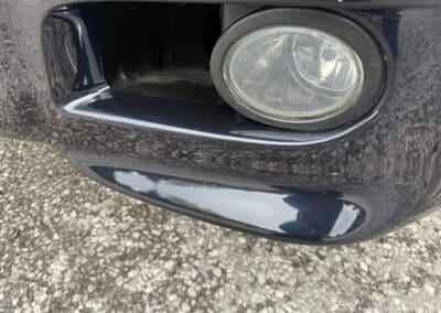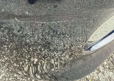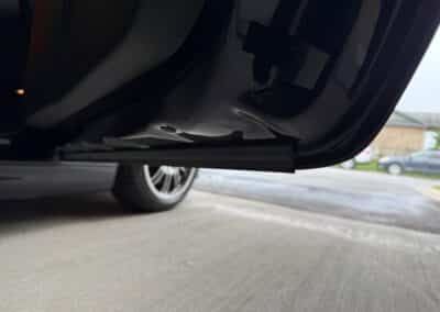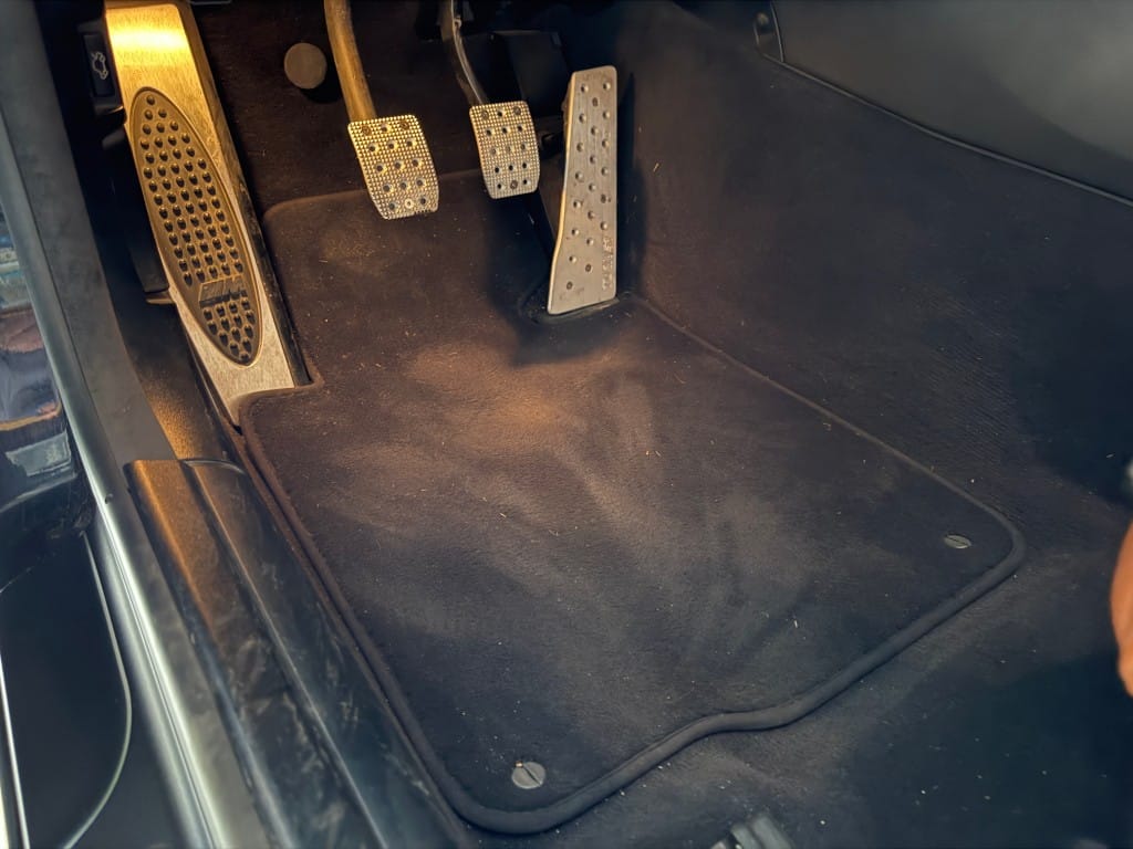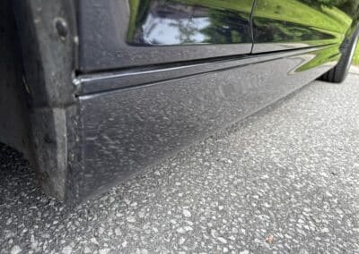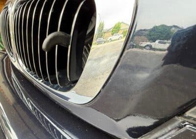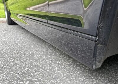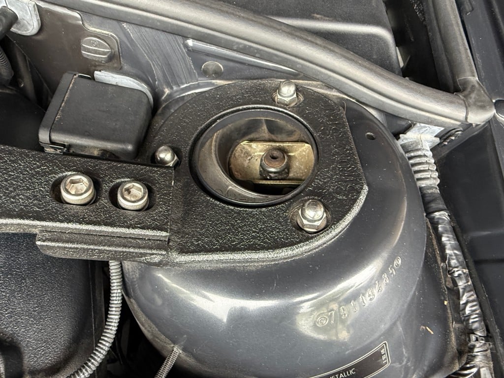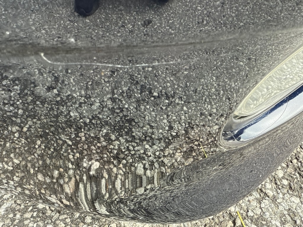 The exterior is finished in Carbon Black Metallic (Carbonschwarz metallic on the German language label on the driver’s front shock tower). The seller advises that the front end was refinished following a minor incident in which the vehicle was backed into at low speed, noted on the Carfax as an insurance of under $1,600. The initial insurance repair quote, shown in gallery images 261 and 262, included partial refinishing of the hood and blending into adjacent panels, along with the replacement of the hood emblem and grill assemblies.