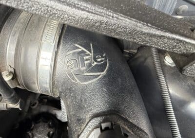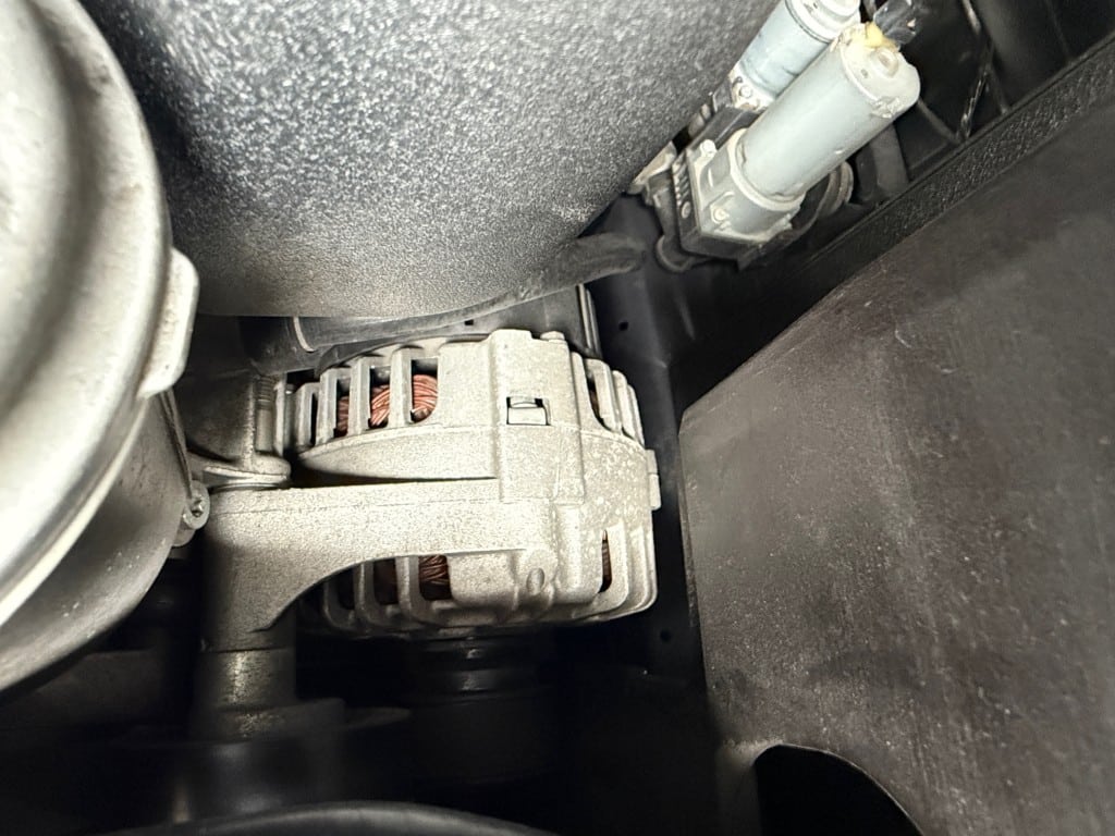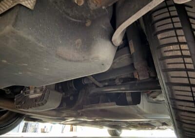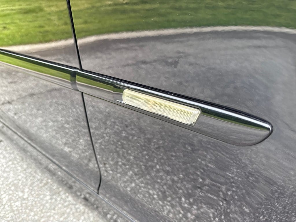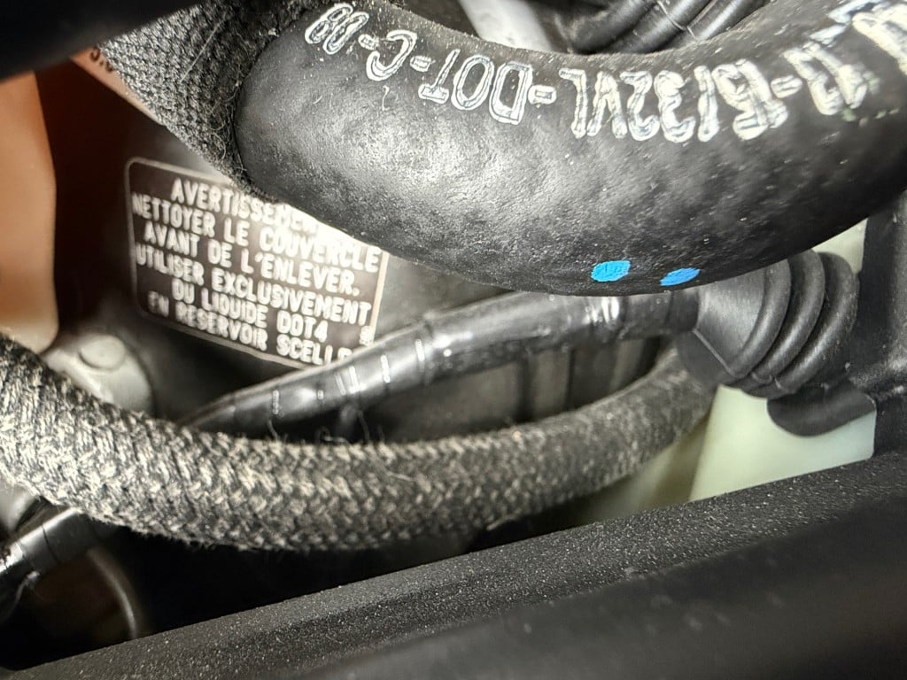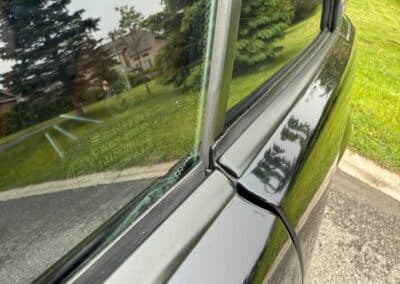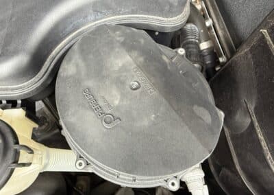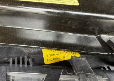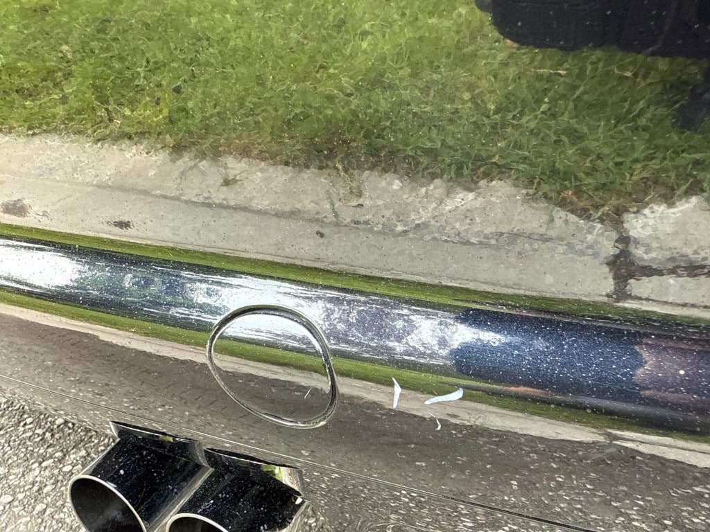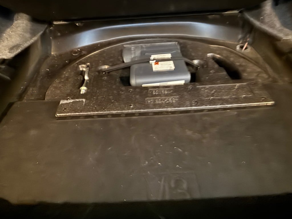 The exterior is finished in Carbon Black Metallic (Carbonschwarz metallic on the German language label on the driver’s front shock tower). The seller advises that the front end was refinished following a minor incident in which the vehicle was backed into at low speed, noted on the Carfax as an insurance of under $1,600. The initial insurance repair quote, shown in gallery images 261 and 262, included partial refinishing of the hood and blending into adjacent panels, along with the replacement of the hood emblem and grill assemblies.