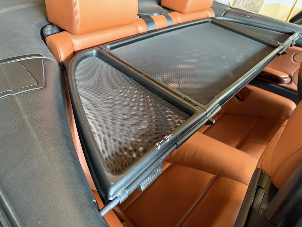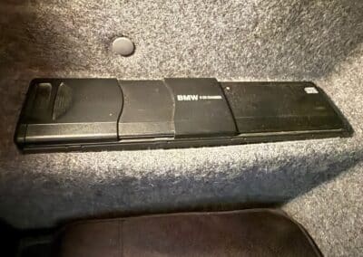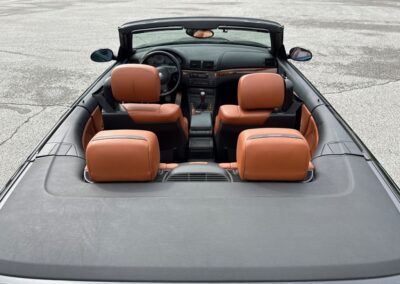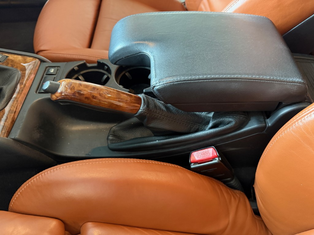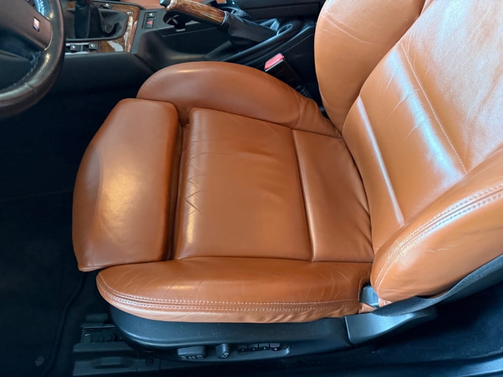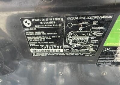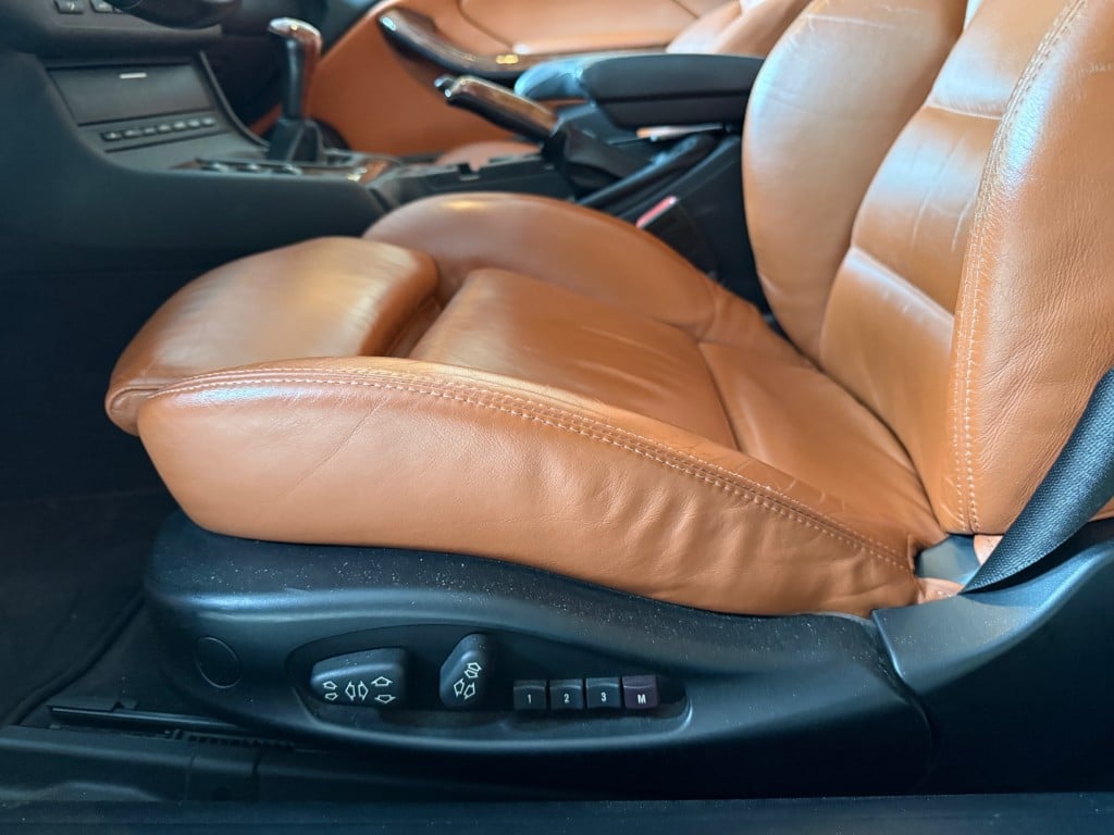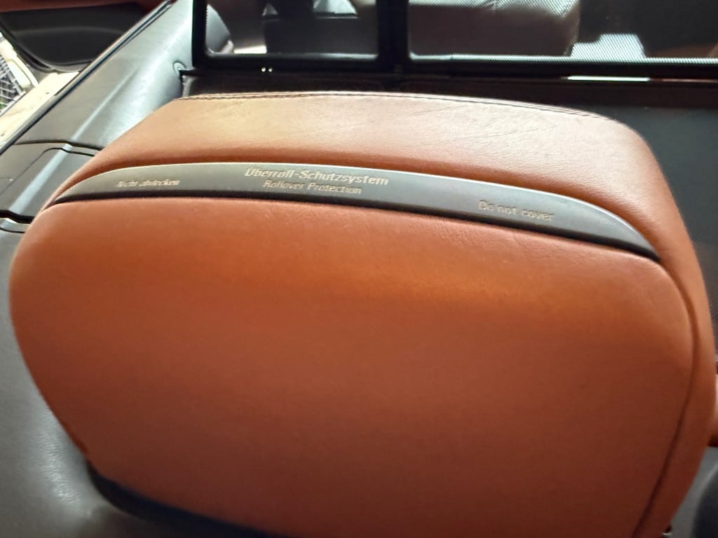 Inside, the cabin boasts Nappa leather upholstery in Cinnamon with power-adjustable heated front sport seats. The leather-wrapped M Sport steering wheel fronts an M-branded cluster. Interior equipment includes climate control with air conditioning, power windows and mirrors, cruise control, and an aftermarket stereo head unit and trunk-mounted CD changer, the latter currently inoperable without the original head unit. The original BMW BUSINESS AM/FM/cassette is included in the sale, however, as is the original air intake. Factory books include the owner’s manual and radio guide; there is also a full service manual. The convertible top lift mechanism has received service, including new hydraulic tension cylinders. See it in operation in our videos.