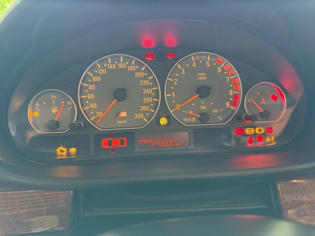 M3-dedicated (I.E. distinct from non-M E46 cars) instrumentation includes a 300 km/h speedometer, 9000 RPM tachometer with a redline of 8000 RPM, and auxiliary gauges for fuel level, oil temperature and coolant temperature. The digital odometer reads under 105,000 kilometres and is displayed alongside where warning indicators would illuminate and a service interval display, all of which are shown illuminated in the gallery. A full sweep of indicator and warning lights are visible at start-up, including icons for oil level, EML, ABS, DSC, brake wear, and SRS. The gauge cluster bears factory M badging, with all lighting and indicators functional.