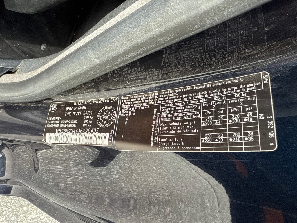 Lot - 262Category - GermanSeller - BenSeller location - Kanata, ON K2W(view map)VIN - WBSBR93441EX20495Odometer - 105,000 kmEngine Info - 3.2L S54 inline-6, naturally aspirated, 333 hp, 262 lb-ft torqueTransmission Info - 6-Speed ManualExterior Colour - Carbon Black MetallicInterior Colour - CinnamonOther features - Cold air intake, Aftermarket stereo (original included), Strong Strut front strut bar, XPEL paint protection film on frontHagerty.Ca Valuation, (#3 - #2) $30,600 – $52,600Model page (click here)Carfax Report (click here)Join Our Mailing List