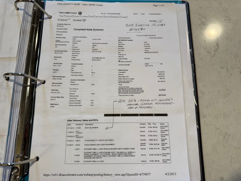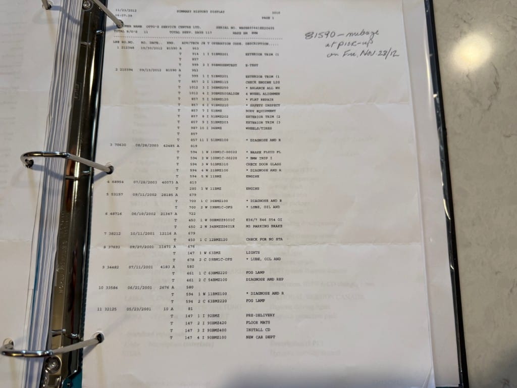 Hello, I’m the owner of the BMW listed here. I’m realizing that I don’t get out in this great car as often as I should. Retirement has allowed me to get into activities such as RVing and being as the car is only taken out in fair weather, my usage has dropped. Having said that I have found this vehicle to be among the most enjoyable I have driven over many years of car and motorcycle driving! It feels so solid and ‘well planted’ at any speed. As well, while it’s no longer one of the quickest cars on the road, it’s certainly no slouch! It has been well maintained, but has never thrown any unreasonable issues at me. As you can see from the pics, I have extensive records for the 12+ years of my ownership. I also had it safety checked last year – it passed without problem, although the tire treads were near the minimum allowable, so I put four new tires on it this spring. I will have a safety check done again when appropriate. If it sells I’m sure the new owner will enjoy this car as much as I have! Any questions or if you wish to see the car, please contact me.
