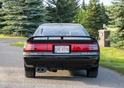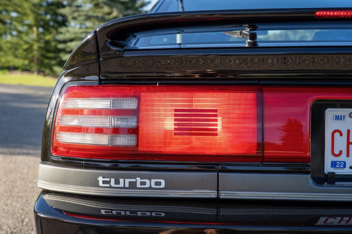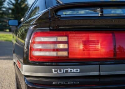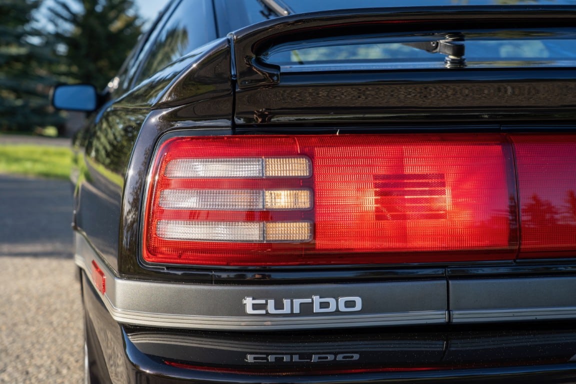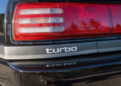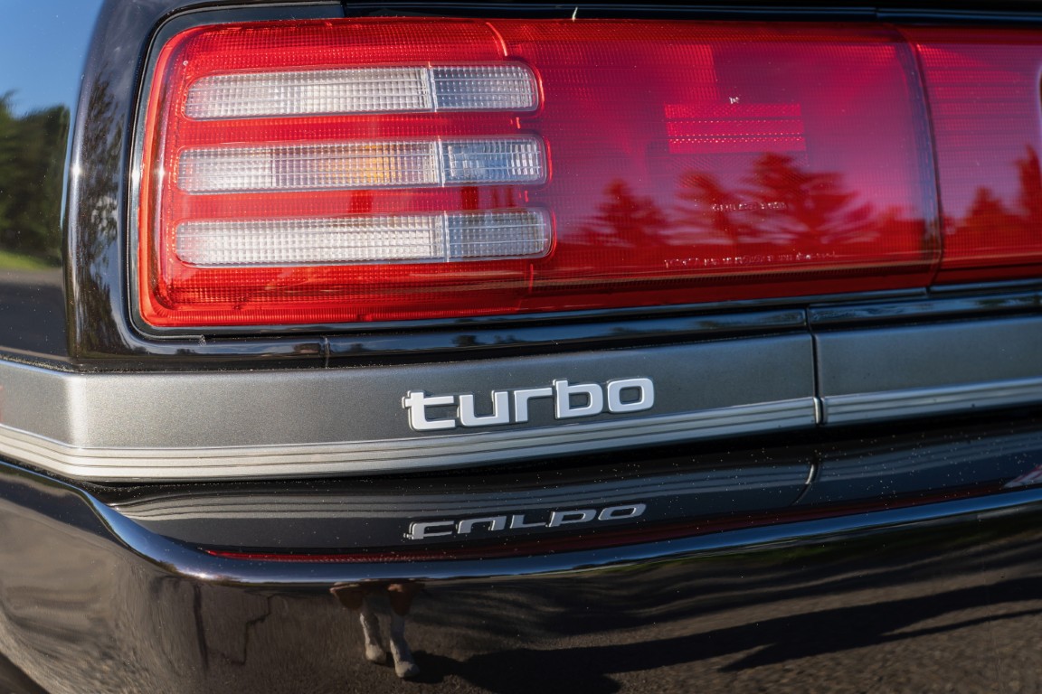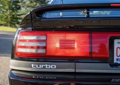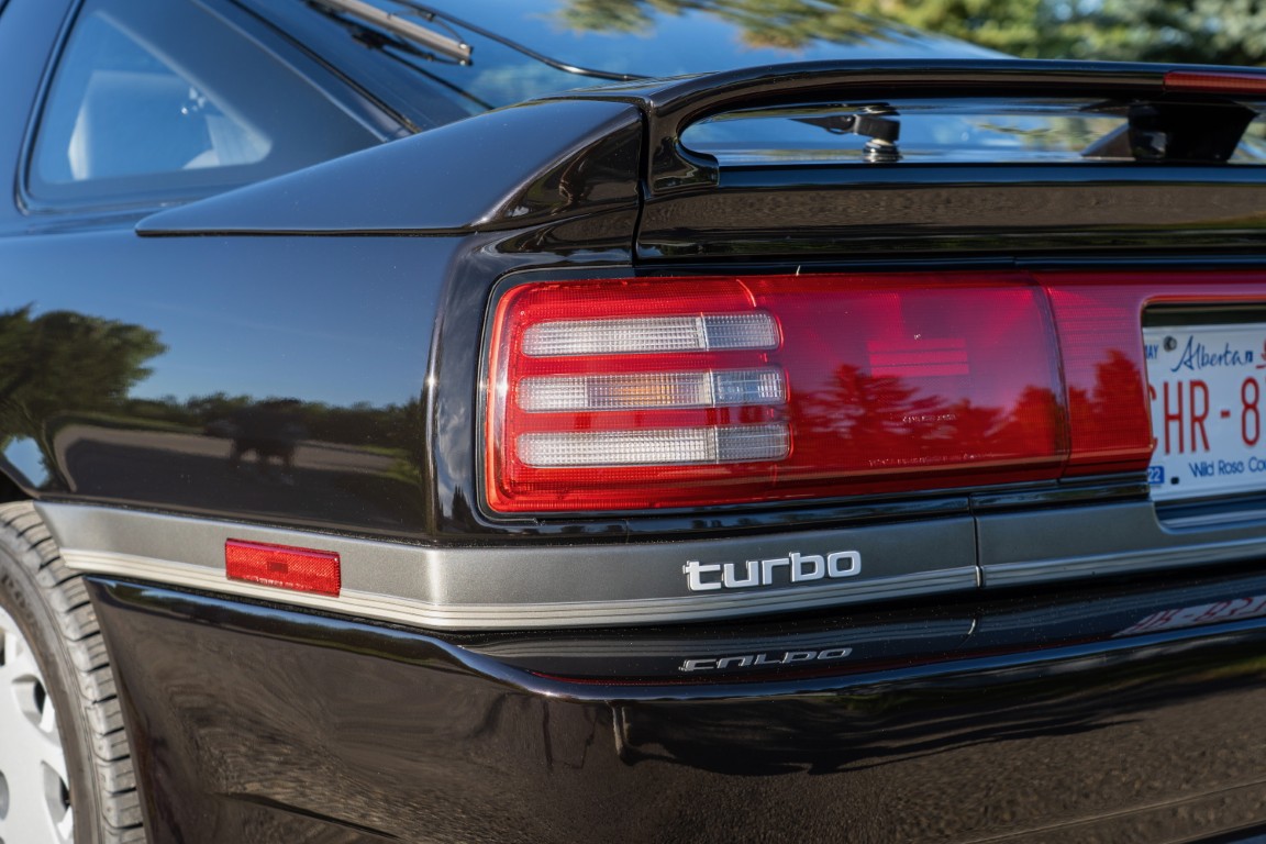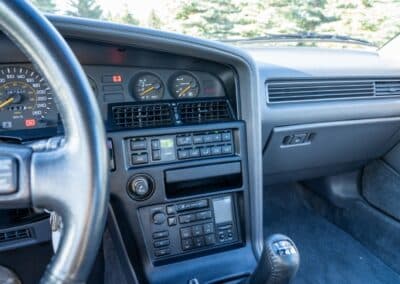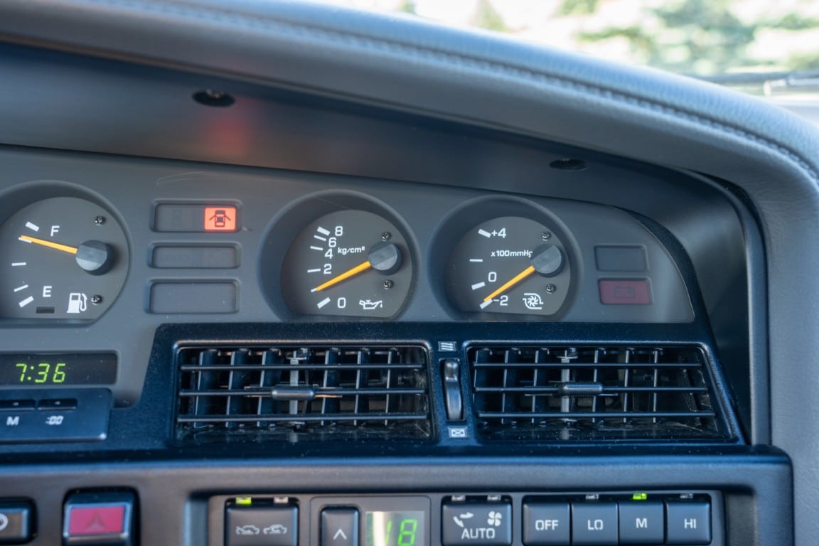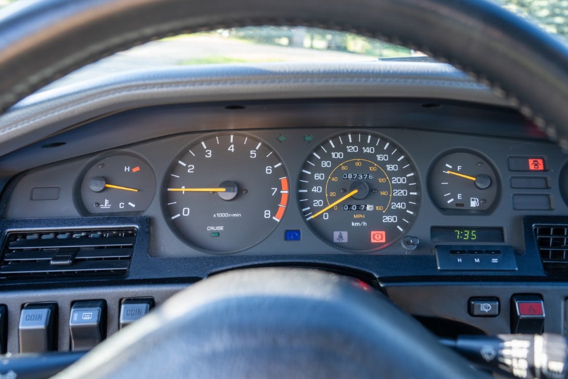 The three-spoke, leather-wrapped steering wheel fronts a full factory instrument cluster, which includes a 260 km/h speedometer, 6,500 RPM redline tachometer, and auxiliary gauges for fuel level, oil pressure, coolant temperature, and turbo boost pressure. Further interior features include power windows, mirrors and power door locks, cruise control, and a factory AM/FM cassette stereo. Additional equipment includes a rear window defrost, digital clock, and interior lighting controls integrated into the centre stack.