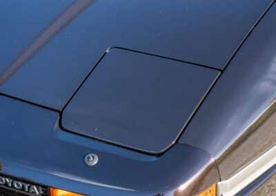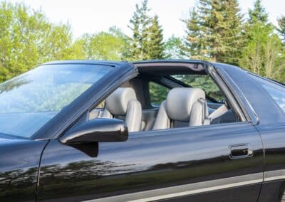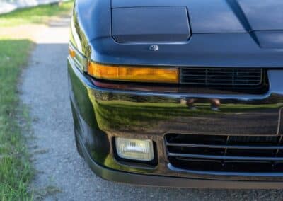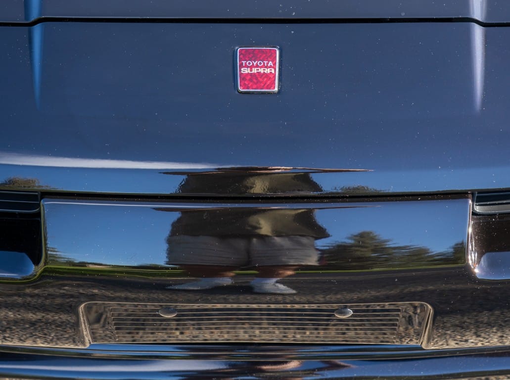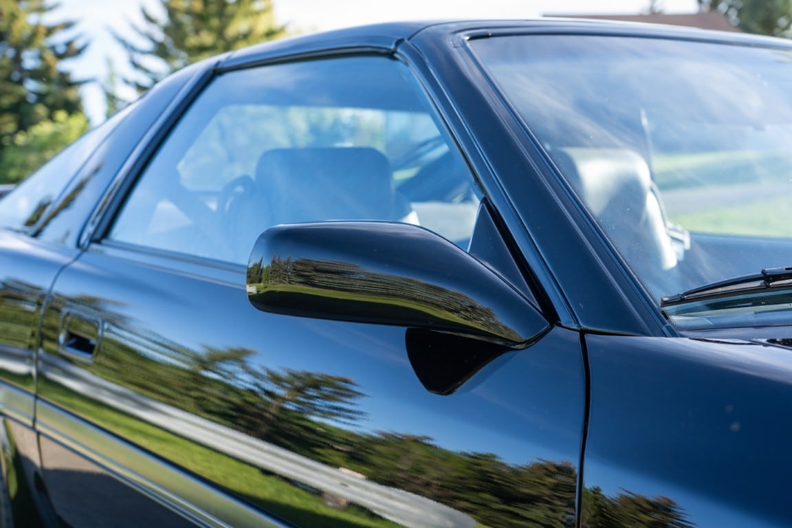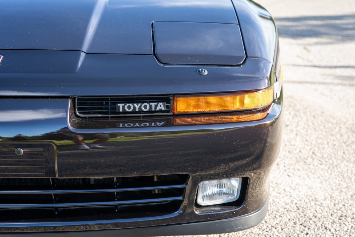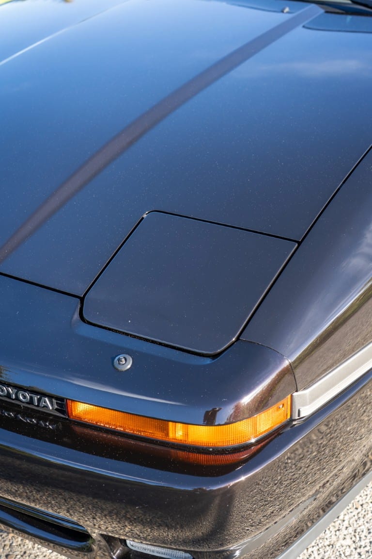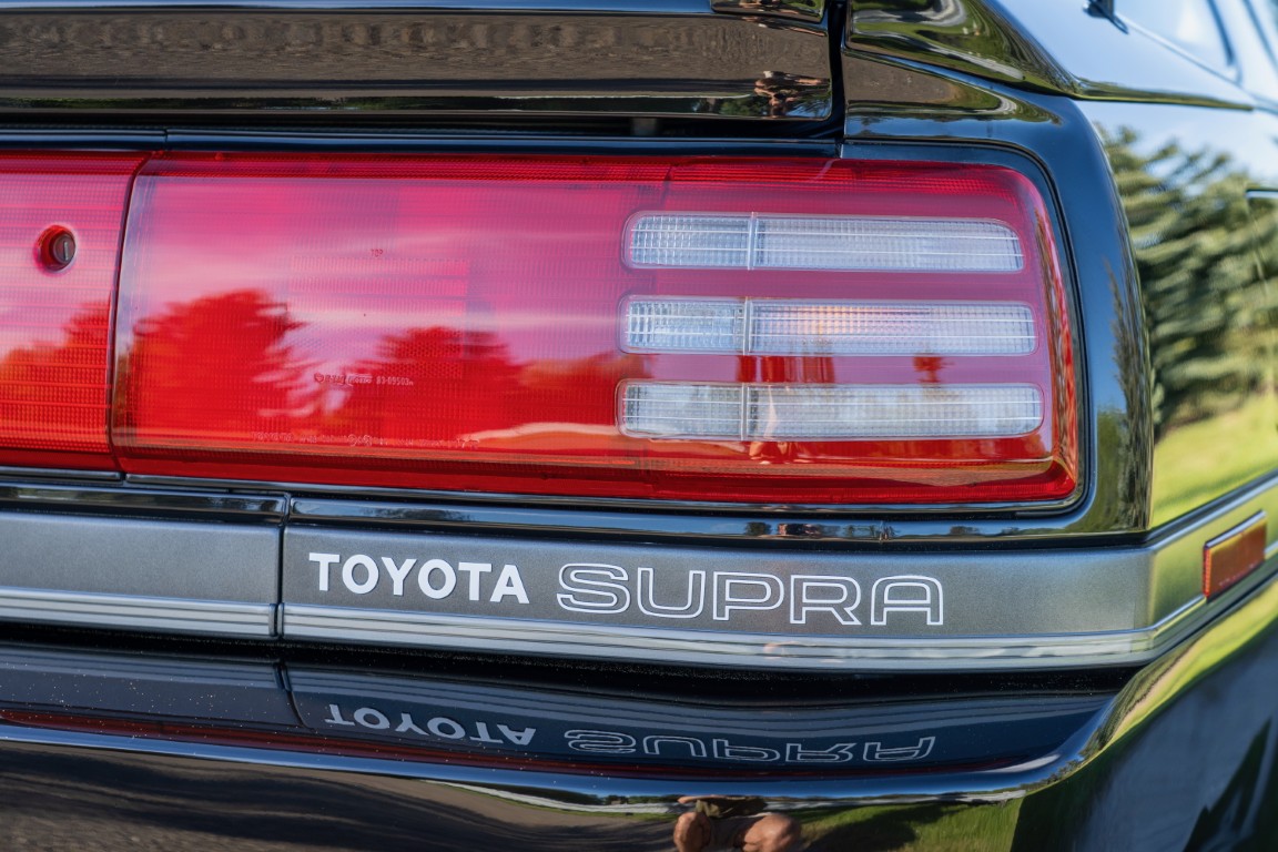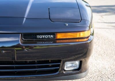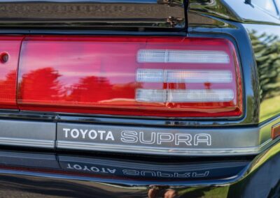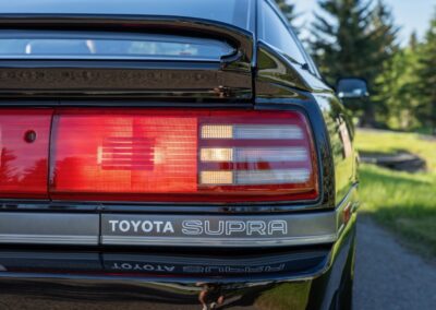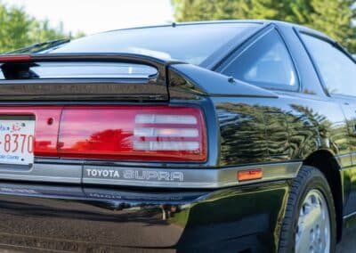 The exterior is finished in Black Ruby Pearl (Toyota Code 206), with paint depth readings displayed in the gallery that are consistent with owner’s mention of the car still showing its original paint. Colour-matched components include the removable targa roof panel, side mirrors, and rear spoiler which features an integrated centre-mounted LED brake light. Additional exterior equipment includes pop-up headlights, front fog lamps, and a rear window wiper. Badging includes the “Toyota Supra” emblem fore of the hood, along with the “Toyota Supra” and, importantly, “Turbo” identifiers on the rear. Small stone chips on the front fascia have been touched up. There is also a chip in the lens of a functional fog light and 1.5” blemish on the poly front bumper cover.