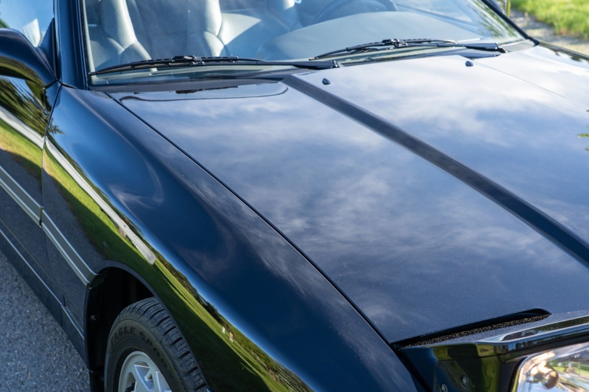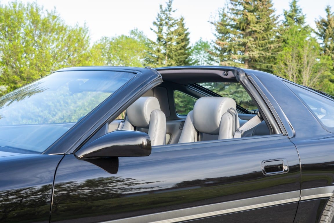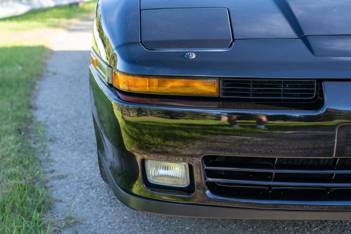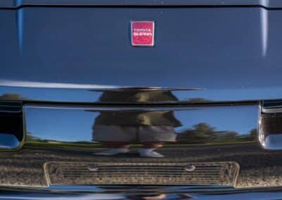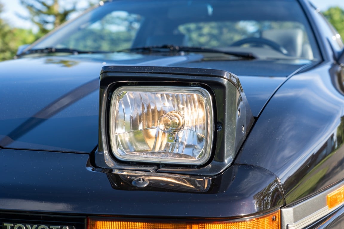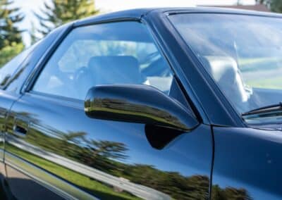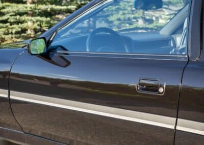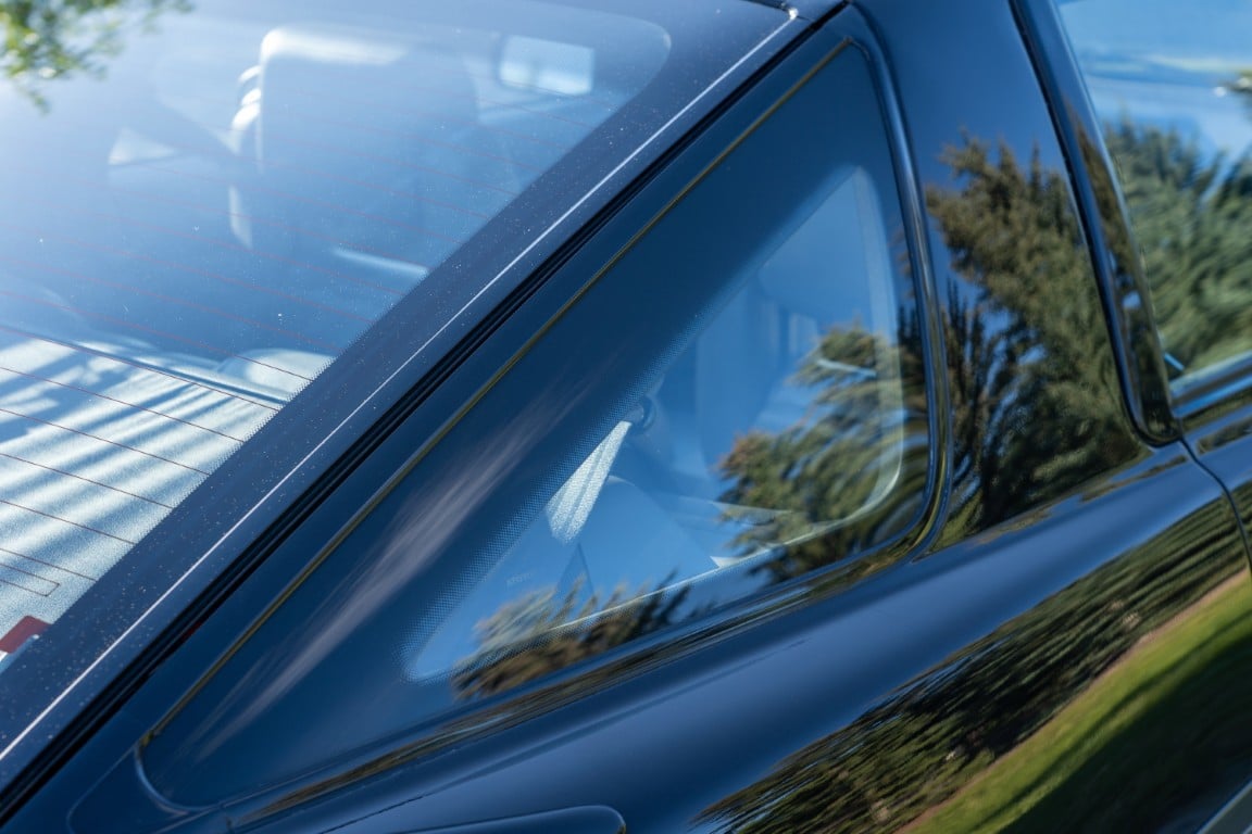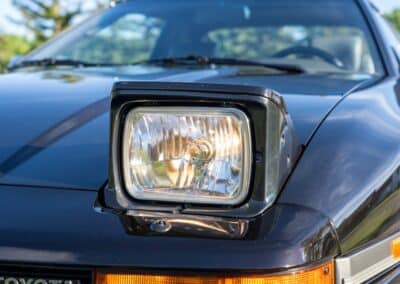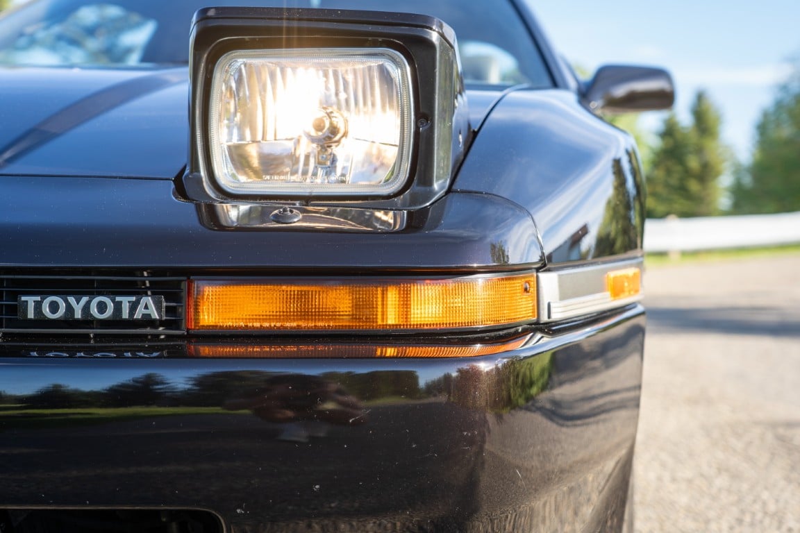 The exterior is finished in Black Ruby Pearl (Toyota Code 206), with paint depth readings displayed in the gallery that are consistent with owner’s mention of the car still showing its original paint. Colour-matched components include the removable targa roof panel, side mirrors, and rear spoiler which features an integrated centre-mounted LED brake light. Additional exterior equipment includes pop-up headlights, front fog lamps, and a rear window wiper. Badging includes the “Toyota Supra” emblem fore of the hood, along with the “Toyota Supra” and, importantly, “Turbo” identifiers on the rear. Small stone chips on the front fascia have been touched up. There is also a chip in the lens of a functional fog light and 1.5” blemish on the poly front bumper cover.
