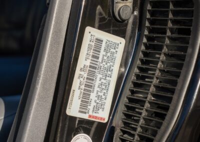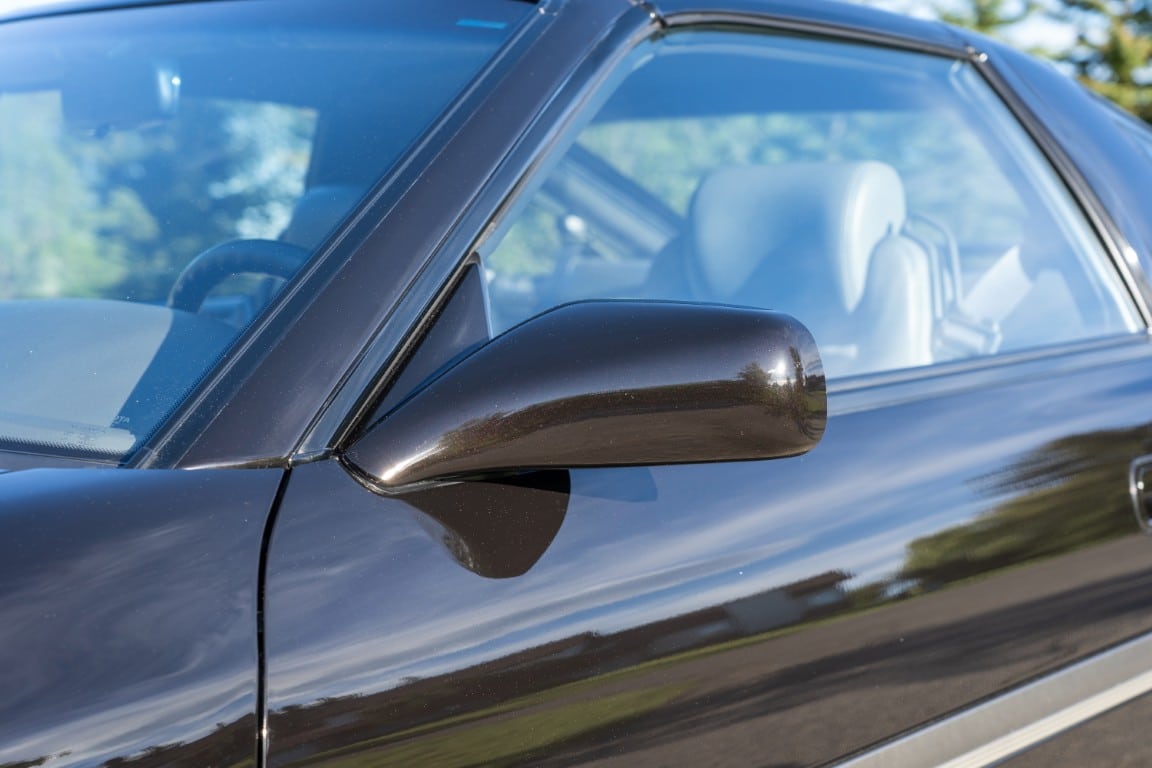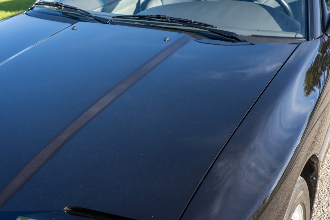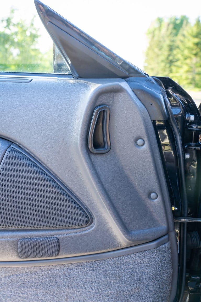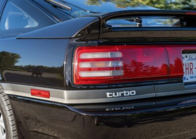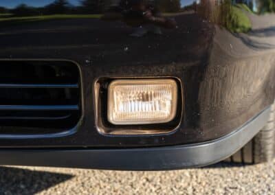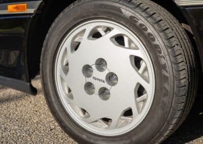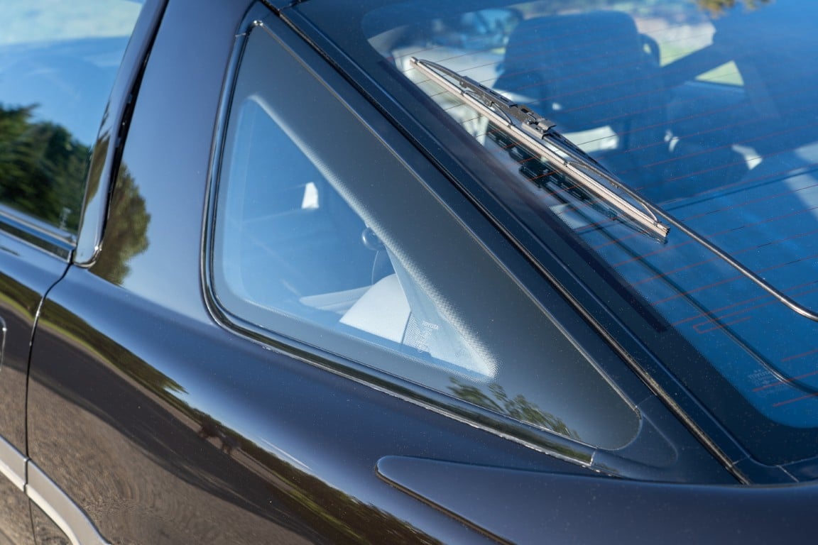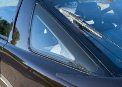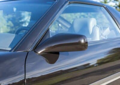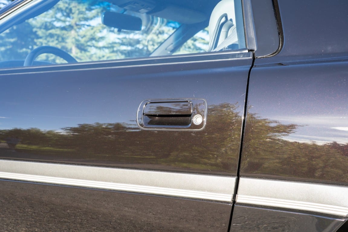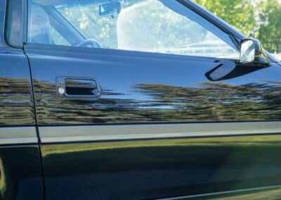 The exterior is finished in Black Ruby Pearl (Toyota Code 206), with paint depth readings displayed in the gallery that are consistent with owner’s mention of the car still showing its original paint. Colour-matched components include the removable targa roof panel, side mirrors, and rear spoiler which features an integrated centre-mounted LED brake light. Additional exterior equipment includes pop-up headlights, front fog lamps, and a rear window wiper. Badging includes the “Toyota Supra” emblem fore of the hood, along with the “Toyota Supra” and, importantly, “Turbo” identifiers on the rear. Small stone chips on the front fascia have been touched up. There is also a chip in the lens of a functional fog light and 1.5” blemish on the poly front bumper cover.
