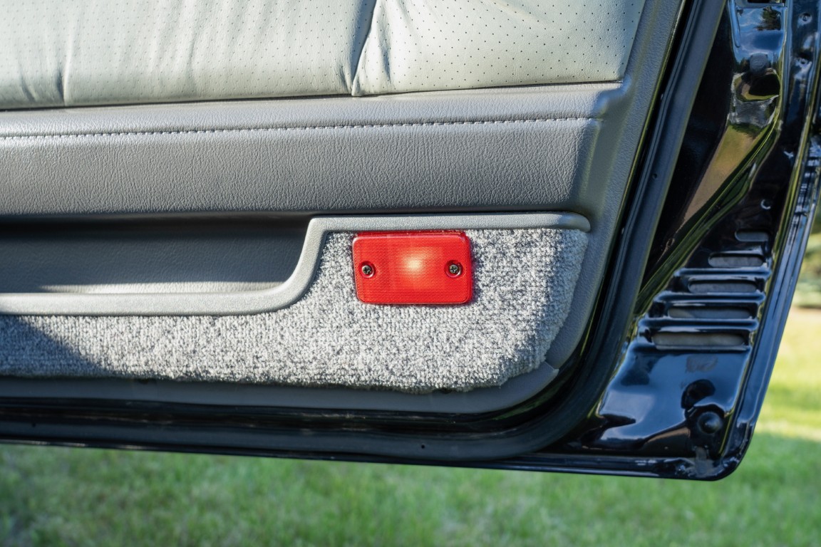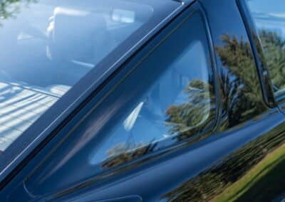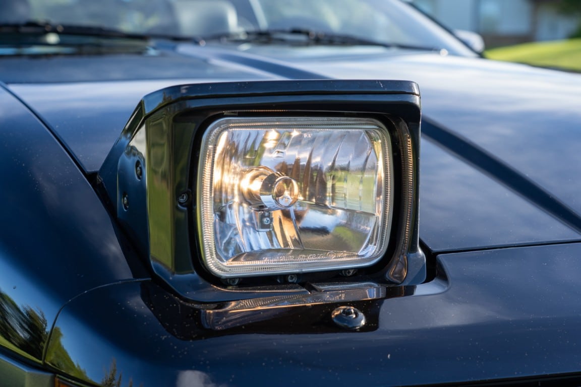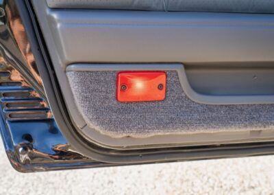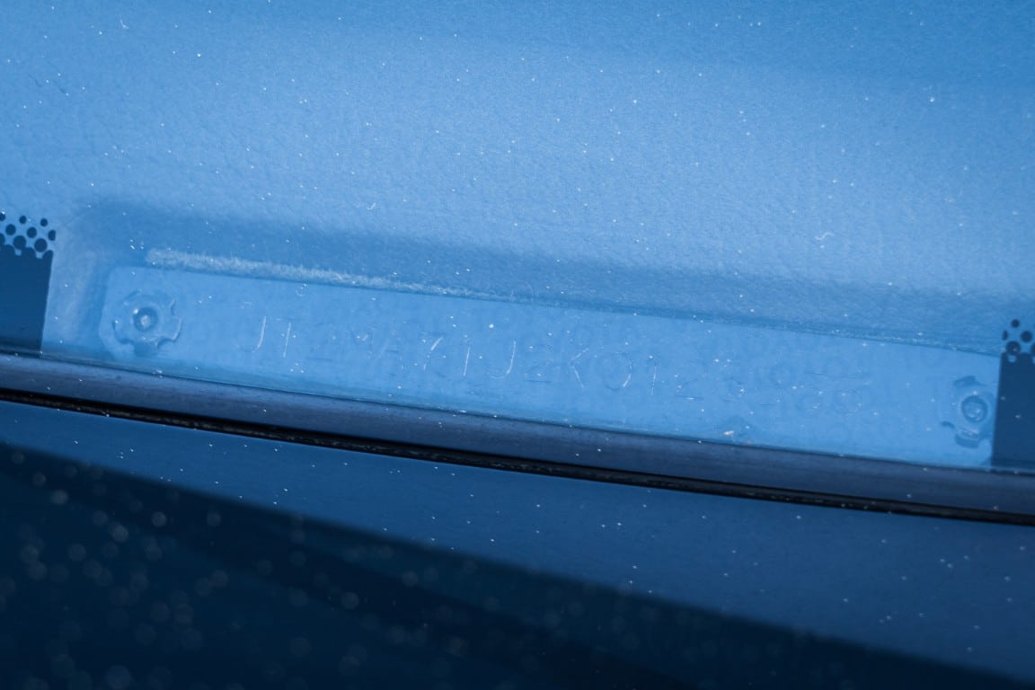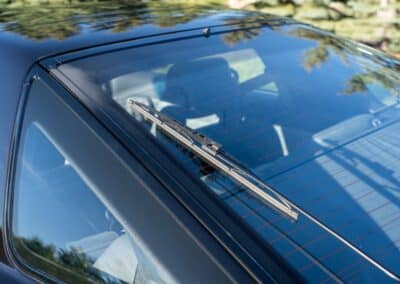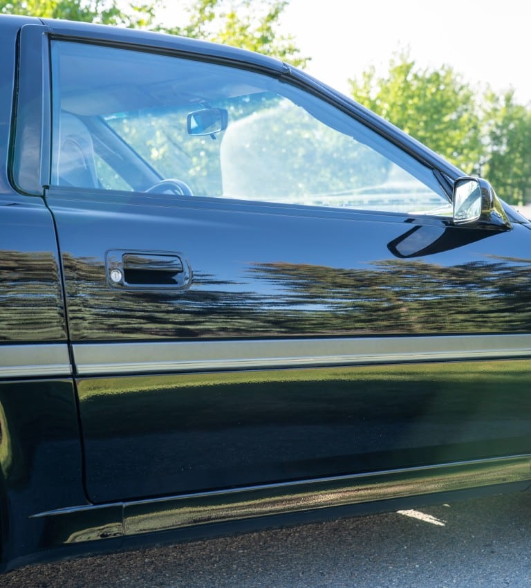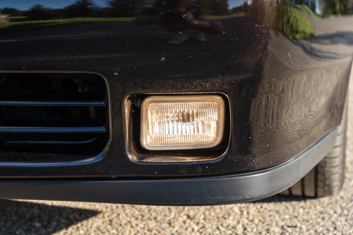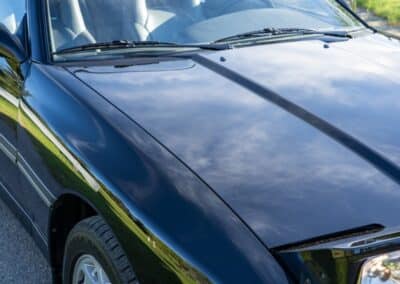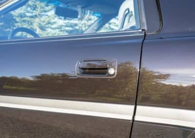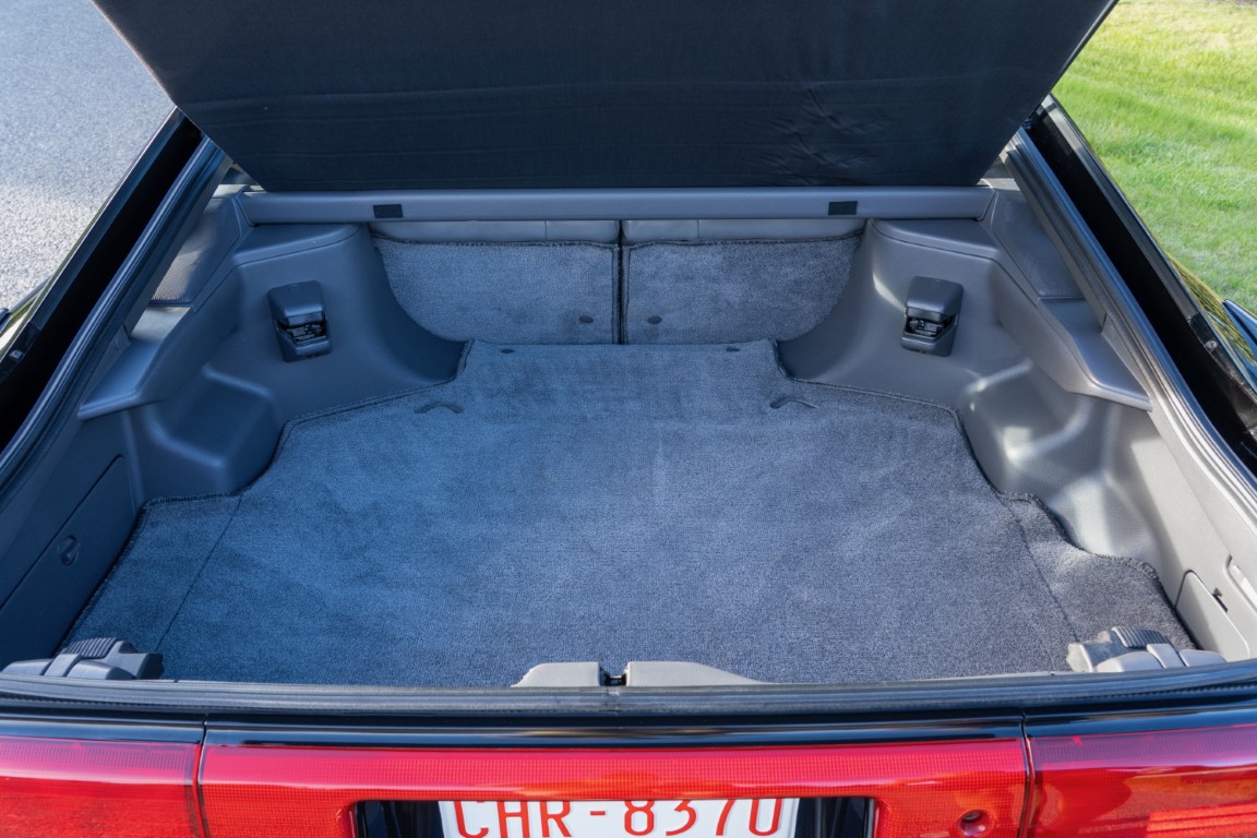 The exterior is finished in Black Ruby Pearl (Toyota Code 206), with paint depth readings displayed in the gallery that are consistent with owner’s mention of the car still showing its original paint. Colour-matched components include the removable targa roof panel, side mirrors, and rear spoiler which features an integrated centre-mounted LED brake light. Additional exterior equipment includes pop-up headlights, front fog lamps, and a rear window wiper. Badging includes the “Toyota Supra” emblem fore of the hood, along with the “Toyota Supra” and, importantly, “Turbo” identifiers on the rear. Small stone chips on the front fascia have been touched up. There is also a chip in the lens of a functional fog light and 1.5” blemish on the poly front bumper cover.
