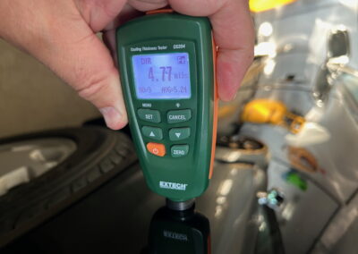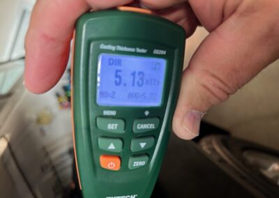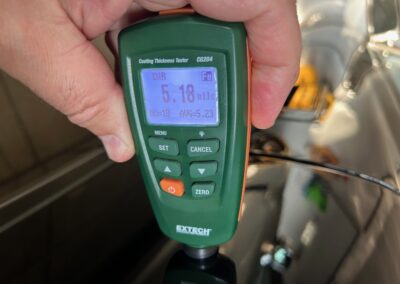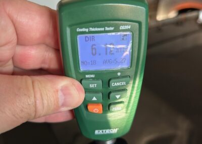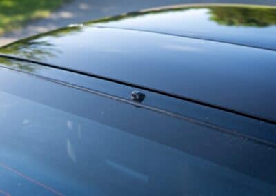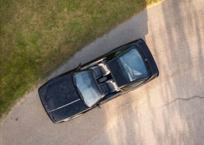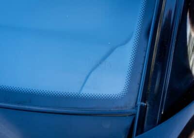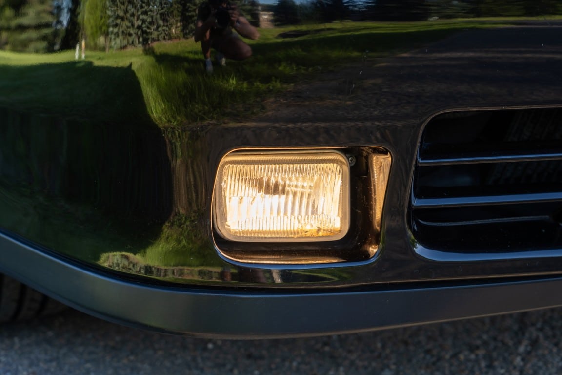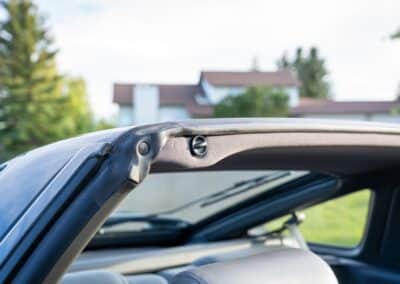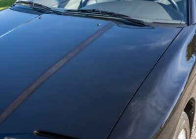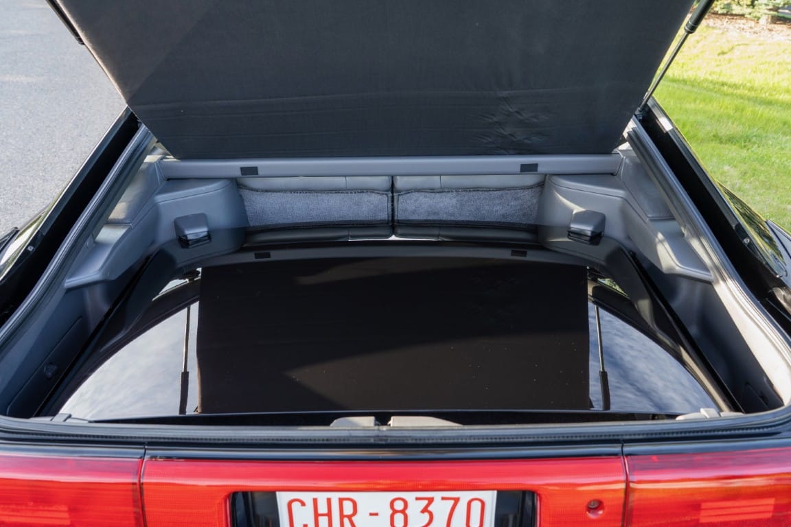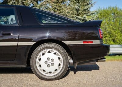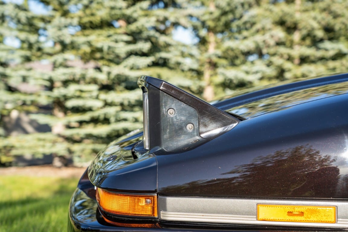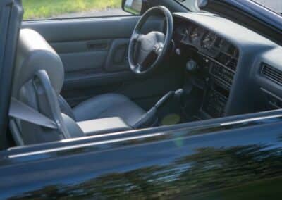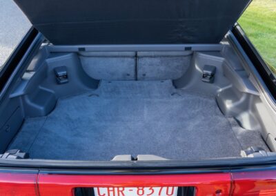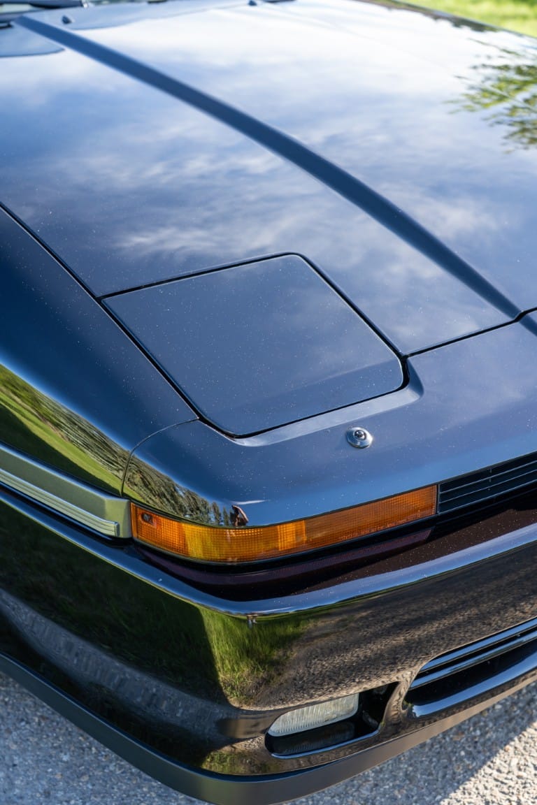 The exterior is finished in Black Ruby Pearl (Toyota Code 206), with paint depth readings displayed in the gallery that are consistent with owner’s mention of the car still showing its original paint. Colour-matched components include the removable targa roof panel, side mirrors, and rear spoiler which features an integrated centre-mounted LED brake light. Additional exterior equipment includes pop-up headlights, front fog lamps, and a rear window wiper. Badging includes the “Toyota Supra” emblem fore of the hood, along with the “Toyota Supra” and, importantly, “Turbo” identifiers on the rear. Small stone chips on the front fascia have been touched up. There is also a chip in the lens of a functional fog light and 1.5” blemish on the poly front bumper cover.