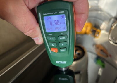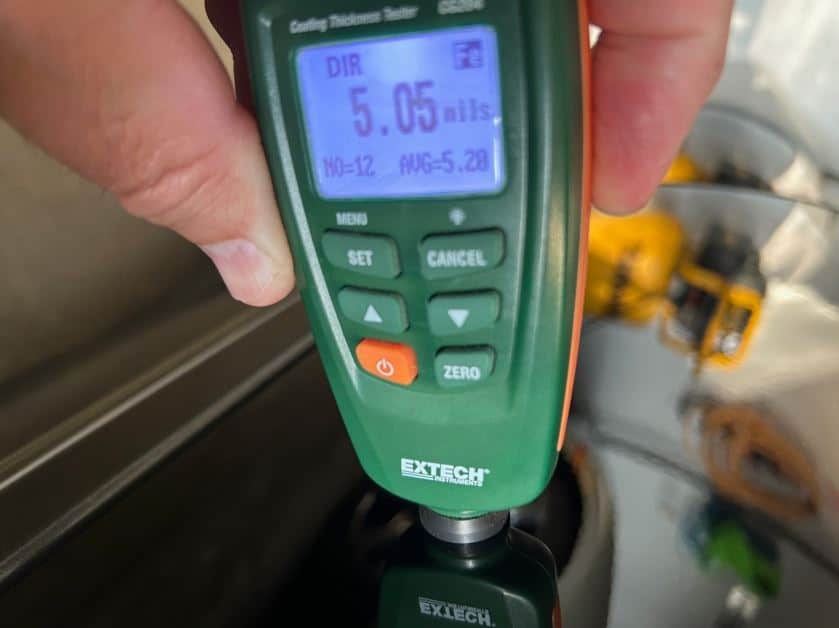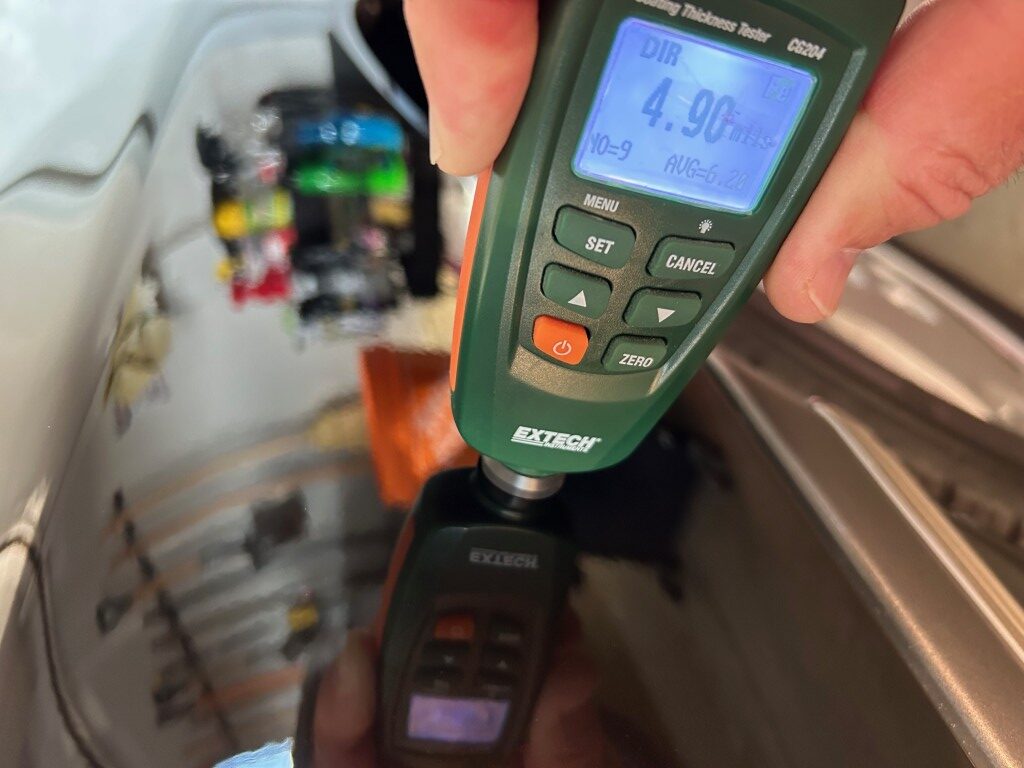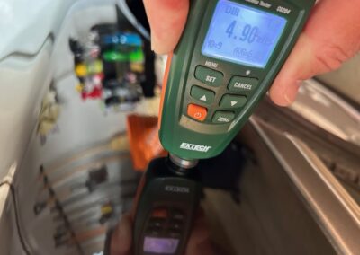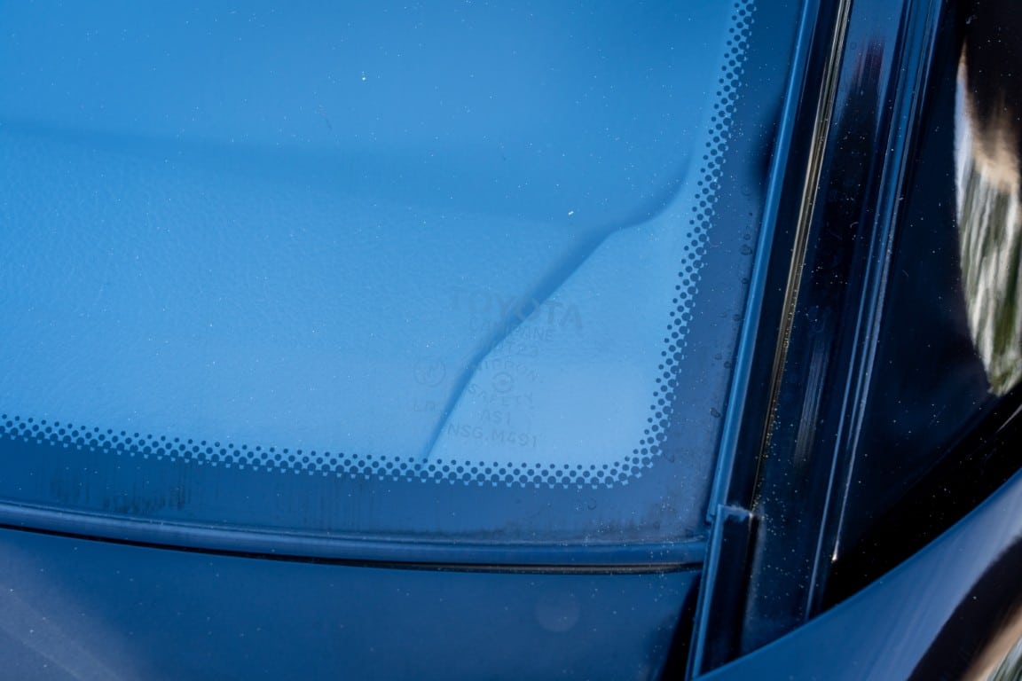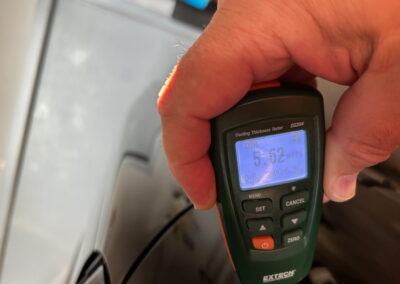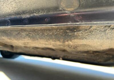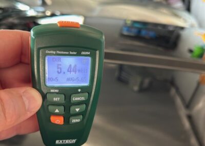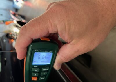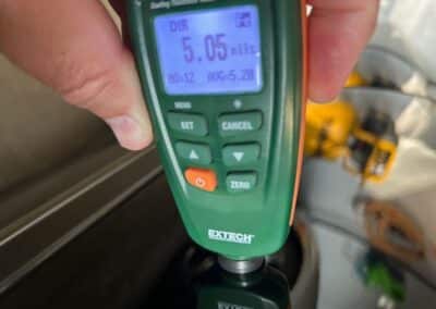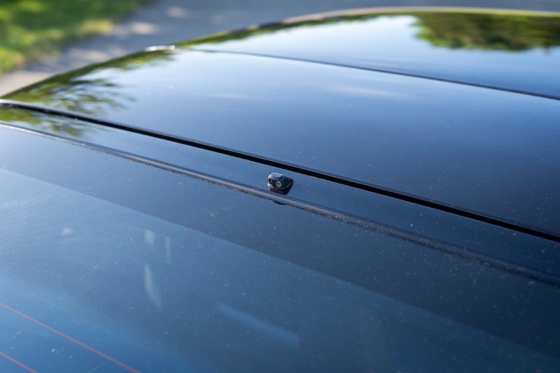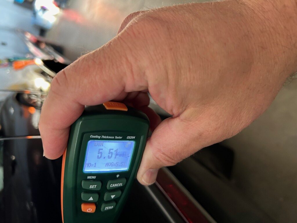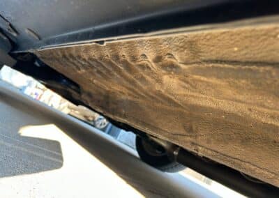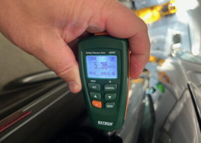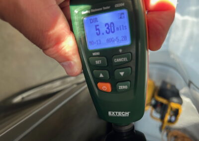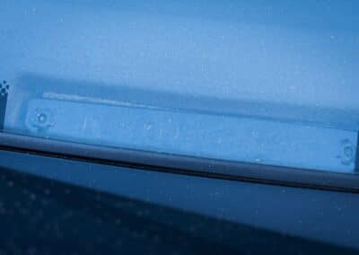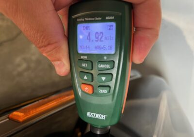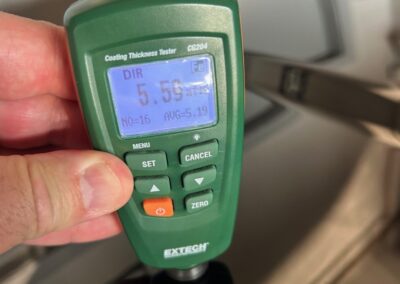 The exterior is finished in Black Ruby Pearl (Toyota Code 206), with paint depth readings displayed in the gallery that are consistent with owner’s mention of the car still showing its original paint. Colour-matched components include the removable targa roof panel, side mirrors, and rear spoiler which features an integrated centre-mounted LED brake light. Additional exterior equipment includes pop-up headlights, front fog lamps, and a rear window wiper. Badging includes the “Toyota Supra” emblem fore of the hood, along with the “Toyota Supra” and, importantly, “Turbo” identifiers on the rear. Small stone chips on the front fascia have been touched up. There is also a chip in the lens of a functional fog light and 1.5” blemish on the poly front bumper cover.