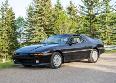 Presented here is a 1989 Toyota Supra Turbo 5-Speed Sport Roof, finished in Black Ruby Pearl over a grey leather interior. This example is powered by a 3.0-litre turbocharged inline-six paired with a five-speed manual transmission. This rust-free Canadian market car has been under current ownership since 2020 with the odometer displaying under 88,000 kilometres. This 88K km 1989 Toyota Supra is offered by the seller with two keys, a removable Sport Roof panel, partial service records, spare parts, a spare tire, Supra floor mats, and factory manuals in Calgary, AB.