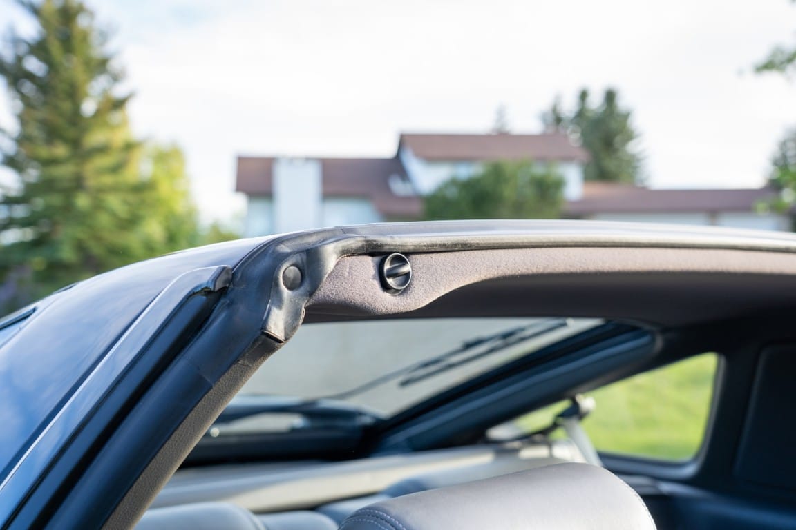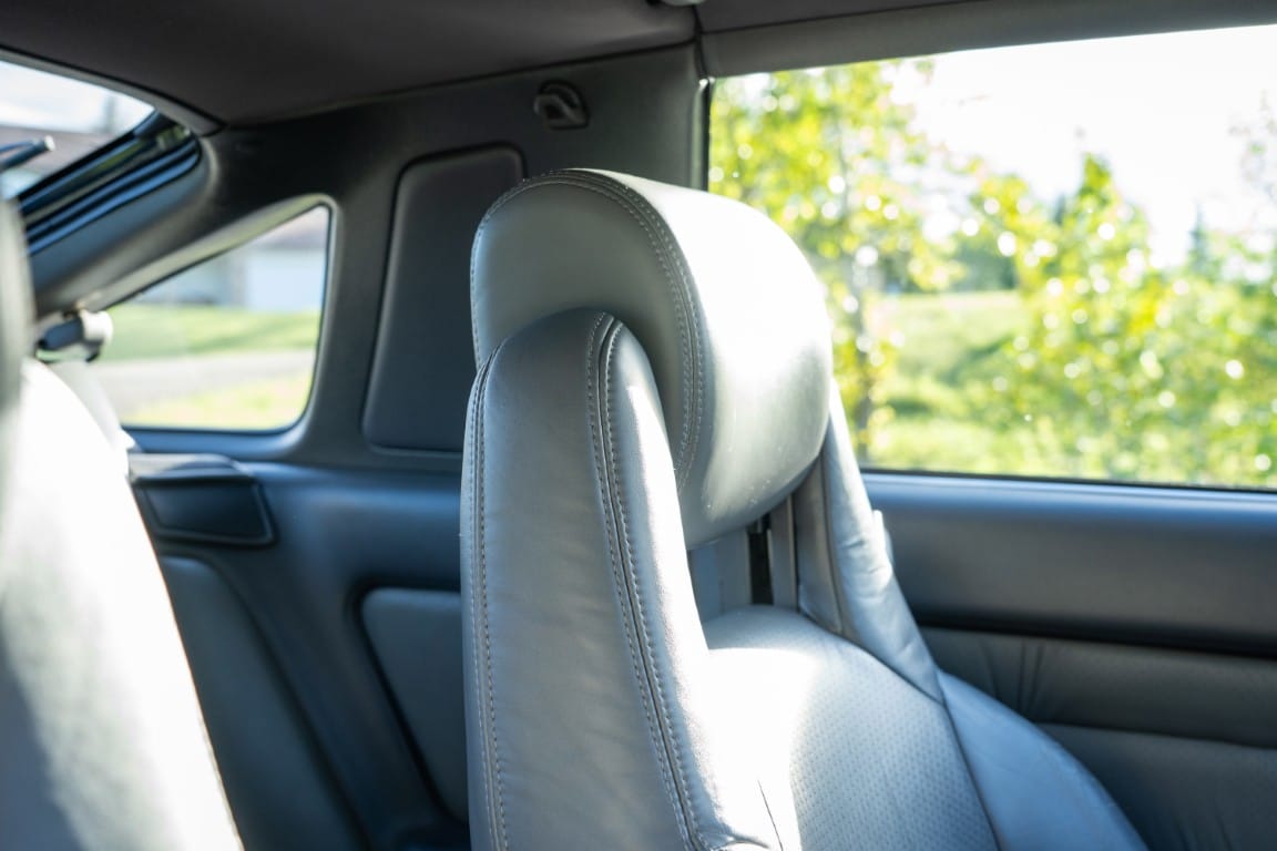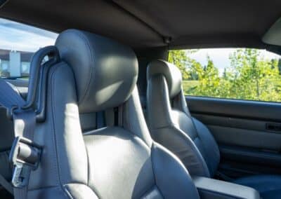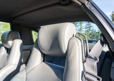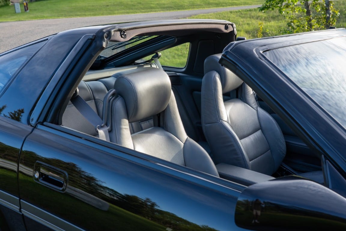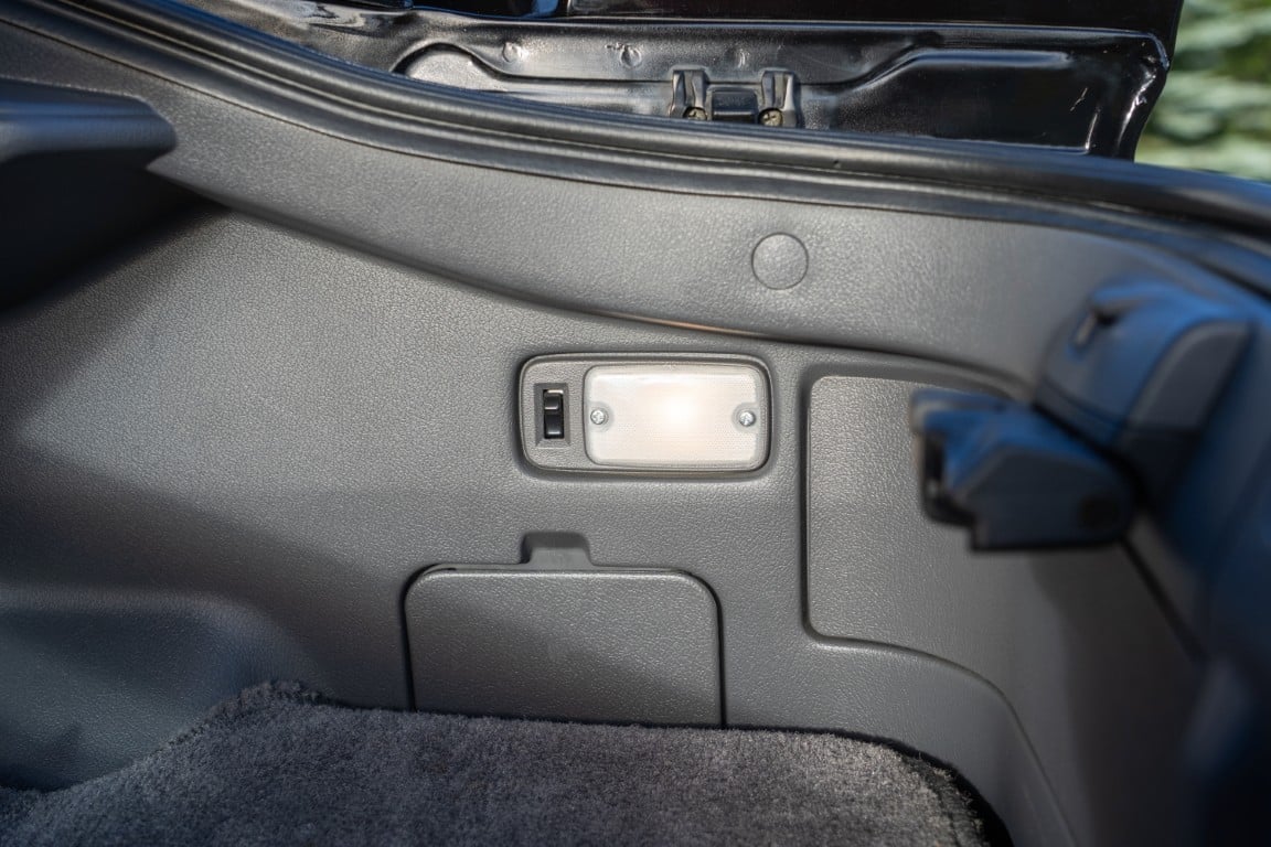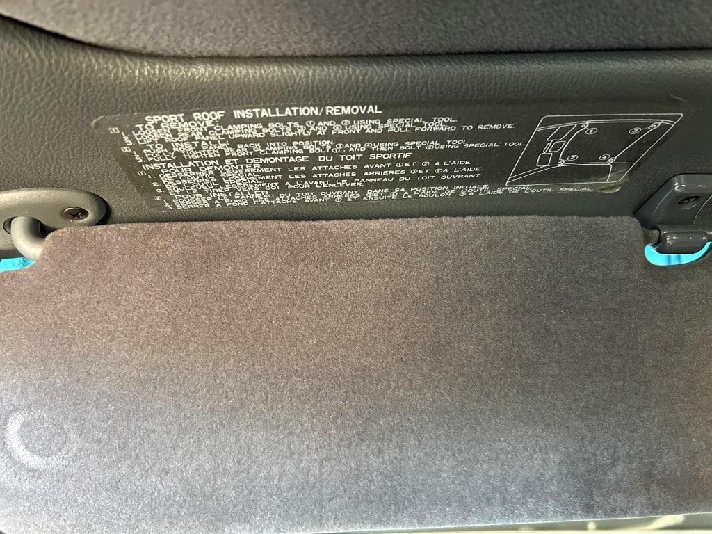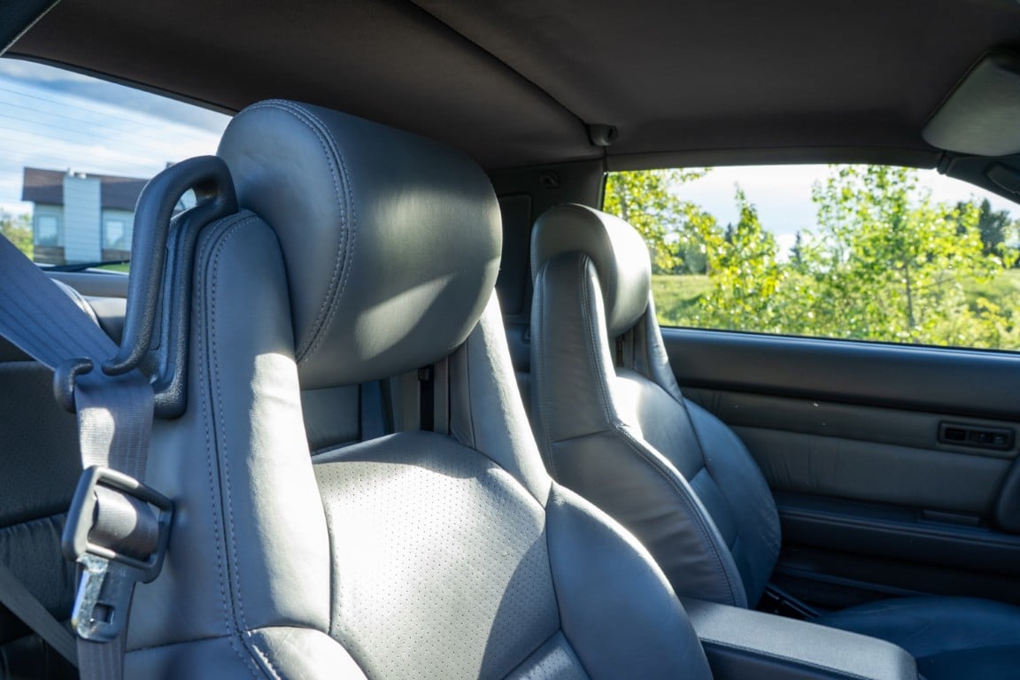 The cabin is upholstered in dark grey leather with matching door cards, centre console, headliner, and carpeting. Interior equipment includes a power-adjustable driver’s seat, automatic climate control with a/c, and a tilt/telescopic-adjustable steering column. Supra-branded floor mats are in place, and the rear cargo area includes factory storage compartments purpose-built for stowage of the removable Sport Roof panel. Additional interior features include a locking glovebox and manually adjustable passenger seat. Some very light wear is noted only on the driver’s side seat bolster, with the lower cushion showing no signs of wear.