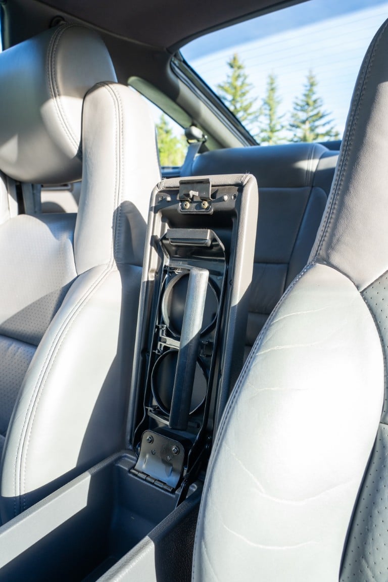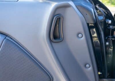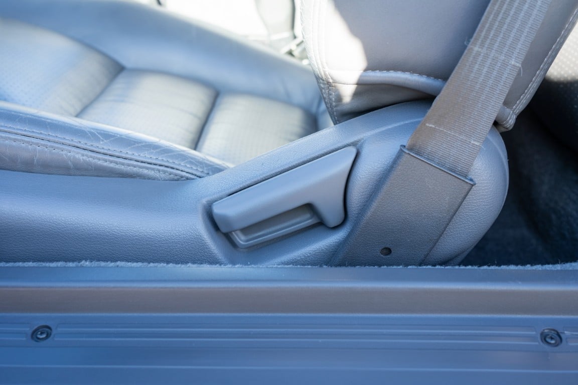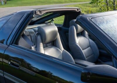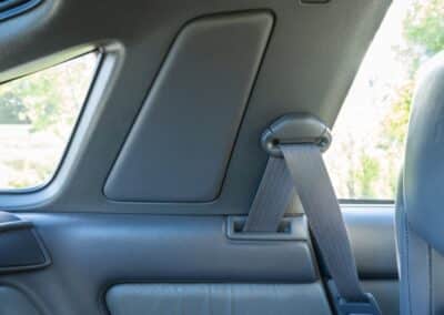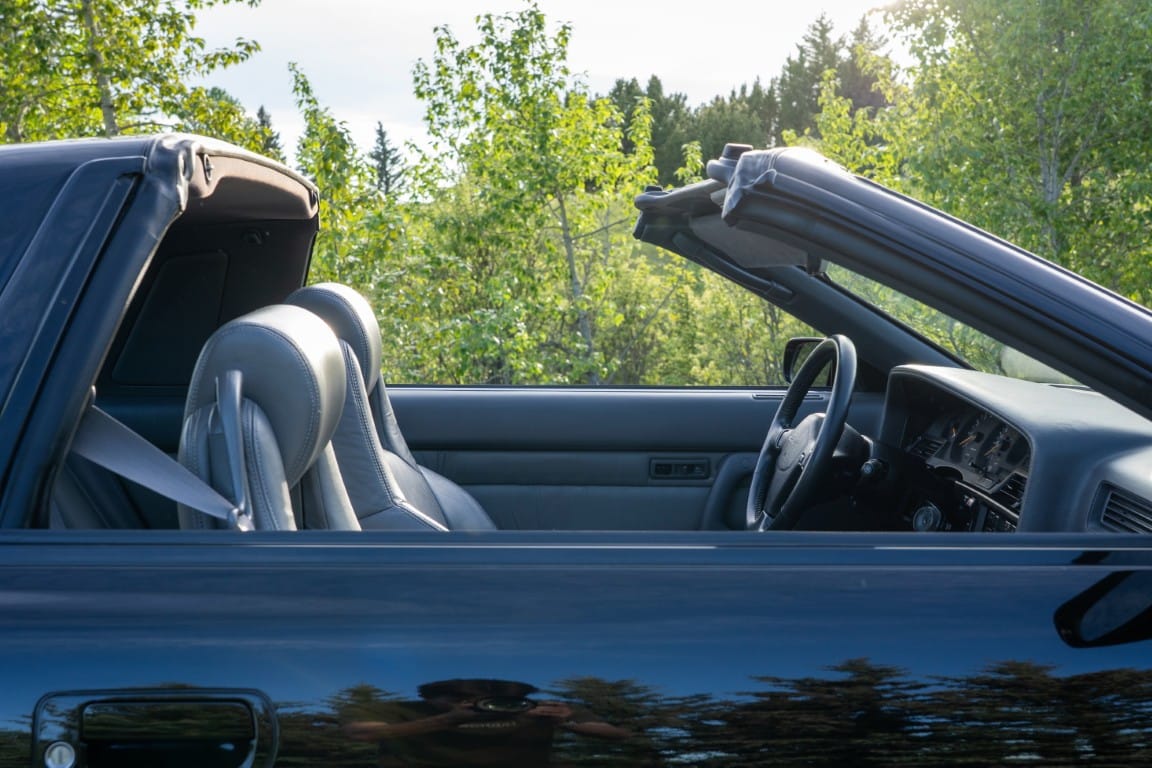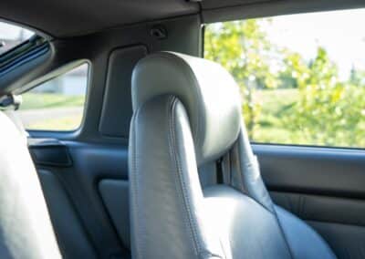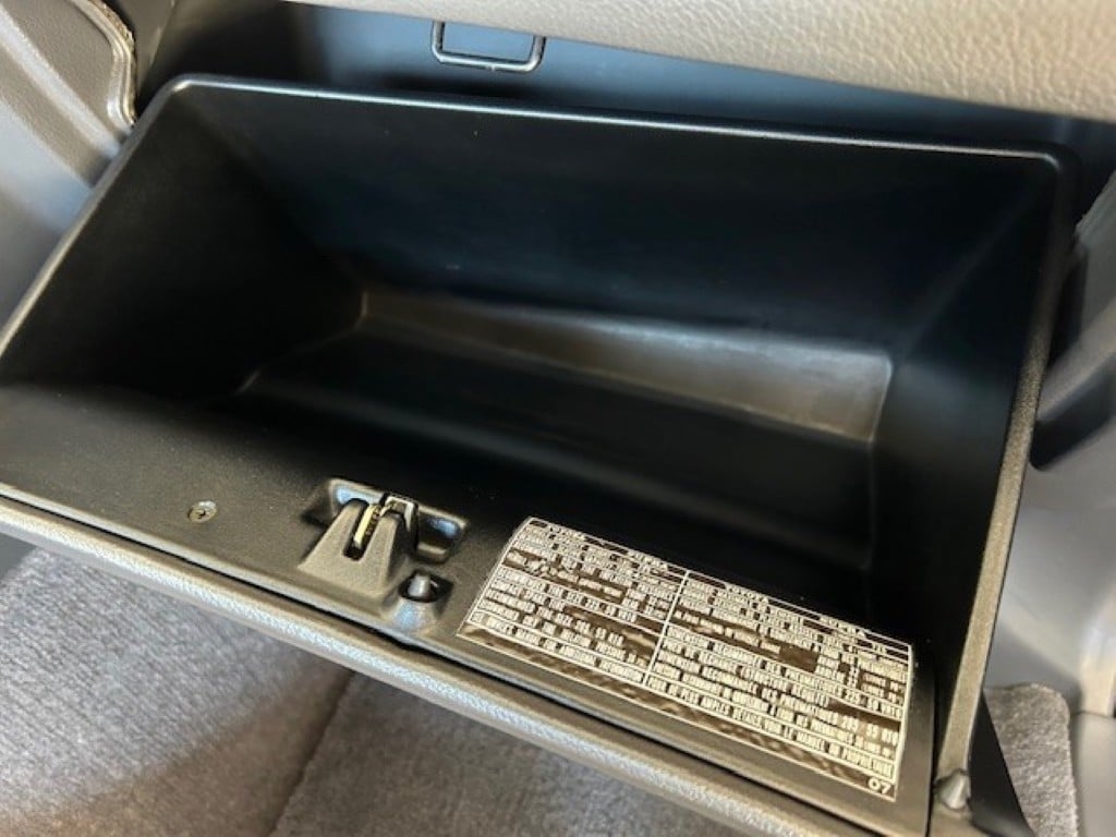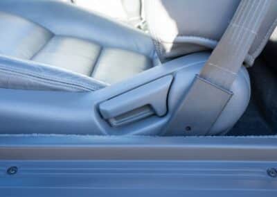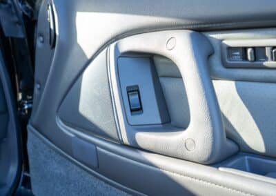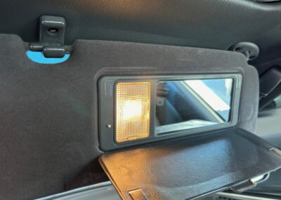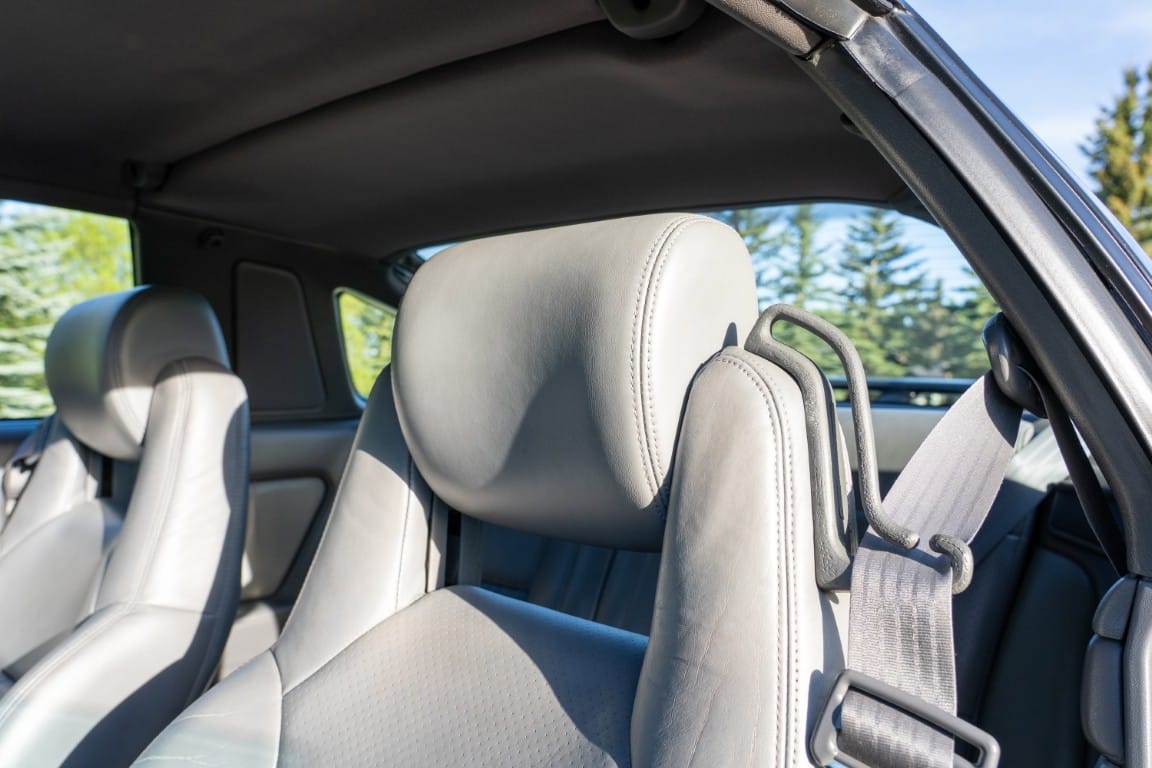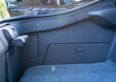 The cabin is upholstered in dark grey leather with matching door cards, centre console, headliner, and carpeting. Interior equipment includes a power-adjustable driver’s seat, automatic climate control with a/c, and a tilt/telescopic-adjustable steering column. Supra-branded floor mats are in place, and the rear cargo area includes factory storage compartments purpose-built for stowage of the removable Sport Roof panel. Additional interior features include a locking glovebox and manually adjustable passenger seat. Some very light wear is noted only on the driver’s side seat bolster, with the lower cushion showing no signs of wear.