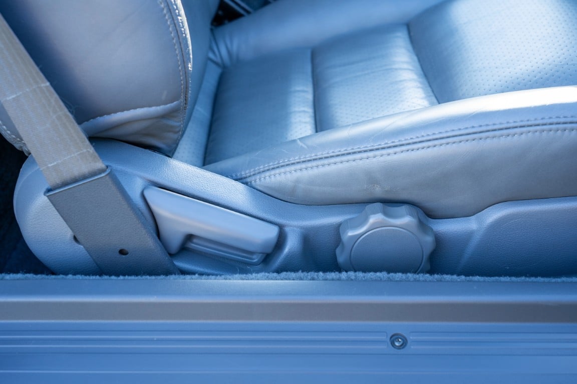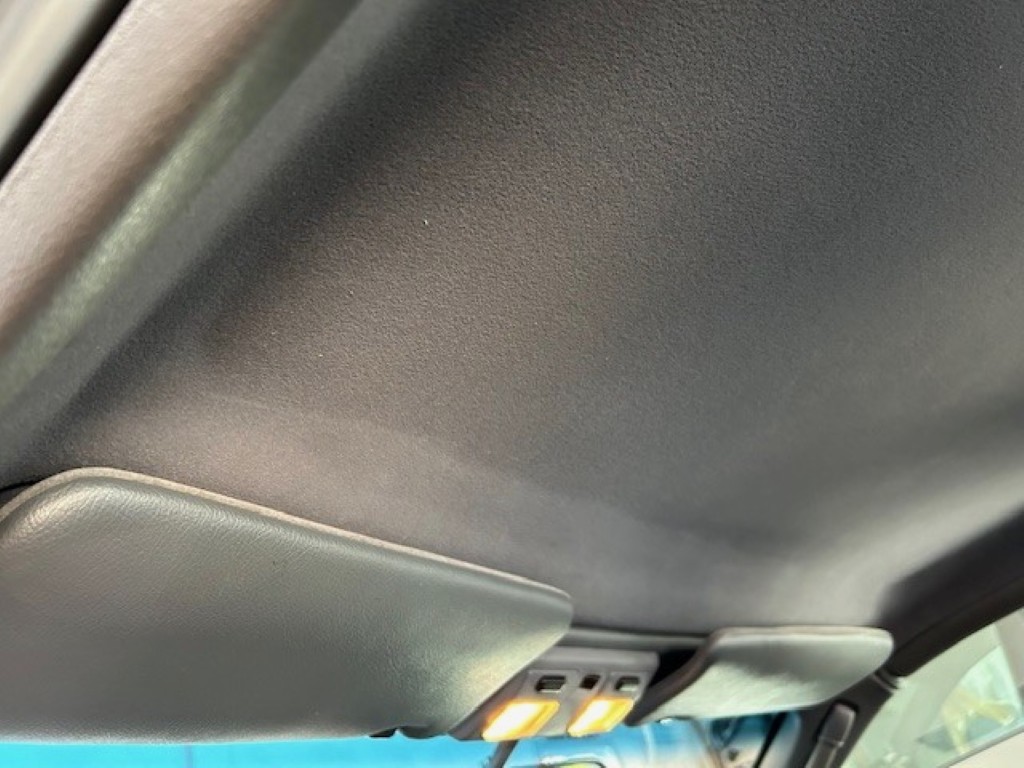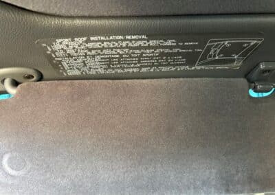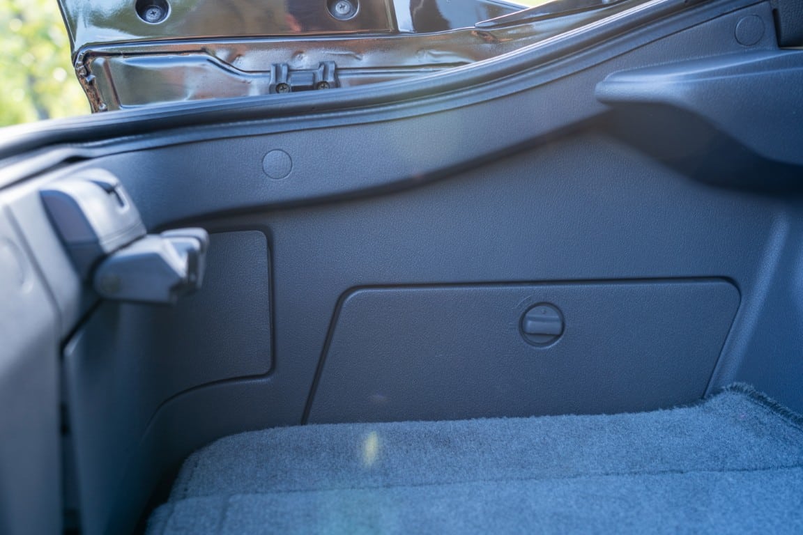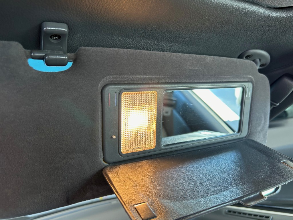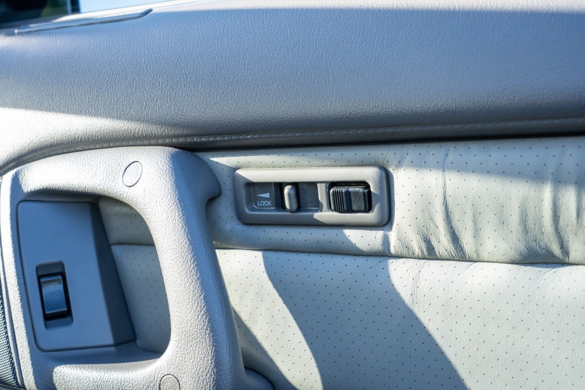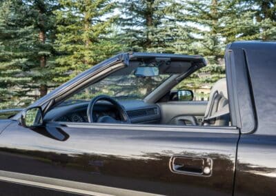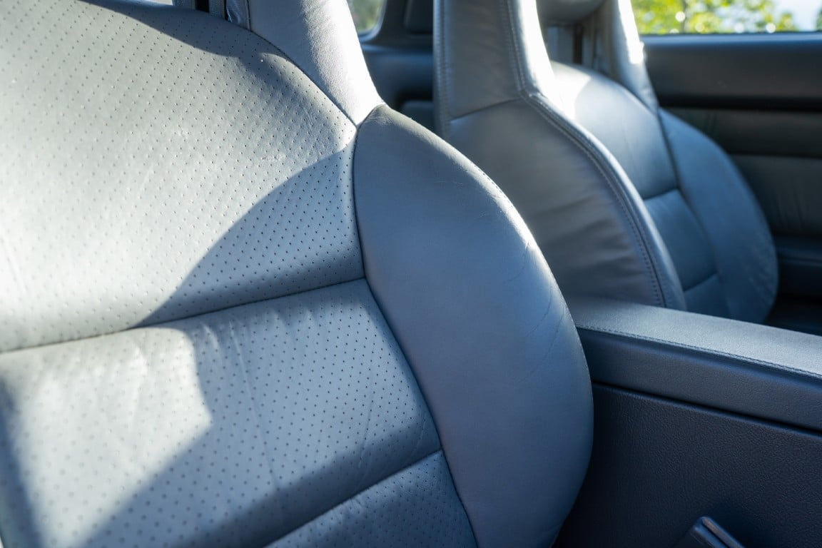 The cabin is upholstered in dark grey leather with matching door cards, centre console, headliner, and carpeting. Interior equipment includes a power-adjustable driver’s seat, automatic climate control with a/c, and a tilt/telescopic-adjustable steering column. Supra-branded floor mats are in place, and the rear cargo area includes factory storage compartments purpose-built for stowage of the removable Sport Roof panel. Additional interior features include a locking glovebox and manually adjustable passenger seat. Some very light wear is noted only on the driver’s side seat bolster, with the lower cushion showing no signs of wear.