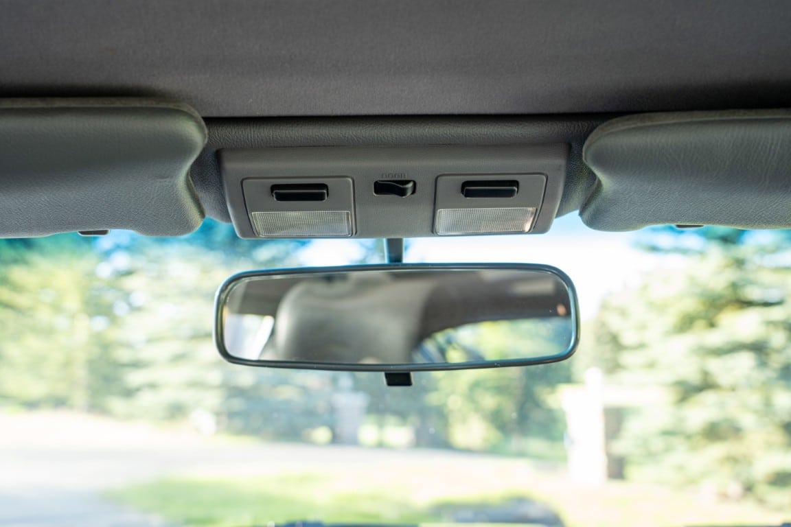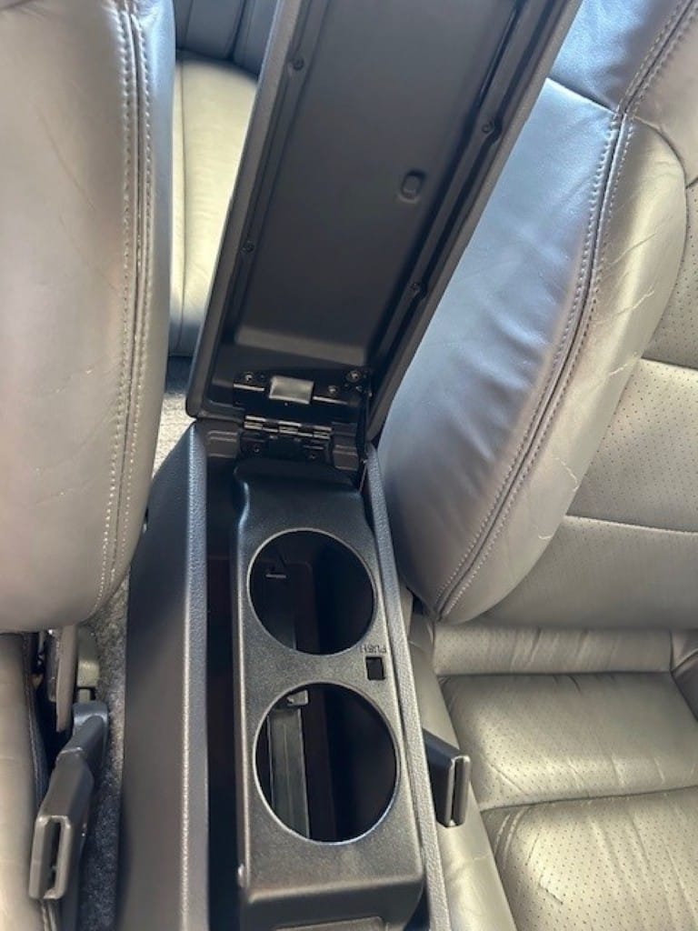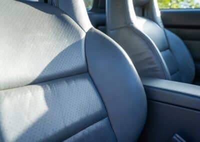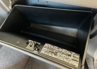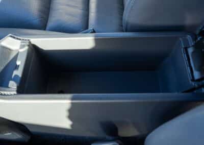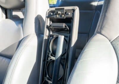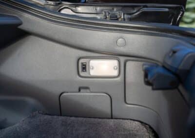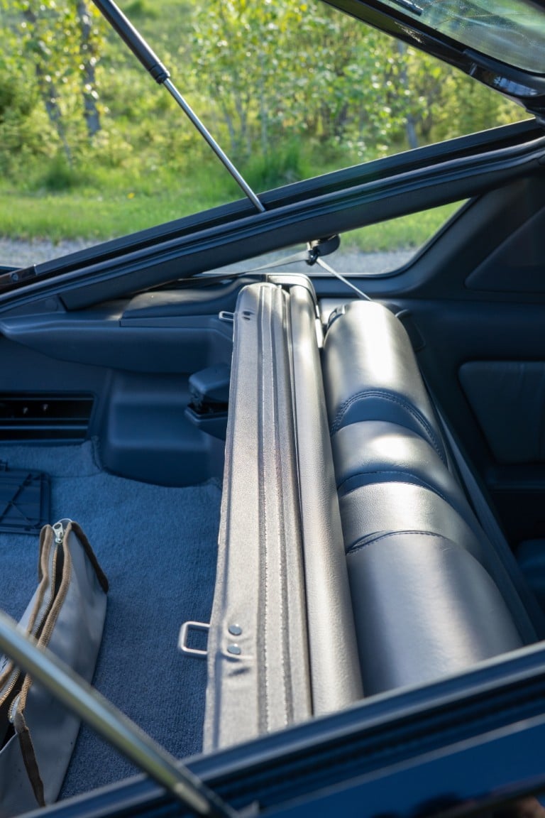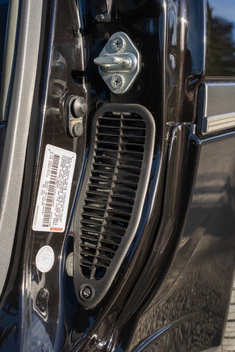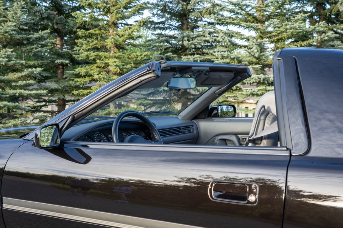 The cabin is upholstered in dark grey leather with matching door cards, centre console, headliner, and carpeting. Interior equipment includes a power-adjustable driver’s seat, automatic climate control with a/c, and a tilt/telescopic-adjustable steering column. Supra-branded floor mats are in place, and the rear cargo area includes factory storage compartments purpose-built for stowage of the removable Sport Roof panel. Additional interior features include a locking glovebox and manually adjustable passenger seat. Some very light wear is noted only on the driver’s side seat bolster, with the lower cushion showing no signs of wear.