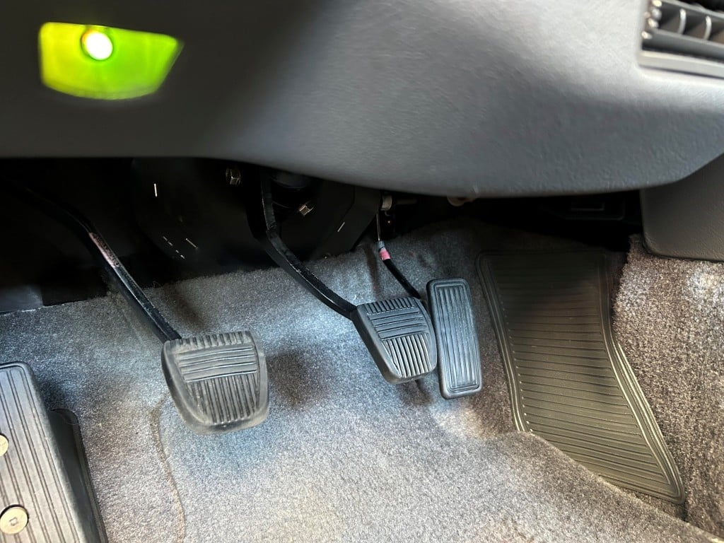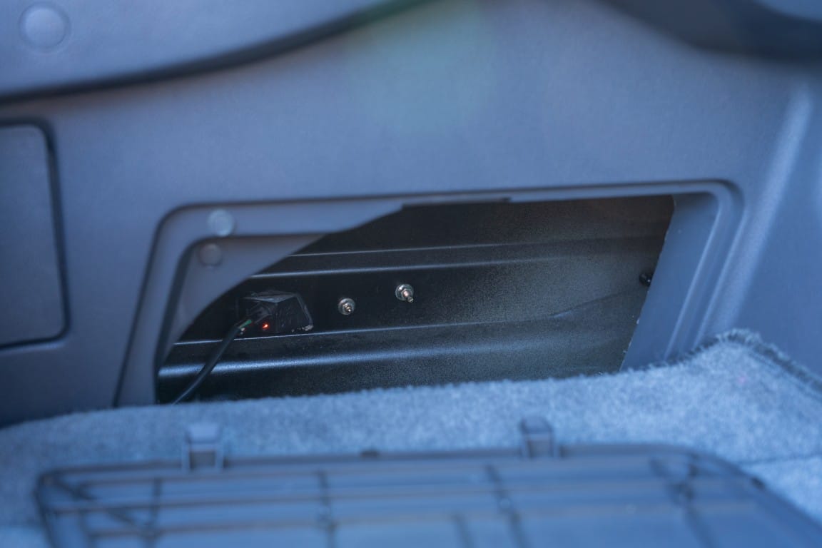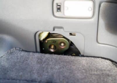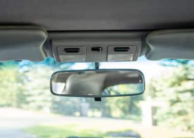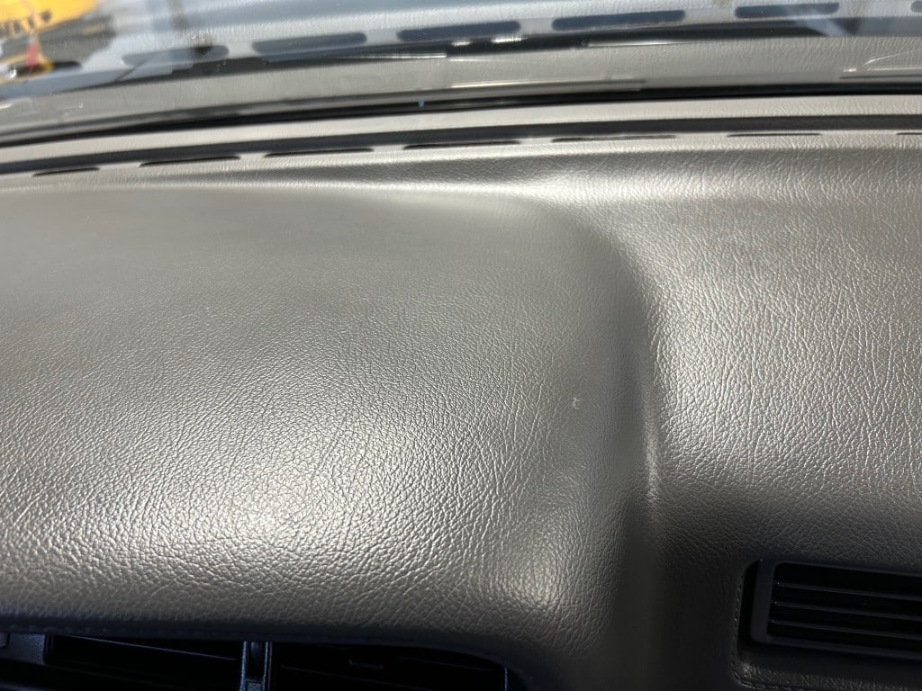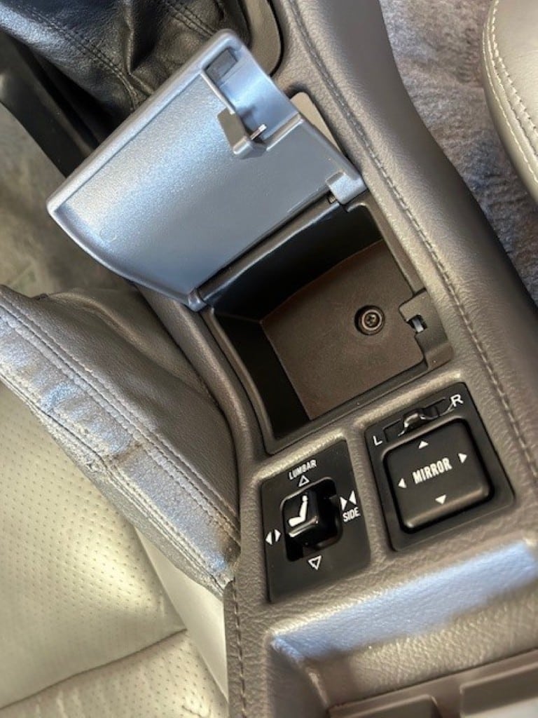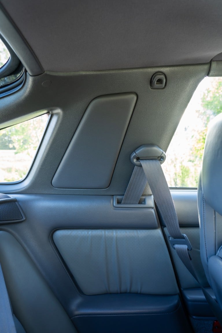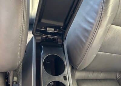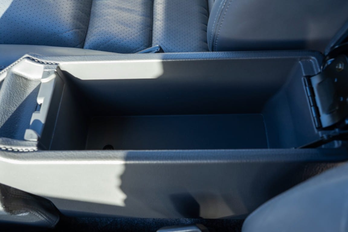 The cabin is upholstered in dark grey leather with matching door cards, centre console, headliner, and carpeting. Interior equipment includes a power-adjustable driver’s seat, automatic climate control with a/c, and a tilt/telescopic-adjustable steering column. Supra-branded floor mats are in place, and the rear cargo area includes factory storage compartments purpose-built for stowage of the removable Sport Roof panel. Additional interior features include a locking glovebox and manually adjustable passenger seat. Some very light wear is noted only on the driver’s side seat bolster, with the lower cushion showing no signs of wear.